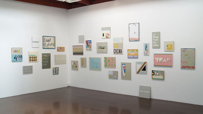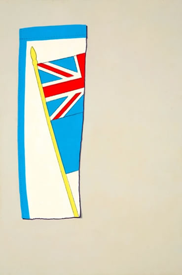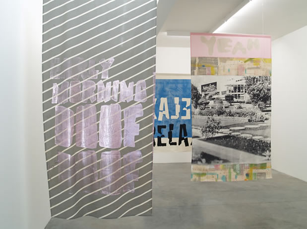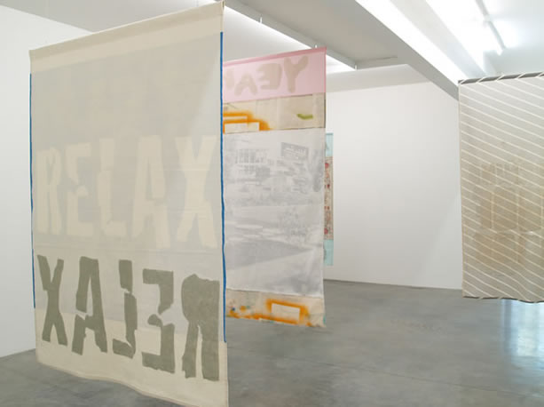 (installation view) screenprint on cotton banner, hand stitched patches unique state