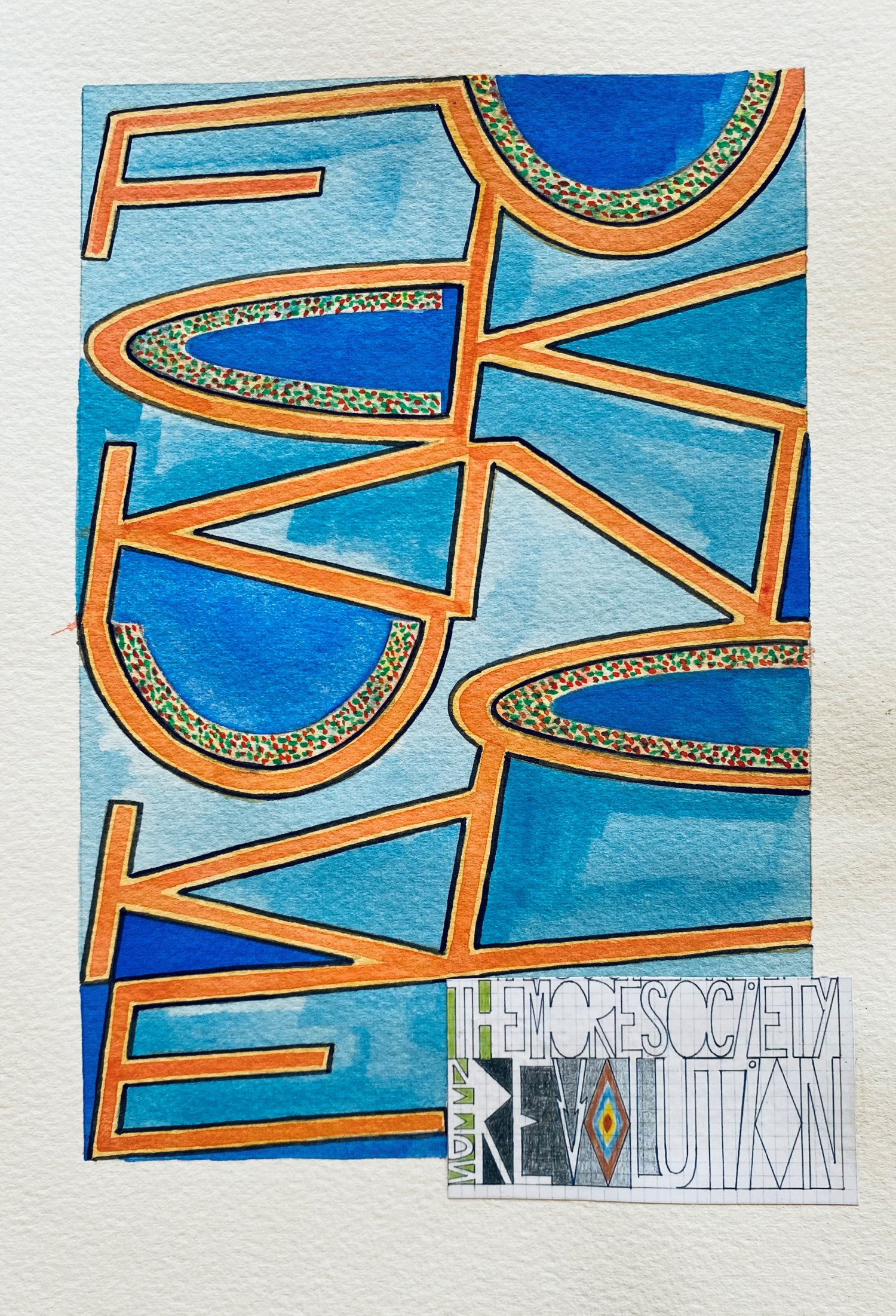 ink, coloured pencil, watercolour, inkjet print, acrylic paint