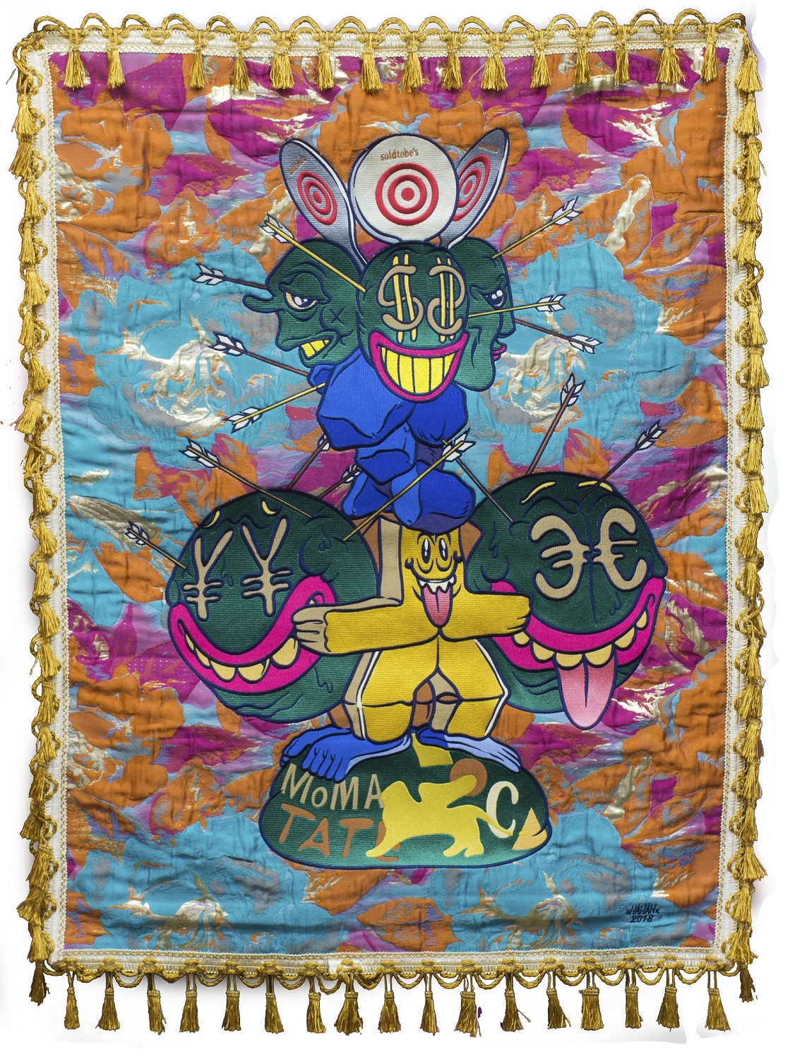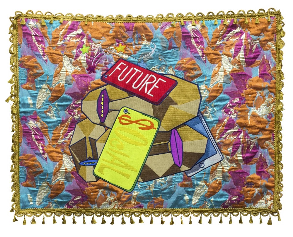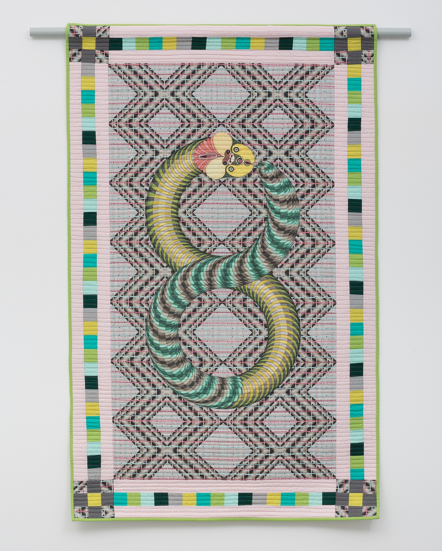 quilt made from digital print on cotton with pieced fabric border, assorted textiles, thread