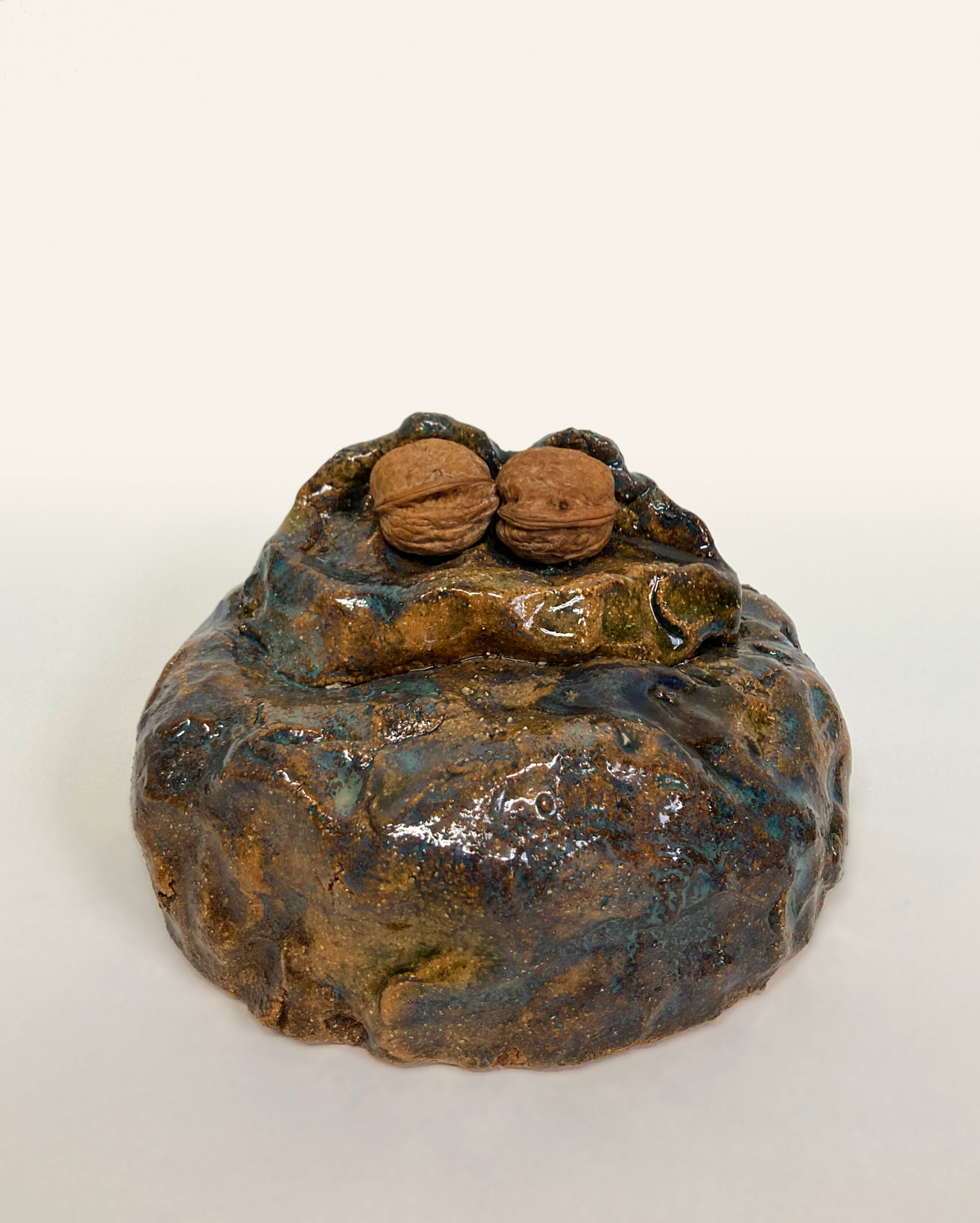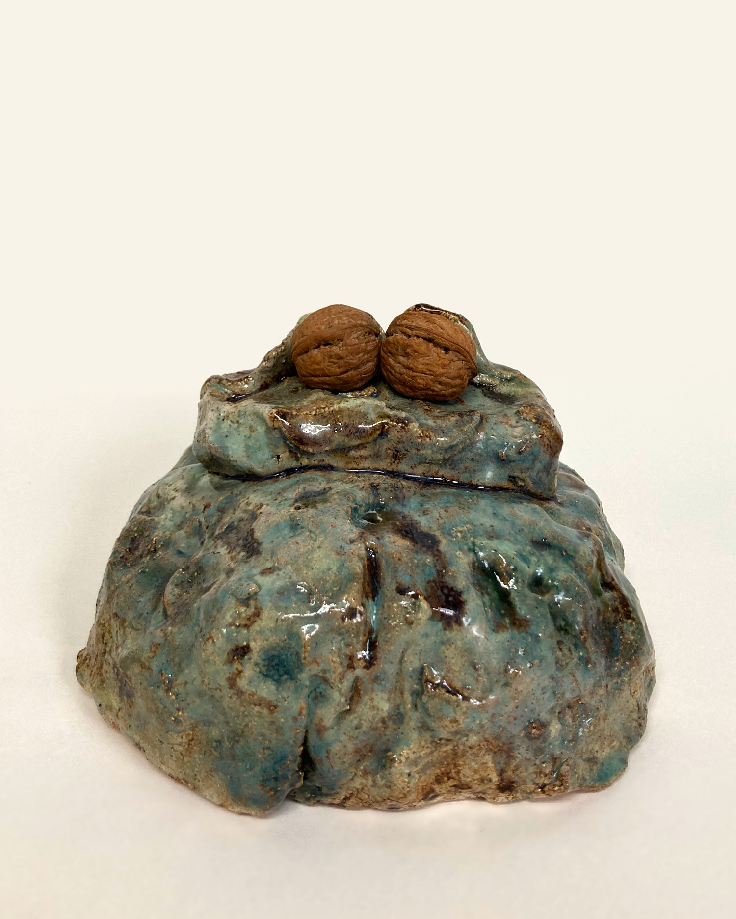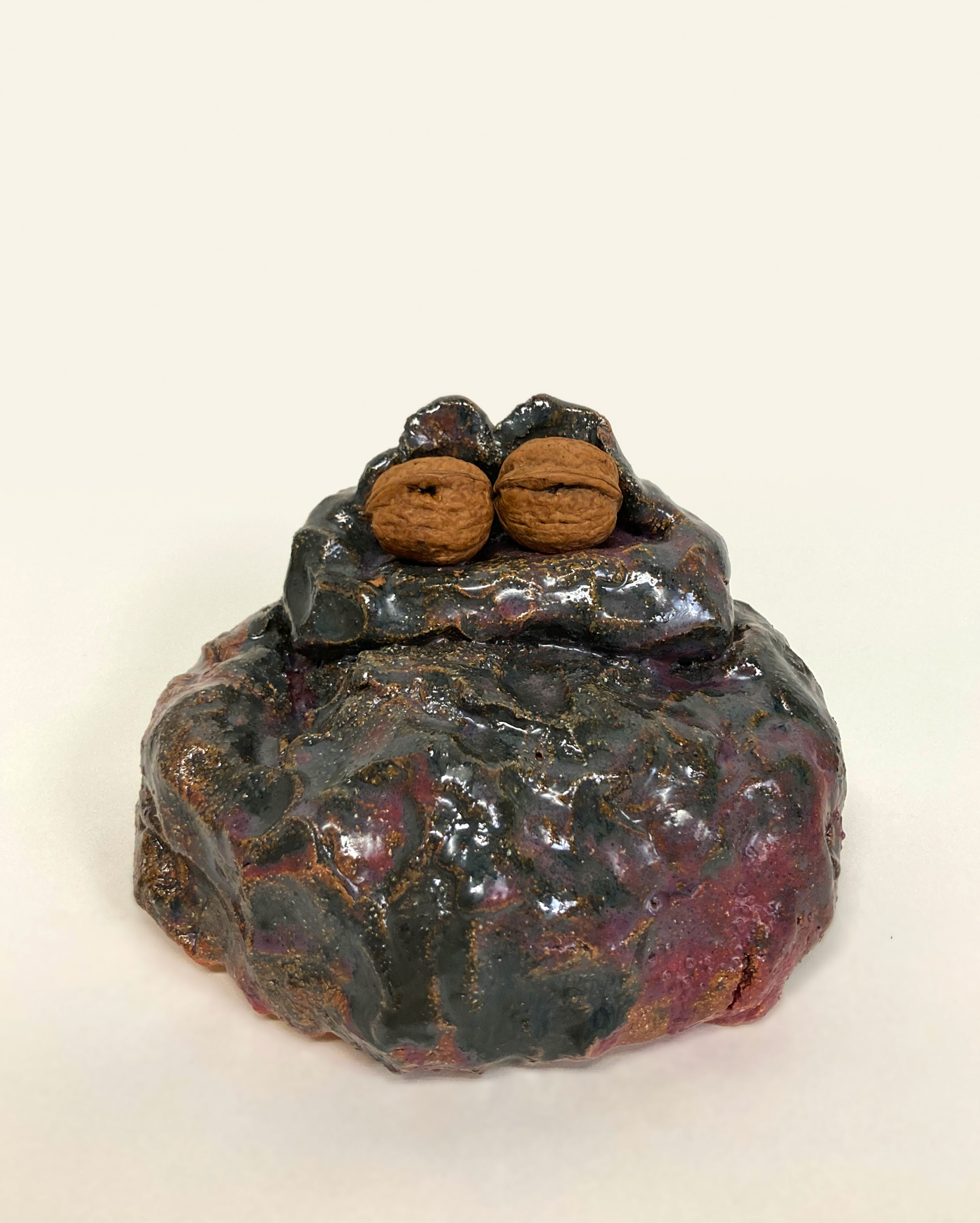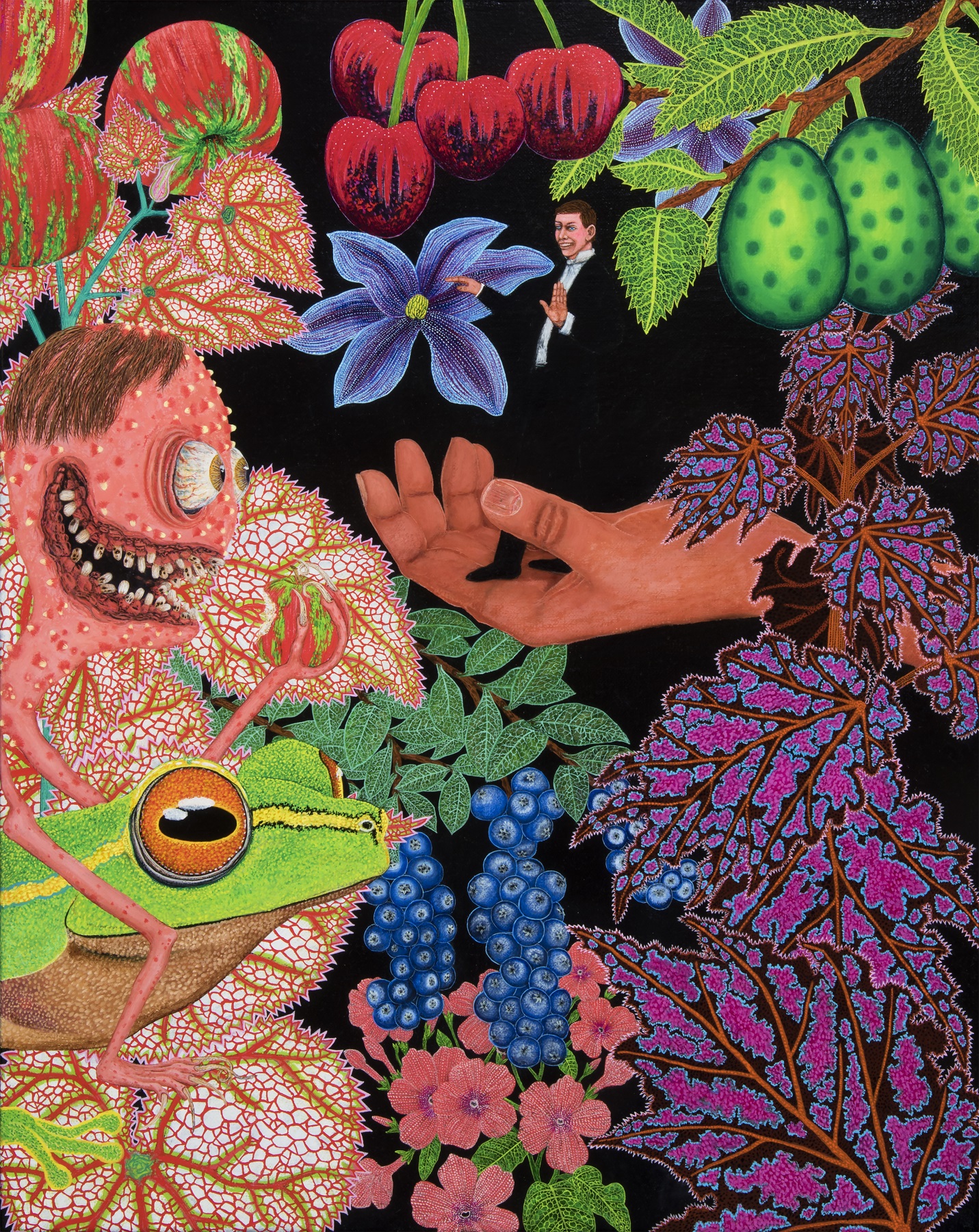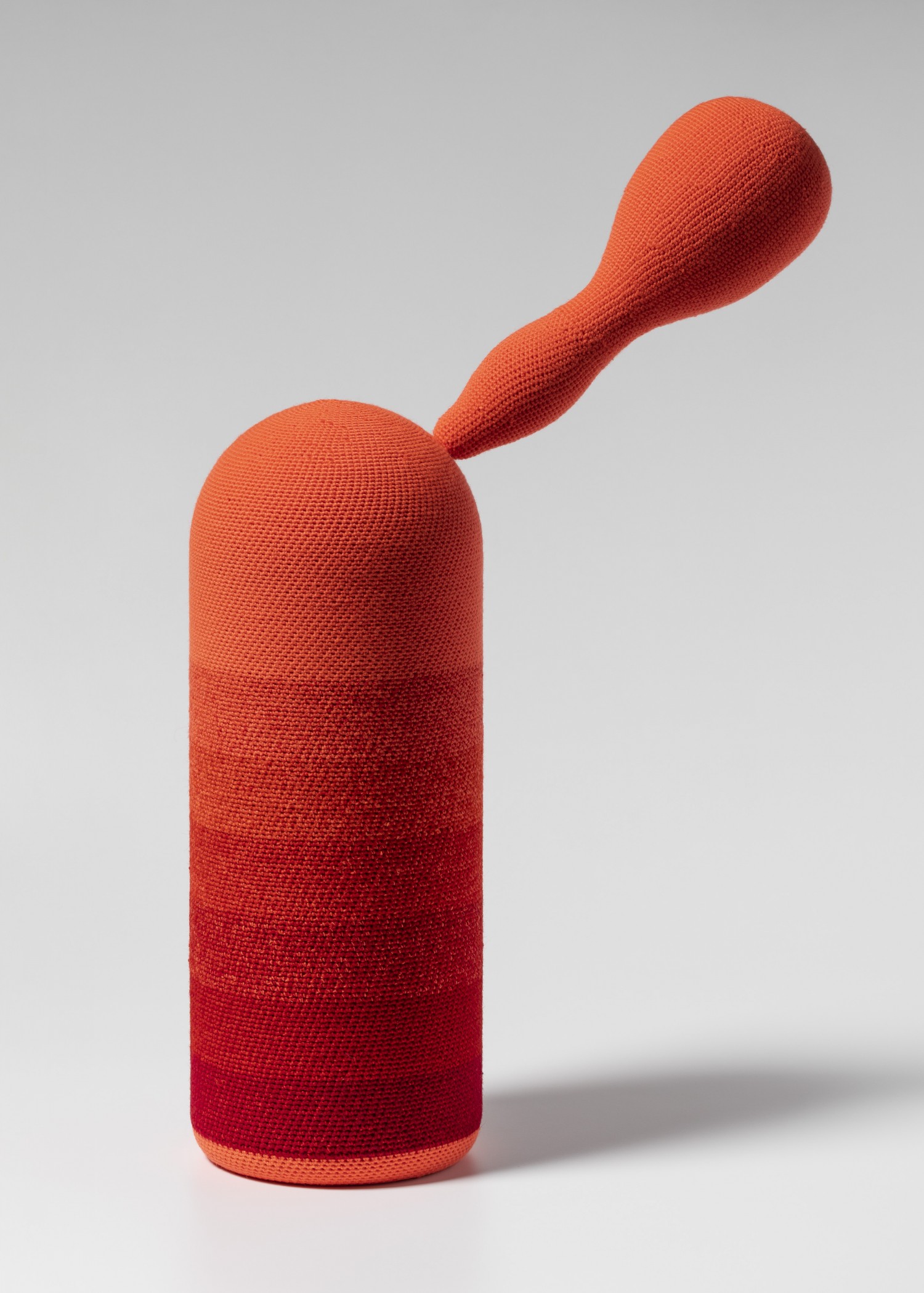 hand-crocheted wool and strands of human hair over gourd, wood, synthetic polymer emulsion