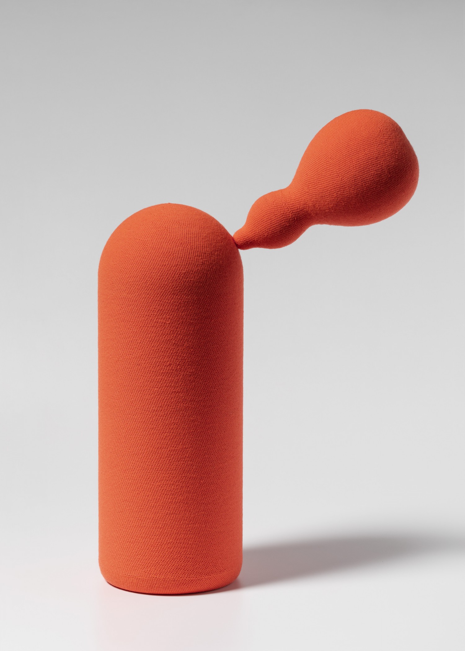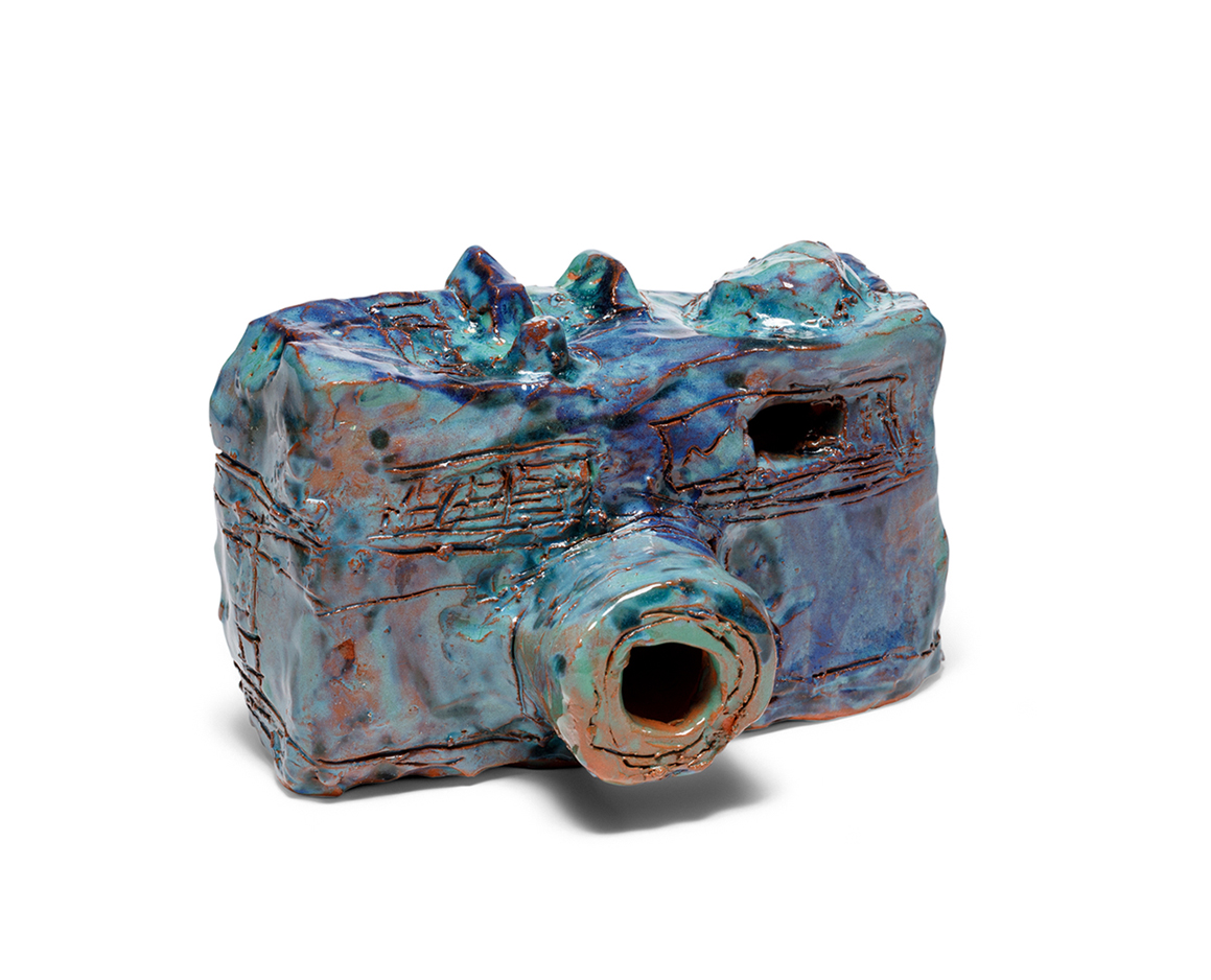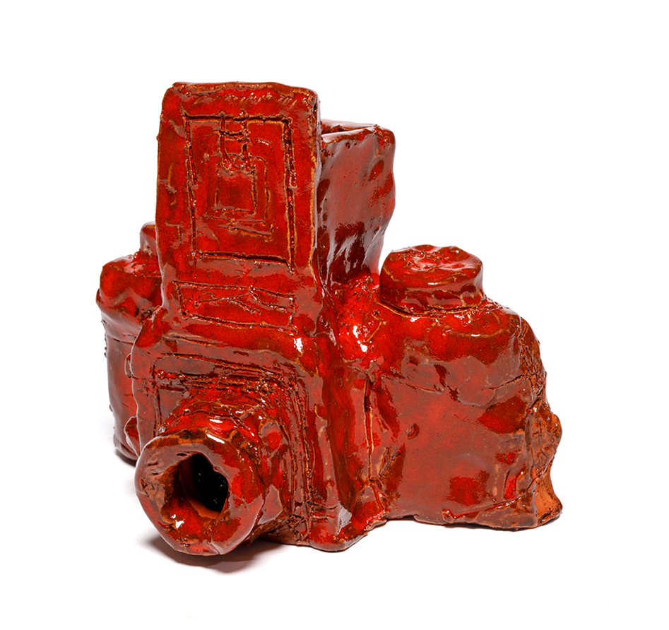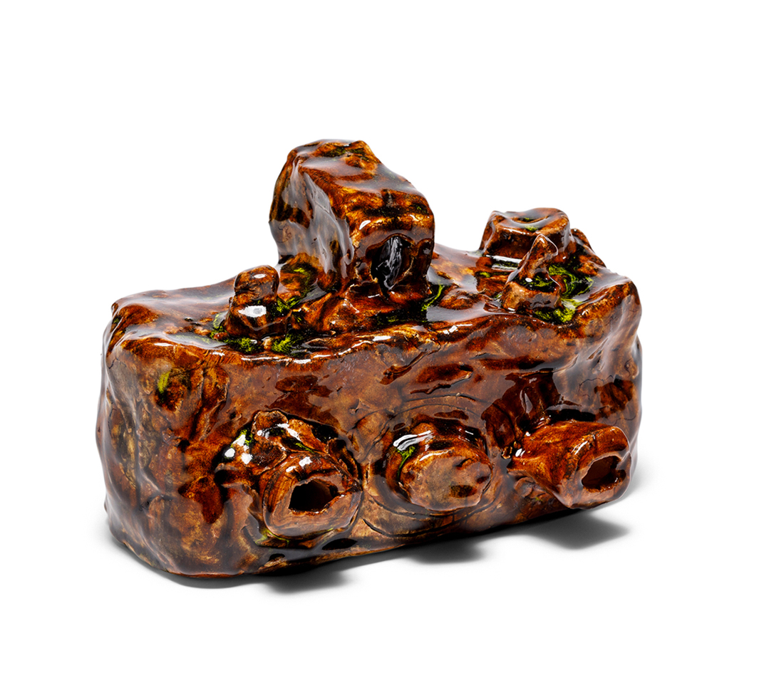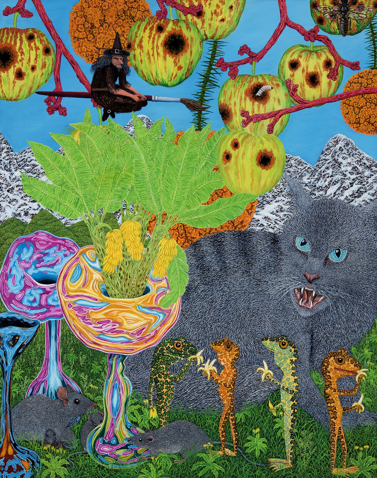 hand-crocheted wool and strands of human hair over gourd, wood, synthetic polymer emulsion