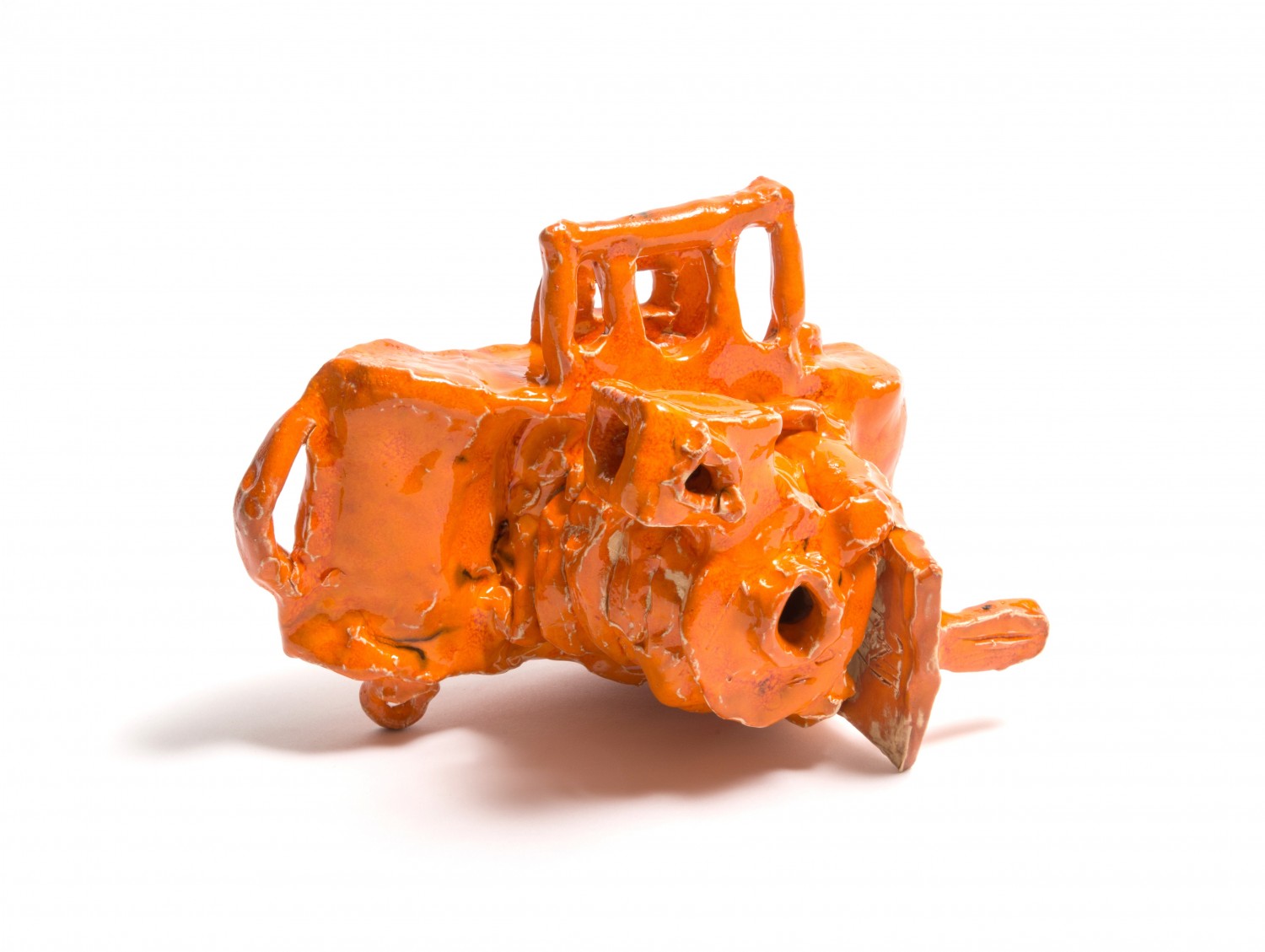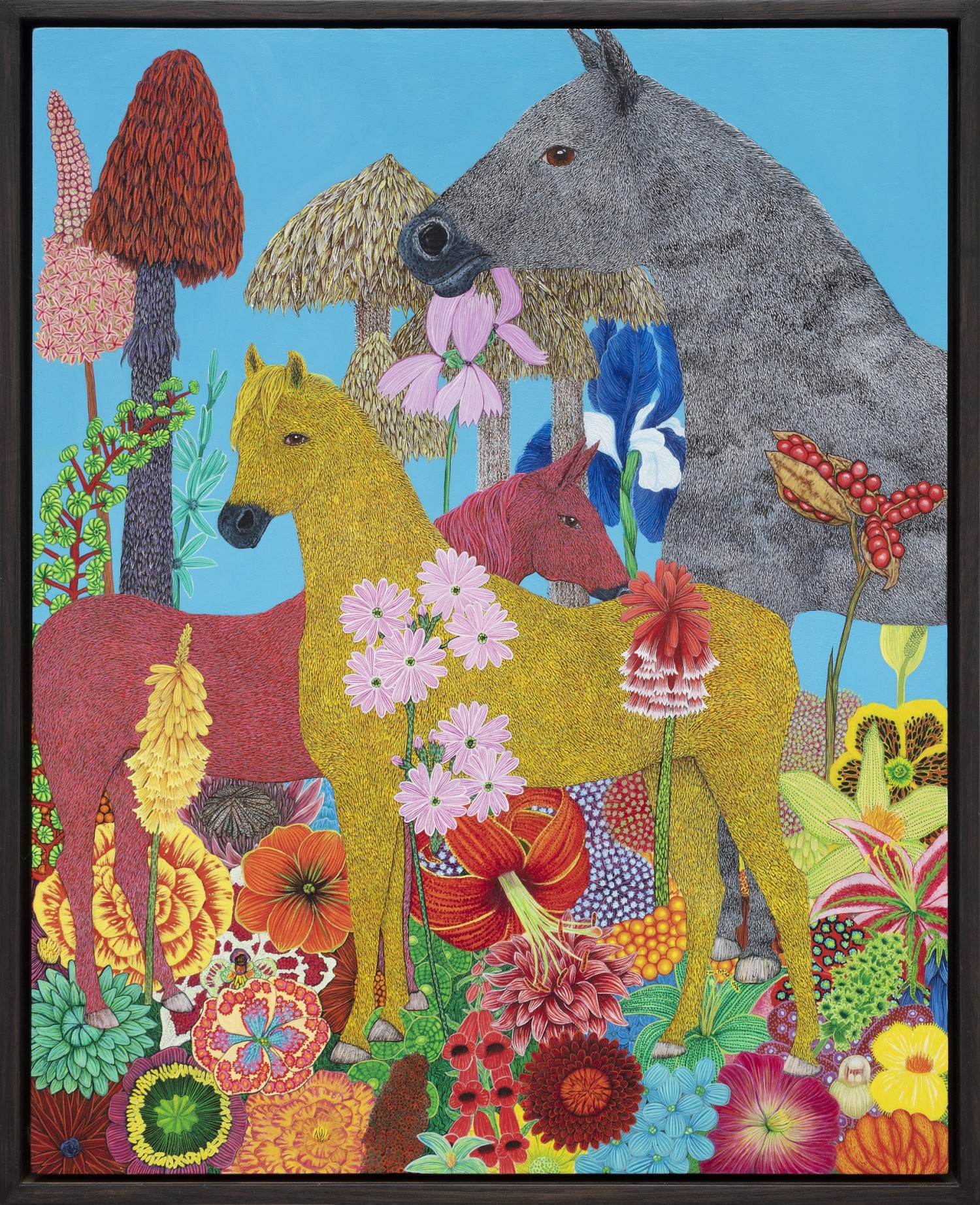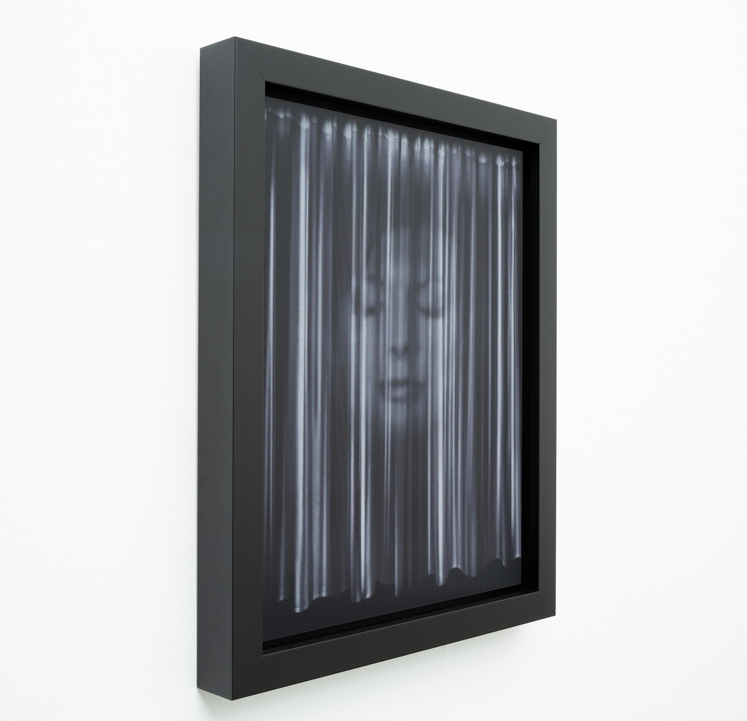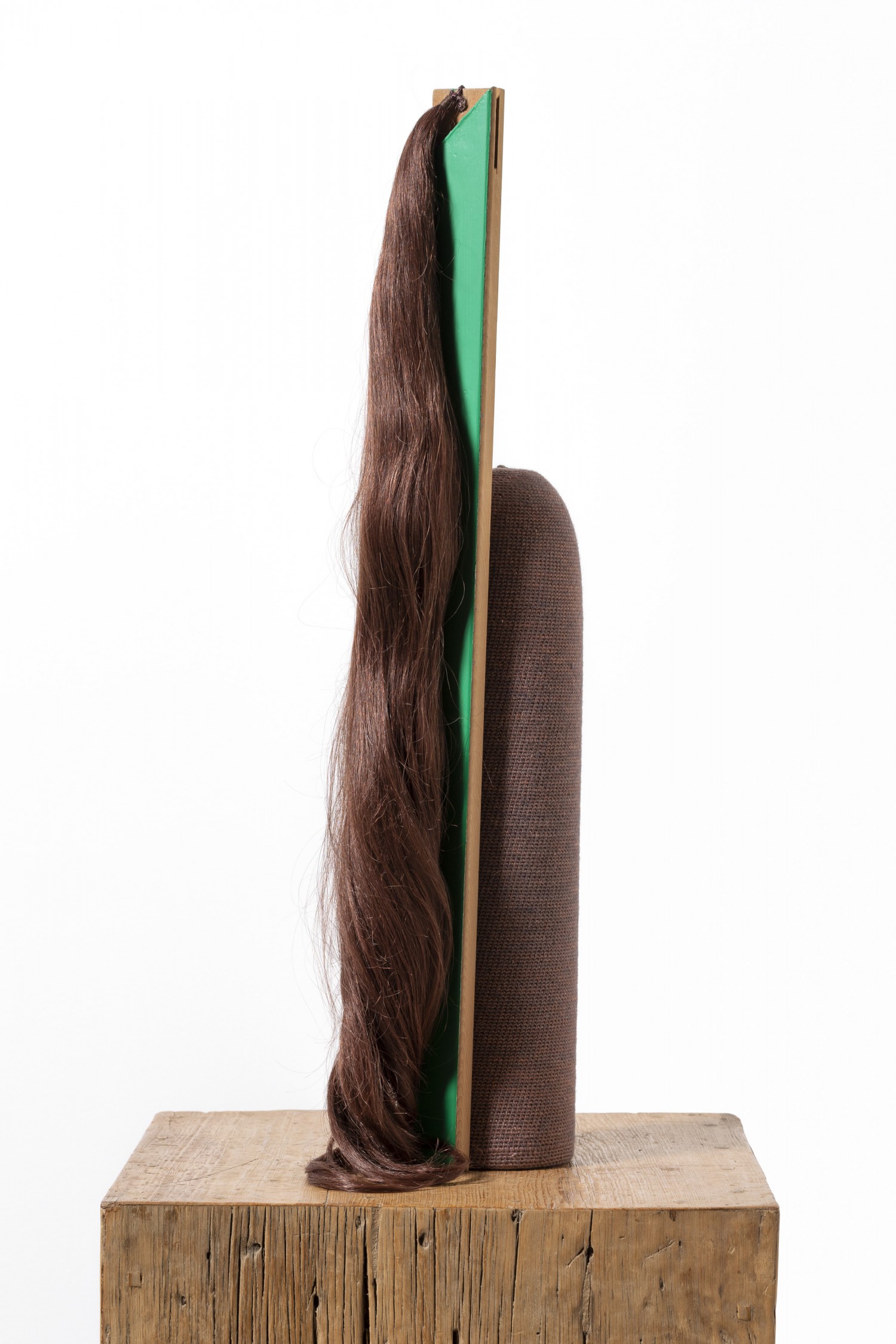 hand crocheted silk, alpaca, cashmere and camel hair over wood, human hair, synthetic polymer emulsion.