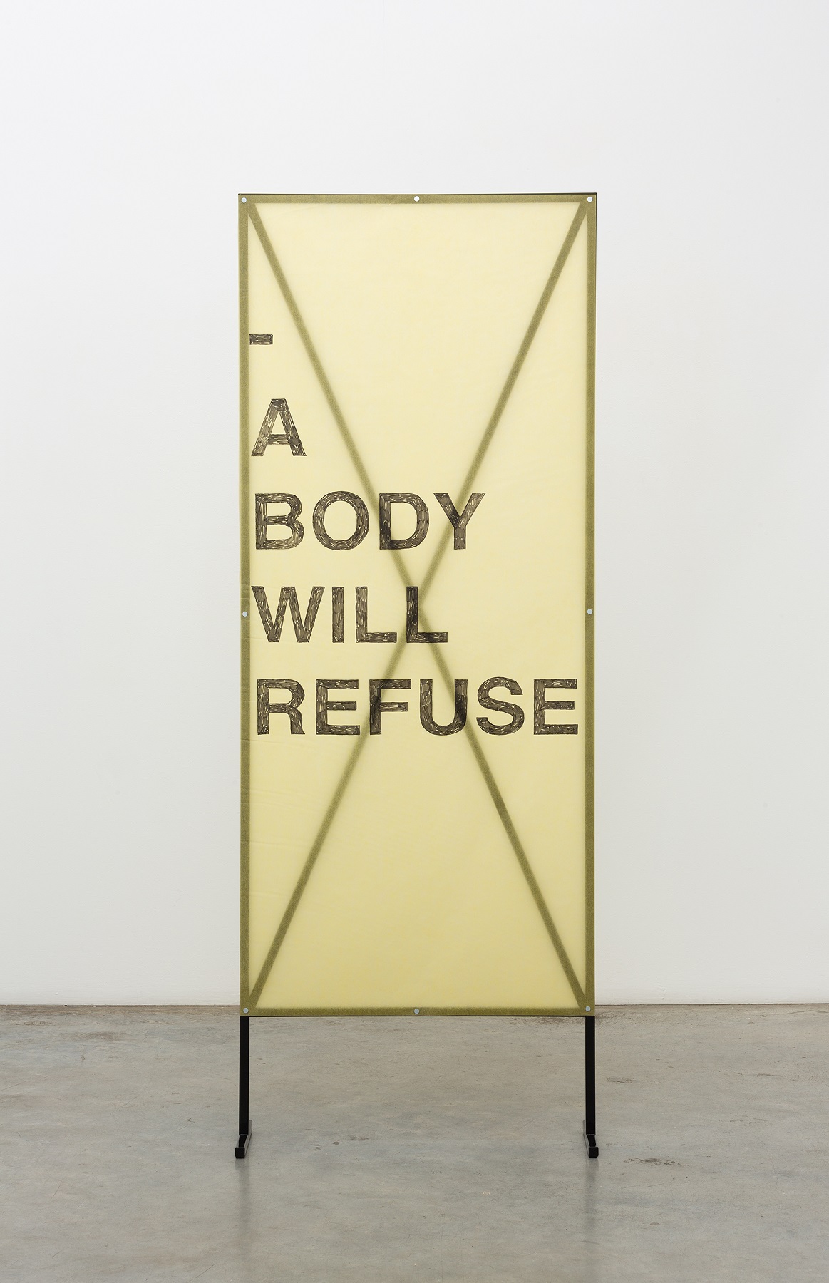 powdercoated steel with accumulated texts on paper