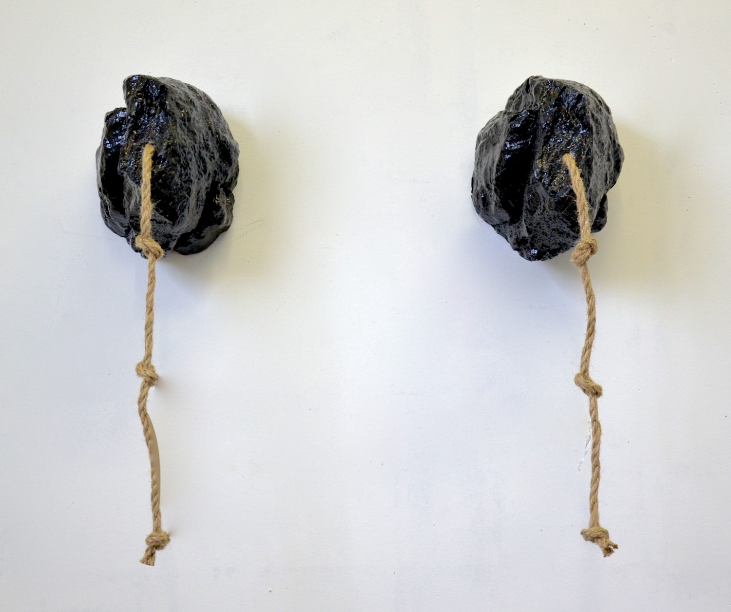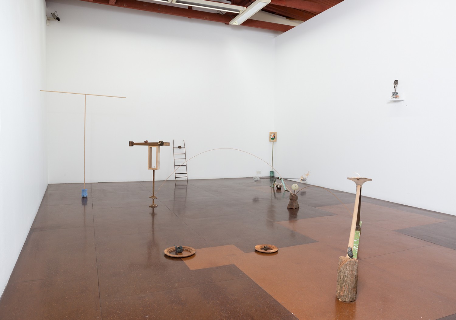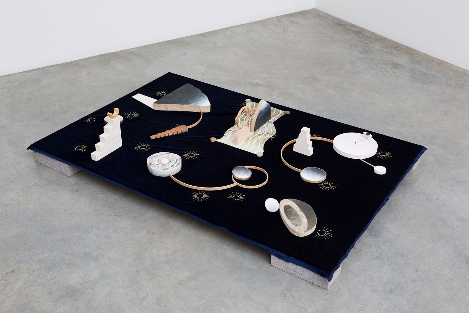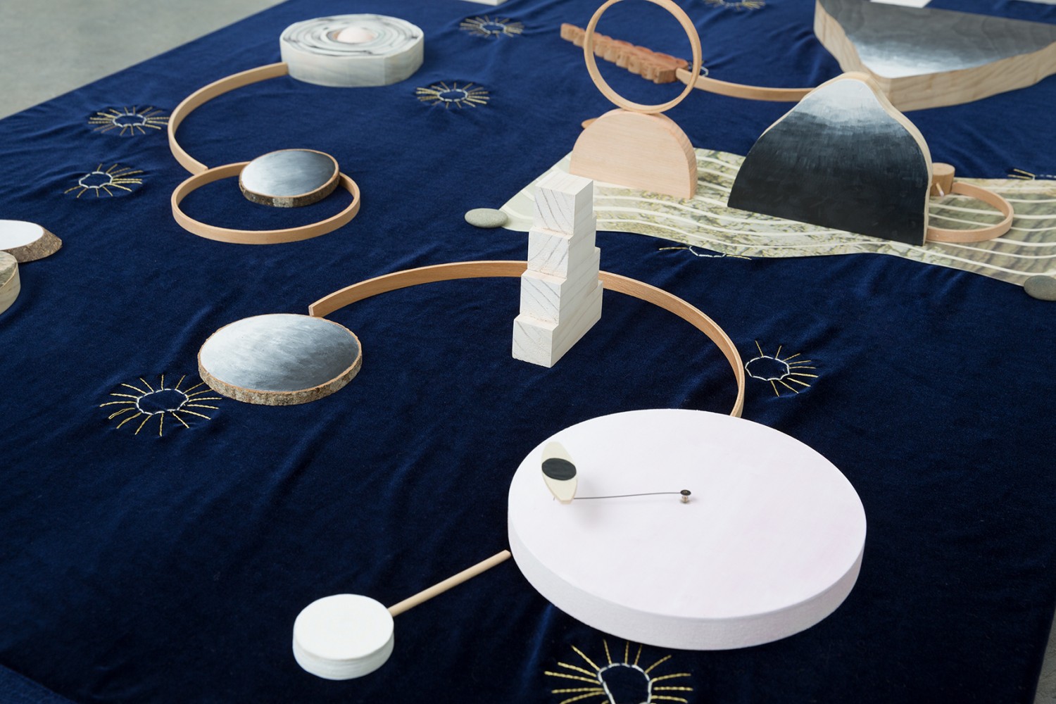 embroidery on velvet, plywood, red cedar, beech, pine, acrylic paint, ink on paper, collage, cement, rock, clock mechanism, ping pong ball