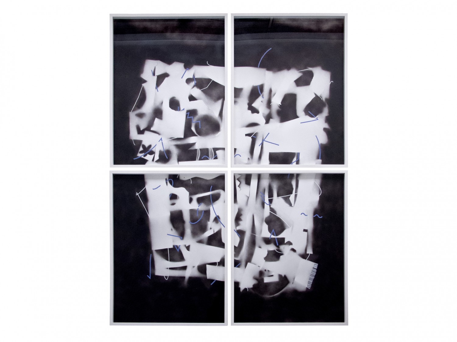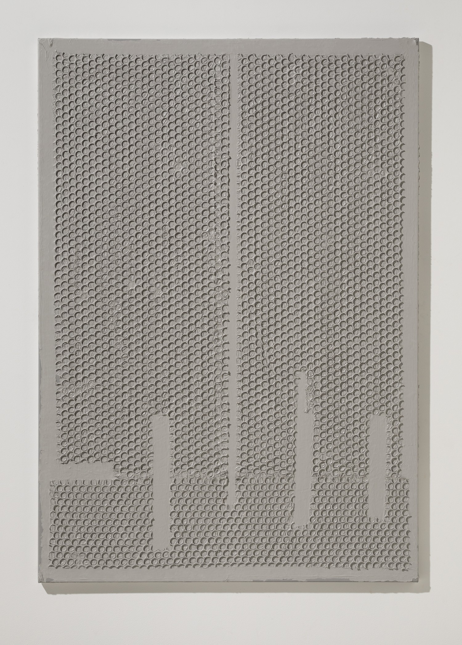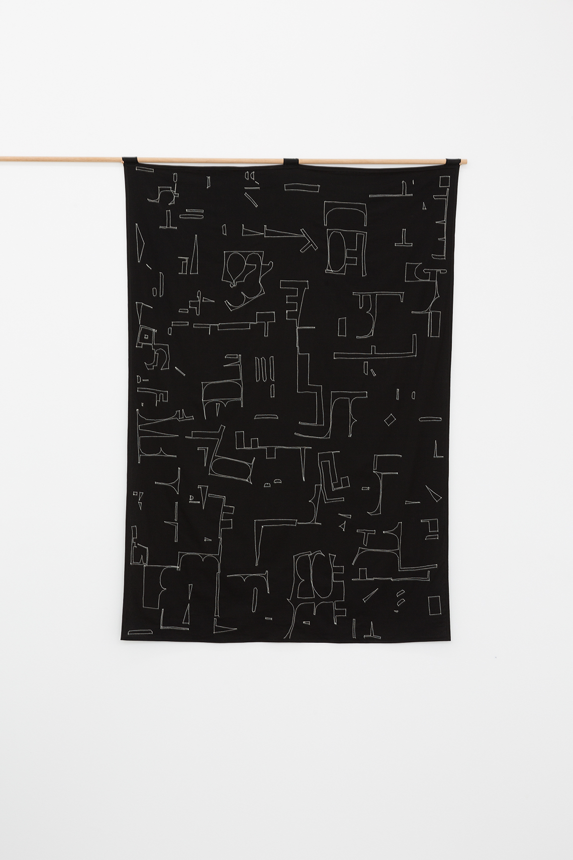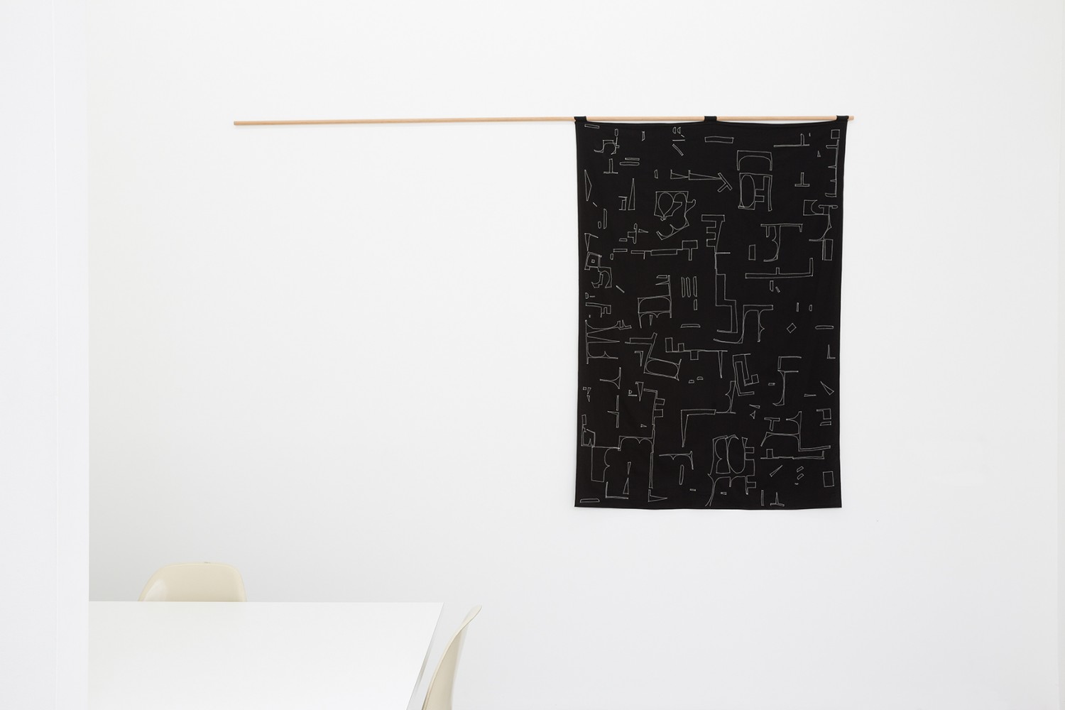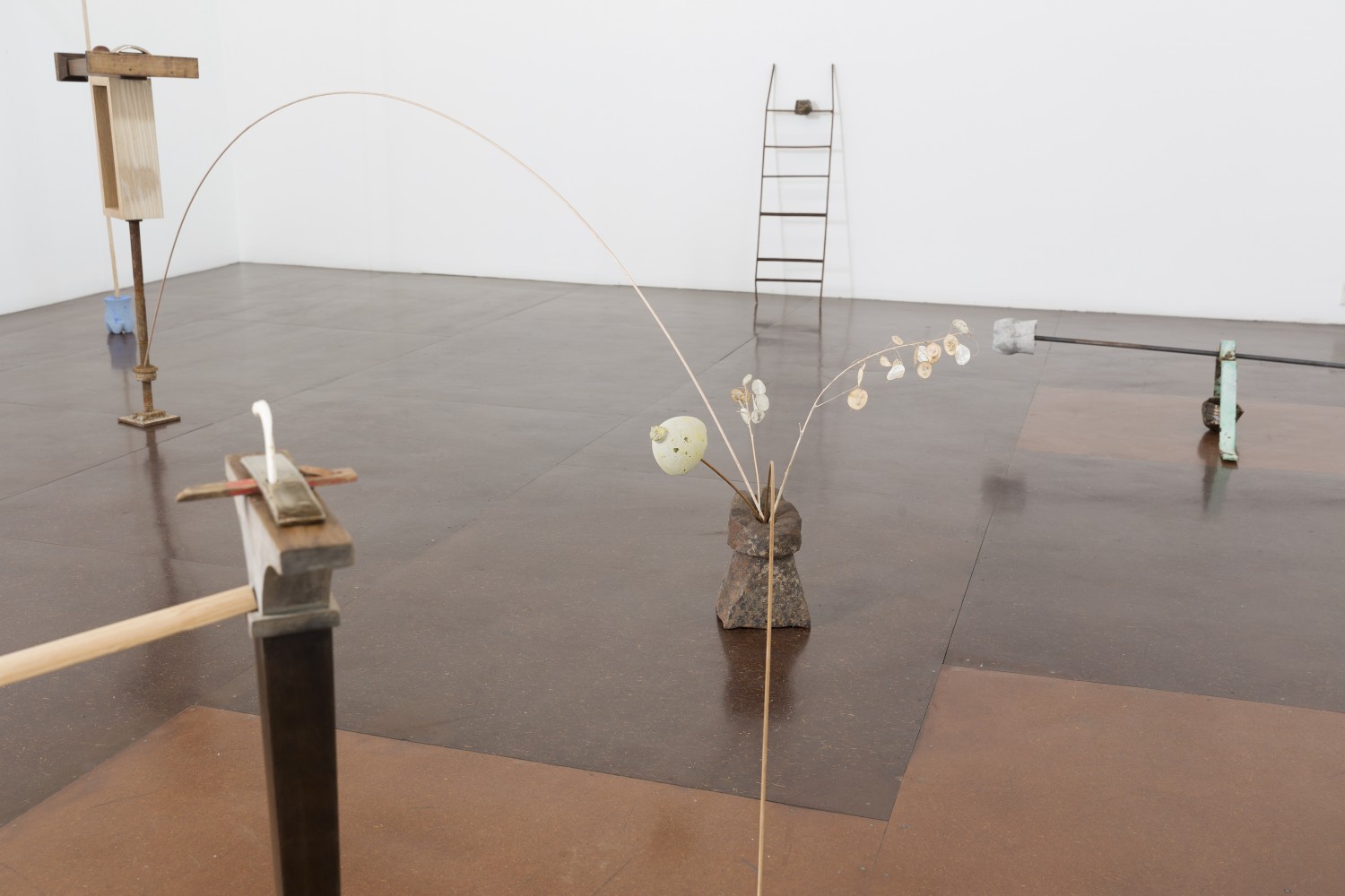 embroidery on velvet, plywood, red cedar, beech, pine, acrylic paint, ink on paper, collage, cement, rock, clock mechanism, ping pong ball
