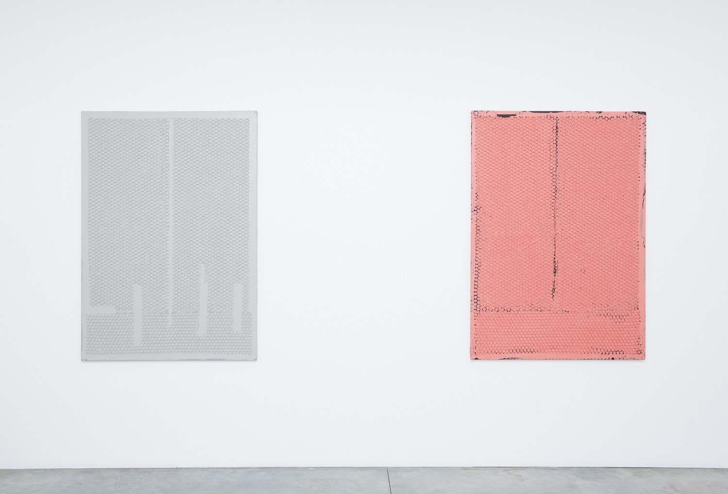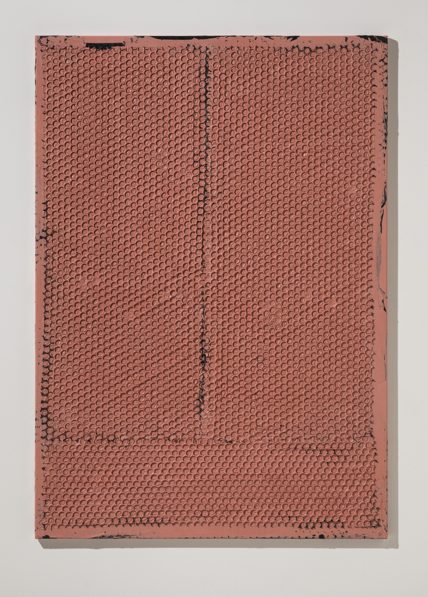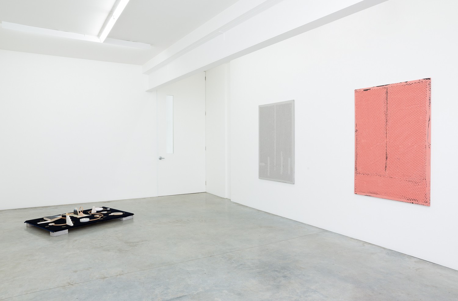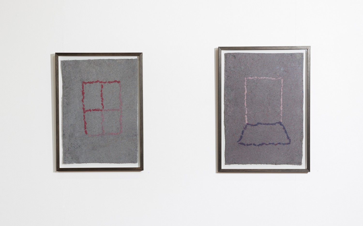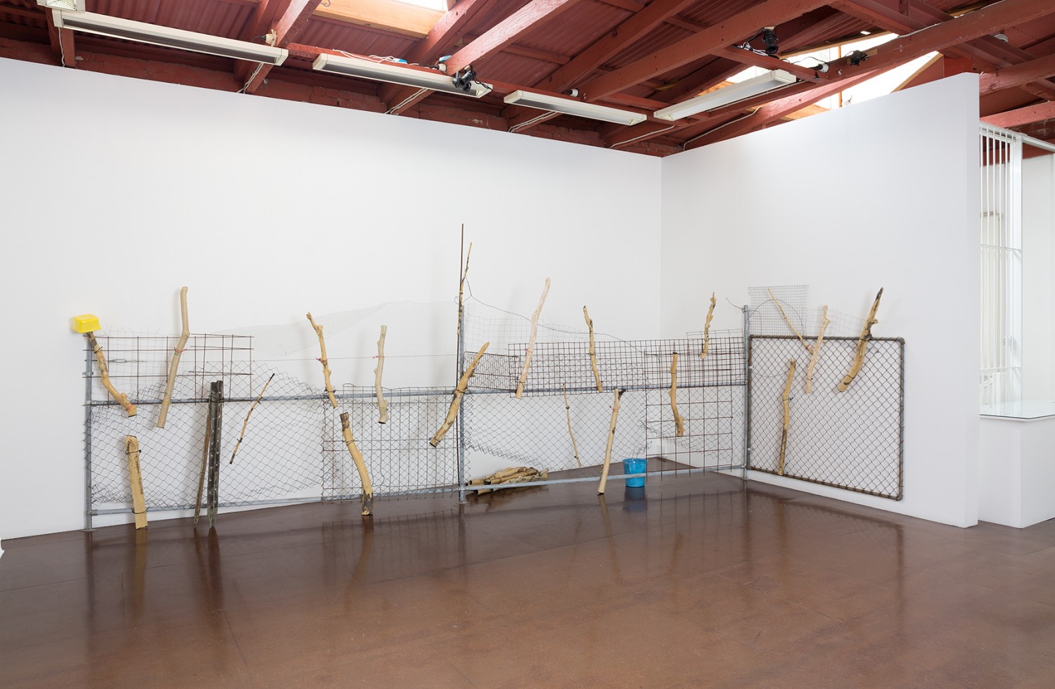 Quartz bearing iron stained rock fragments and secondary banded clay, mixed, sieved and kiln fired - harvested from Fryerstown area, Central Victoria Paint, plywood, pine, eucalyptus branches