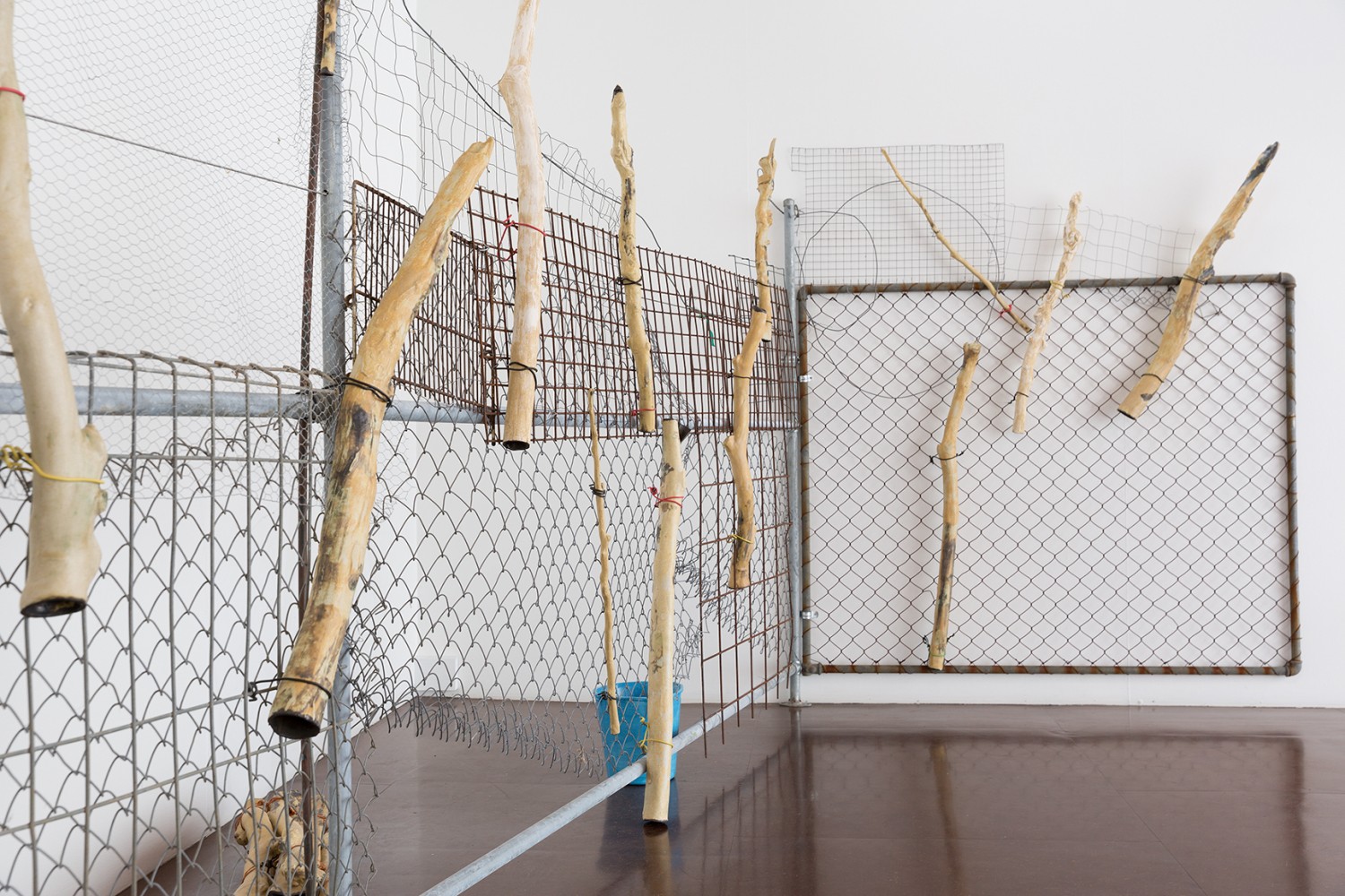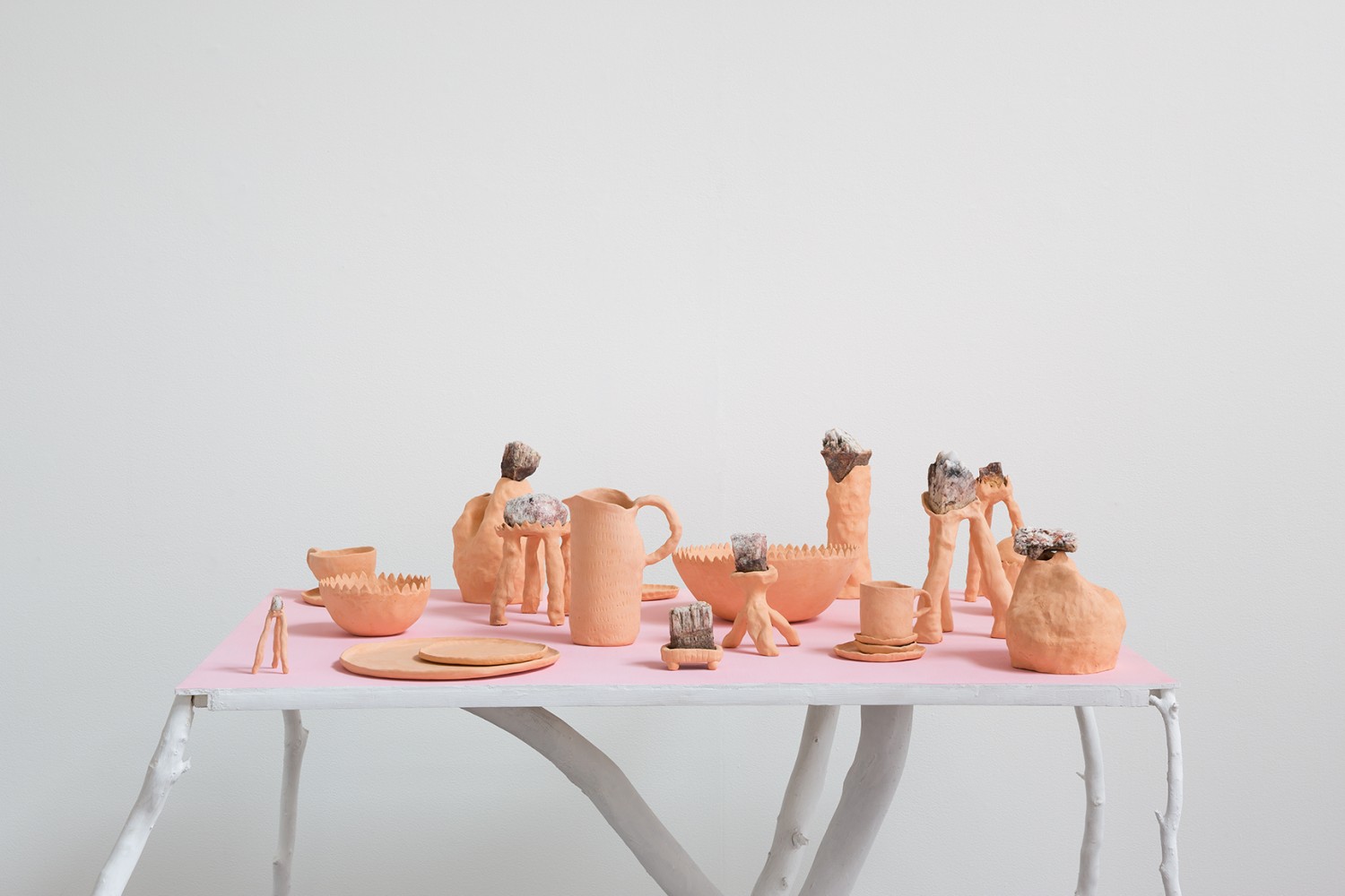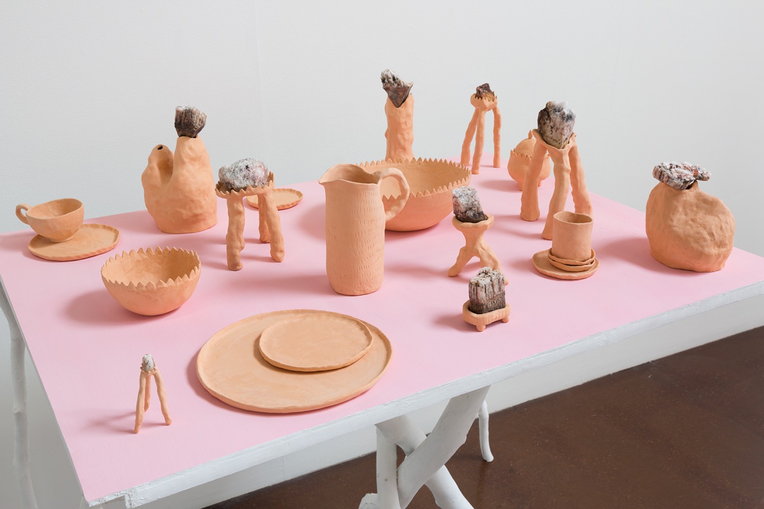 branches: mid-fire slip with Hermannsburg wood ash glaze (River Red Gum, Mulga, Palm Tree), nepheline syenite and ball clay; buckets: earthenware slip with arctic blue underglaze and clear gloss glaze; ice cream containers: earthenware slip with yellow