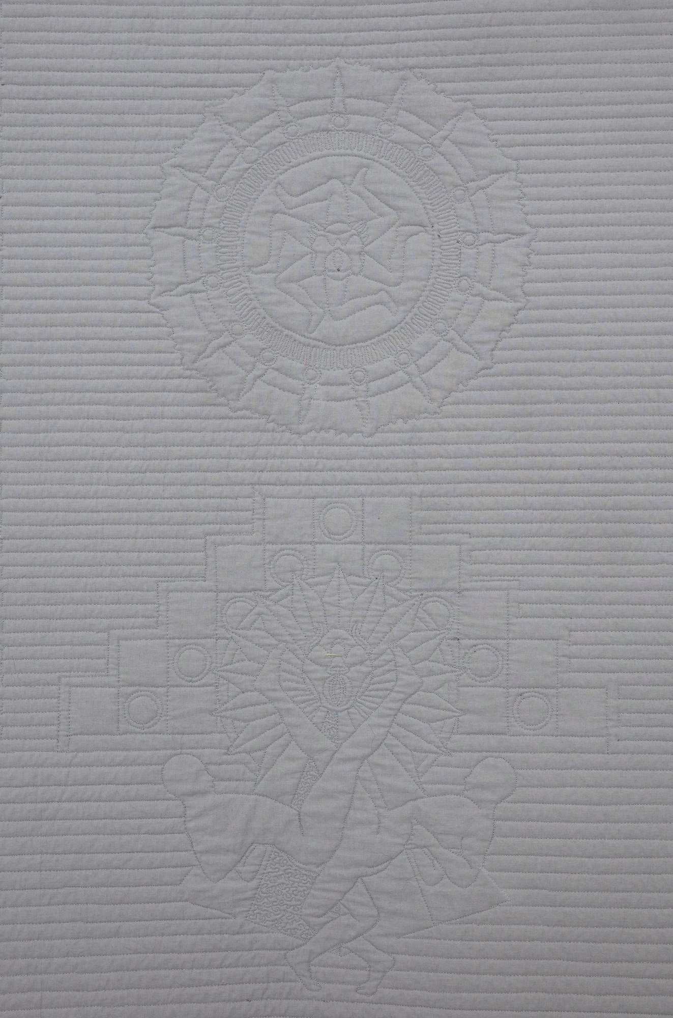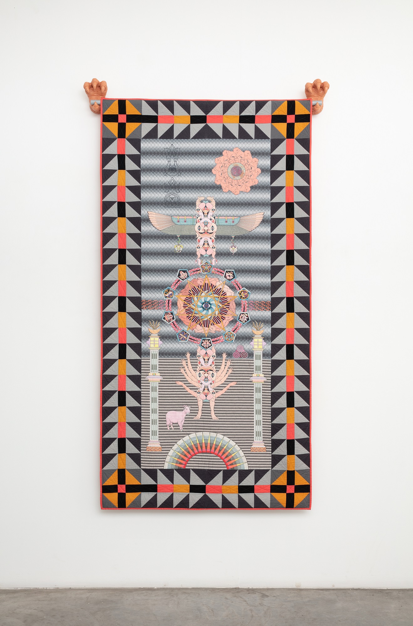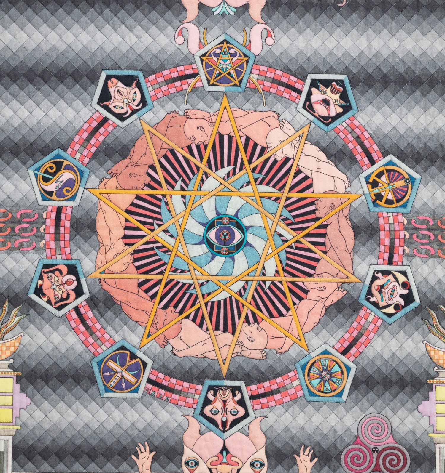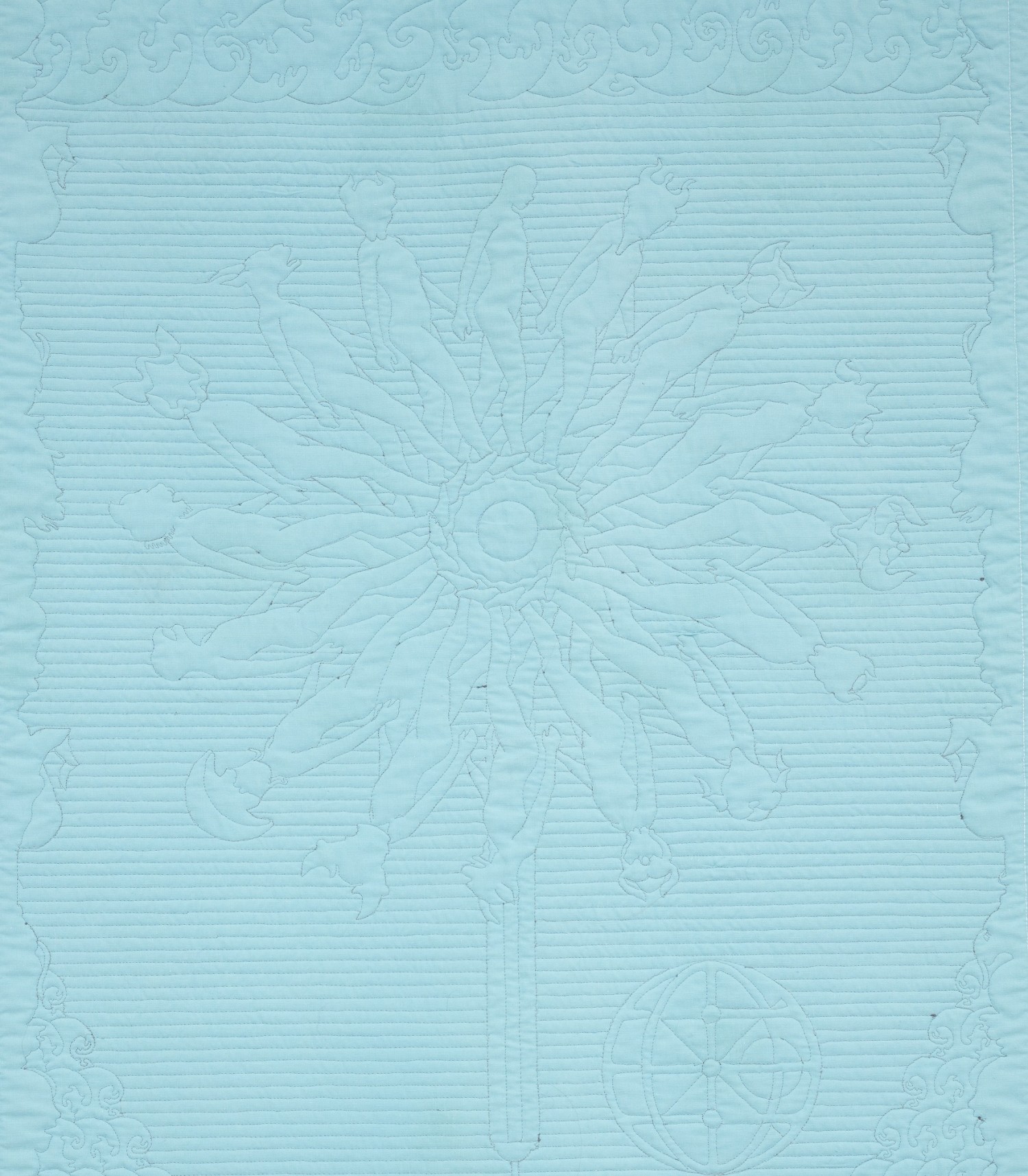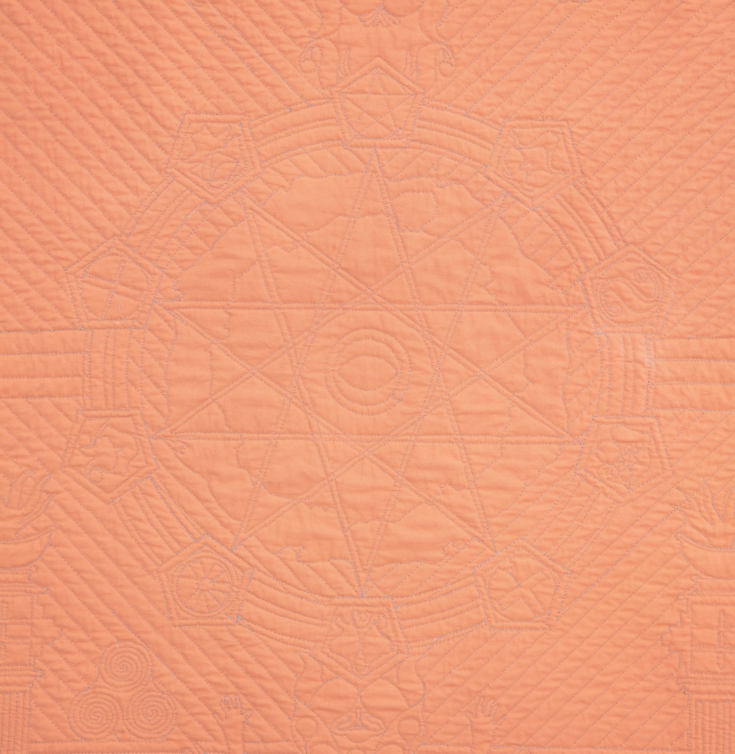 quilt made from digital print on cotton with pieced fabric border, assorted textiles, thread