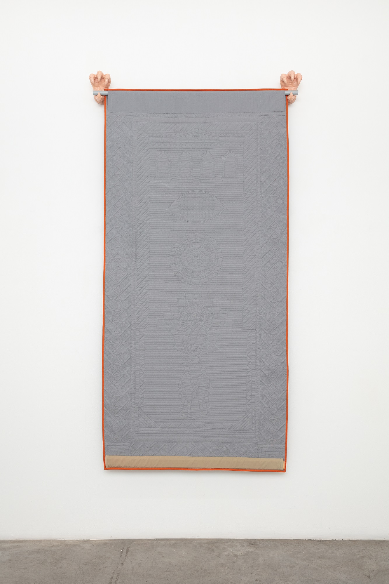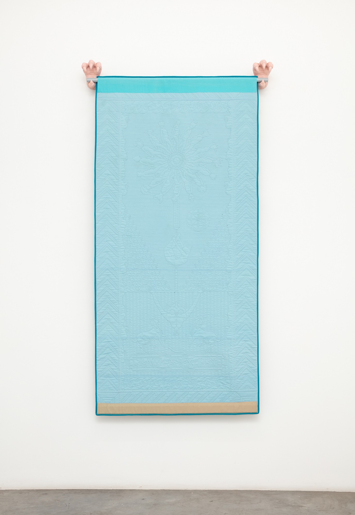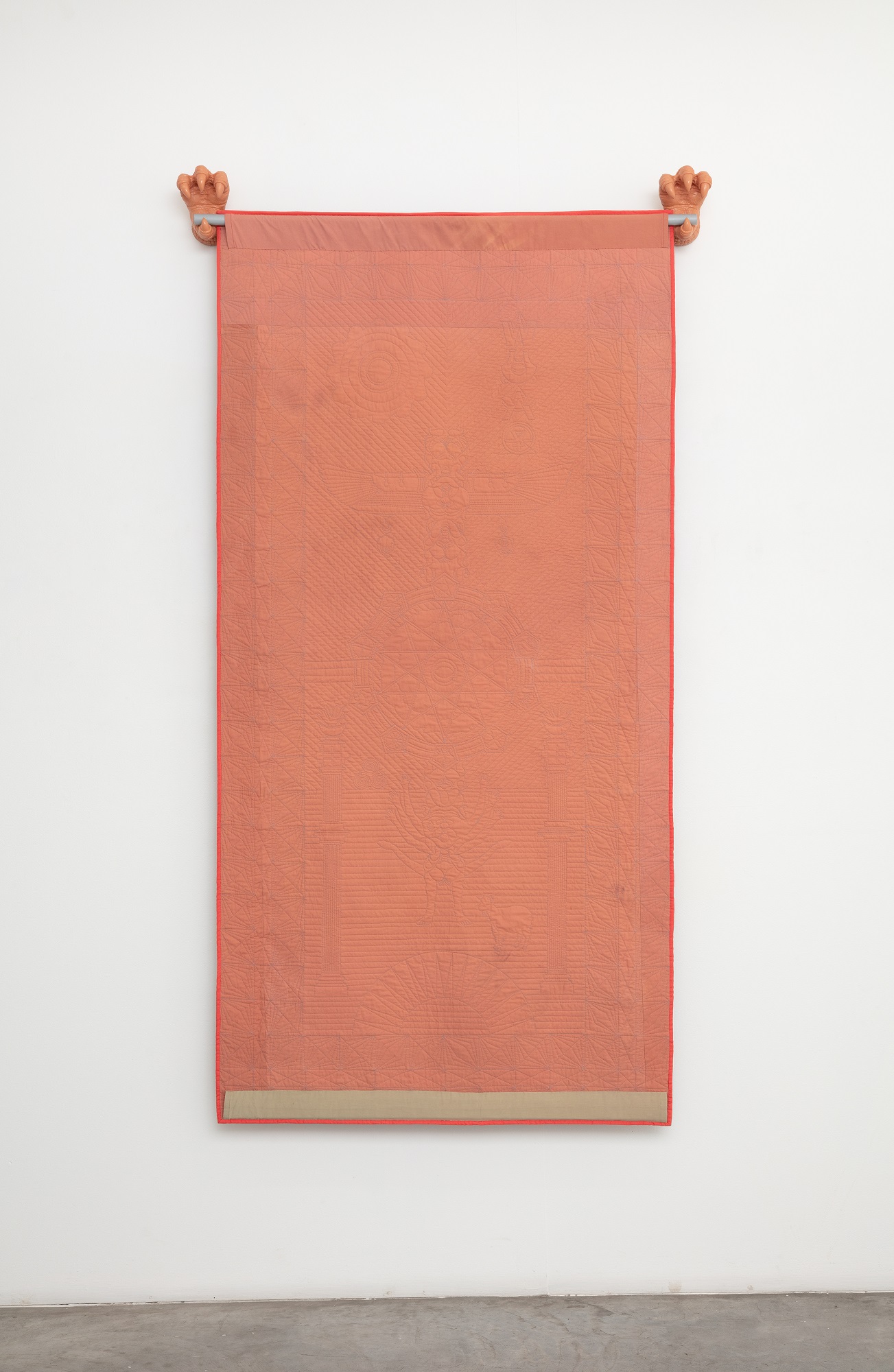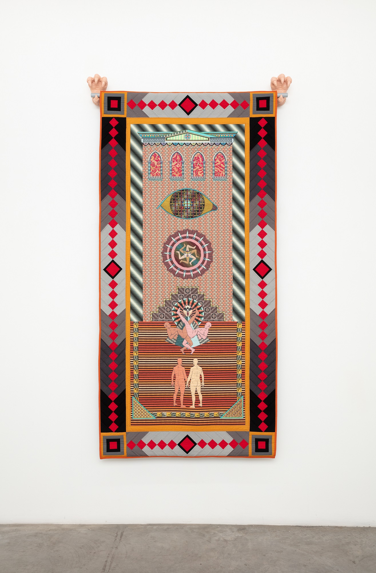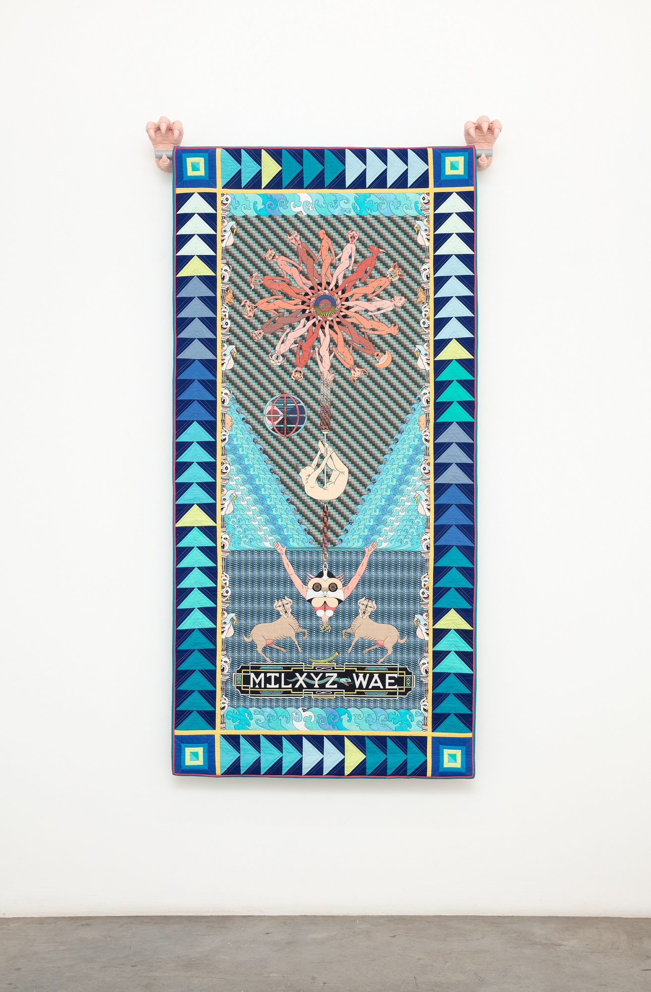 quilt made from digital print on cotton with pieced fabric border, assorted textiles, thread