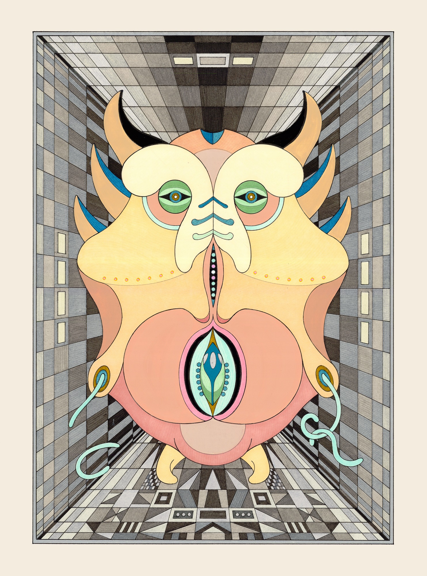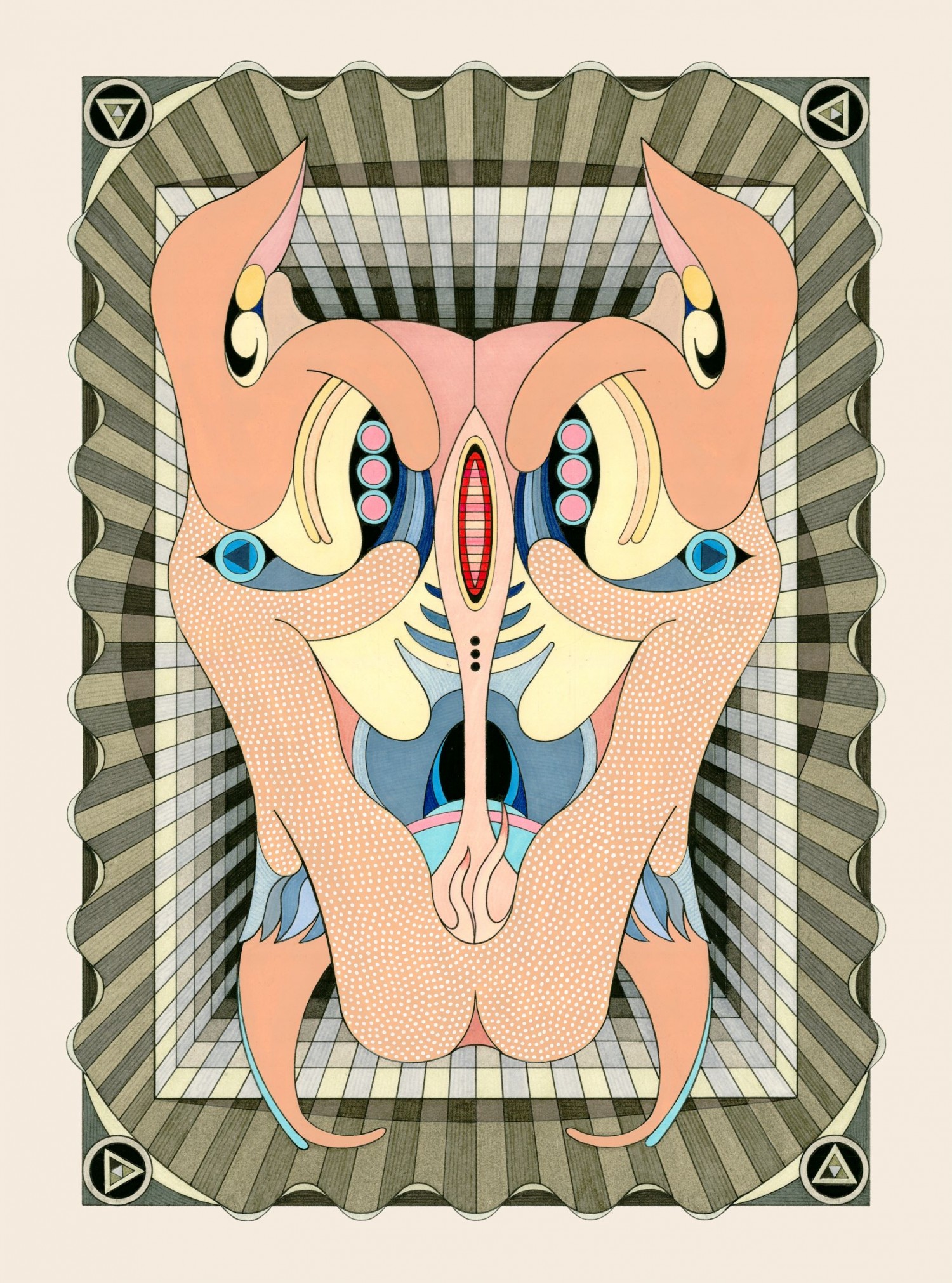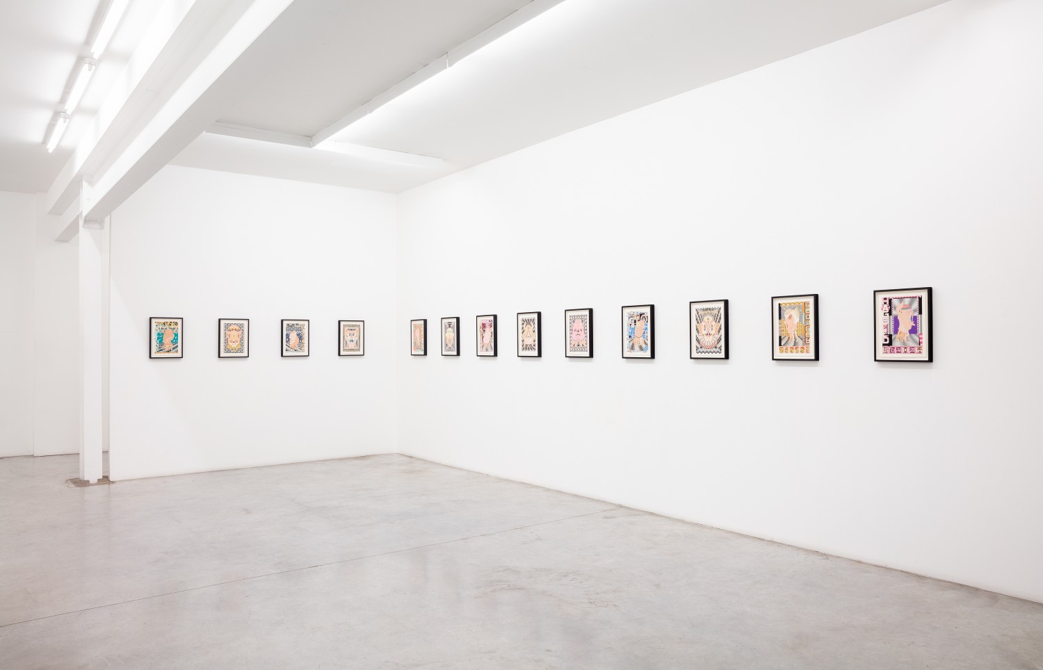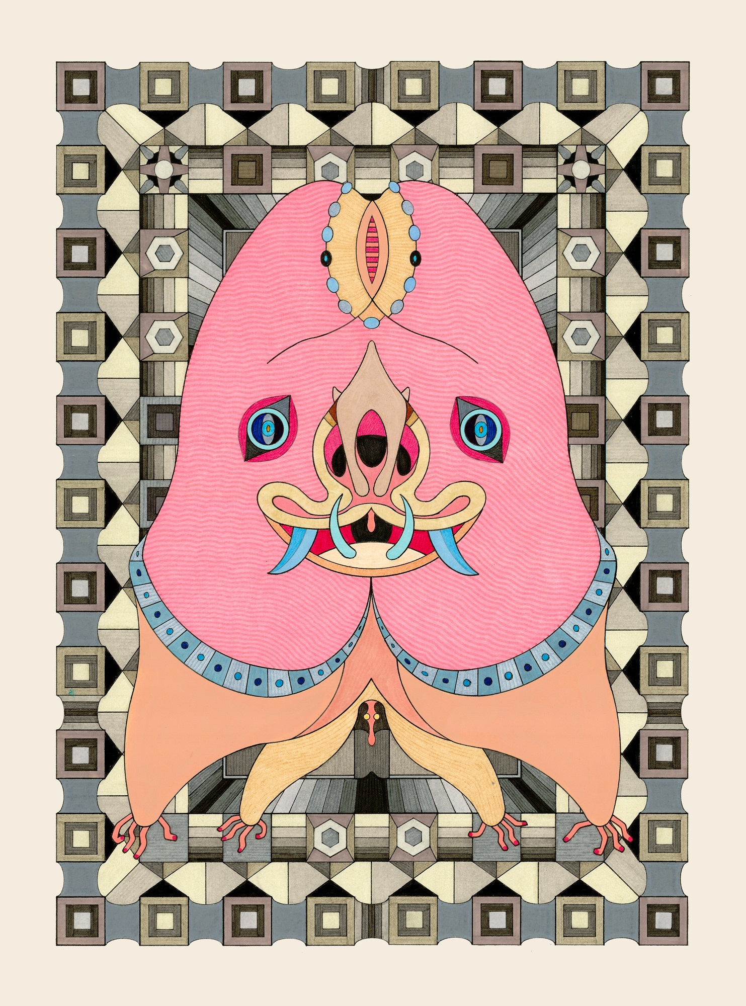 pen, fibre tipped markers, acrylic paint, and gouache on paper