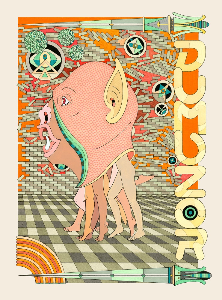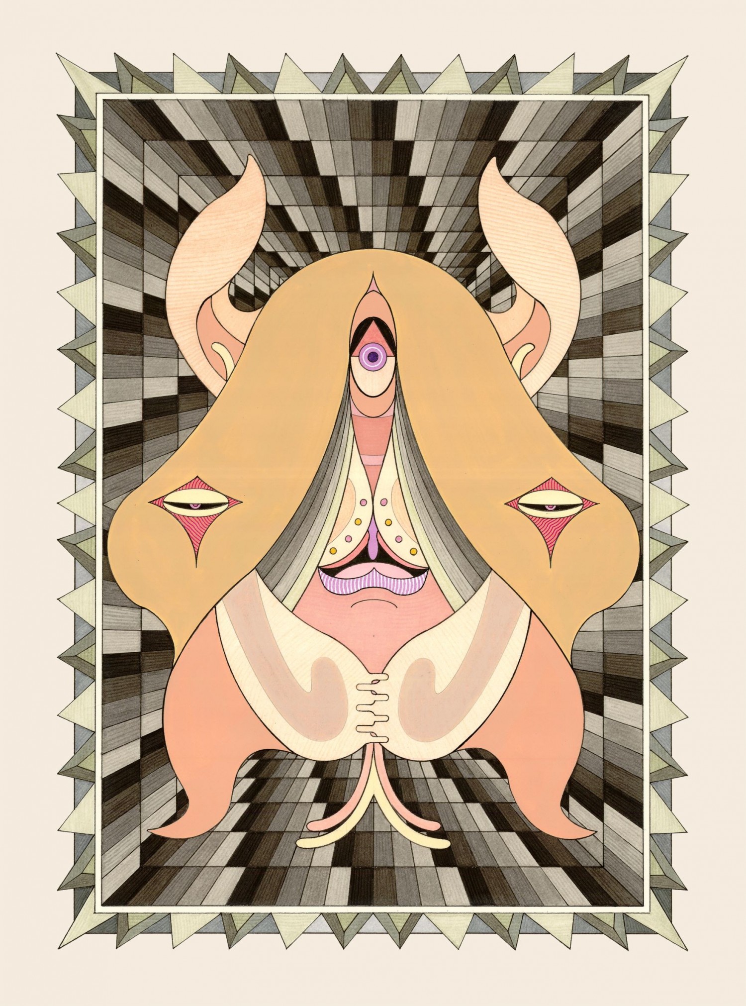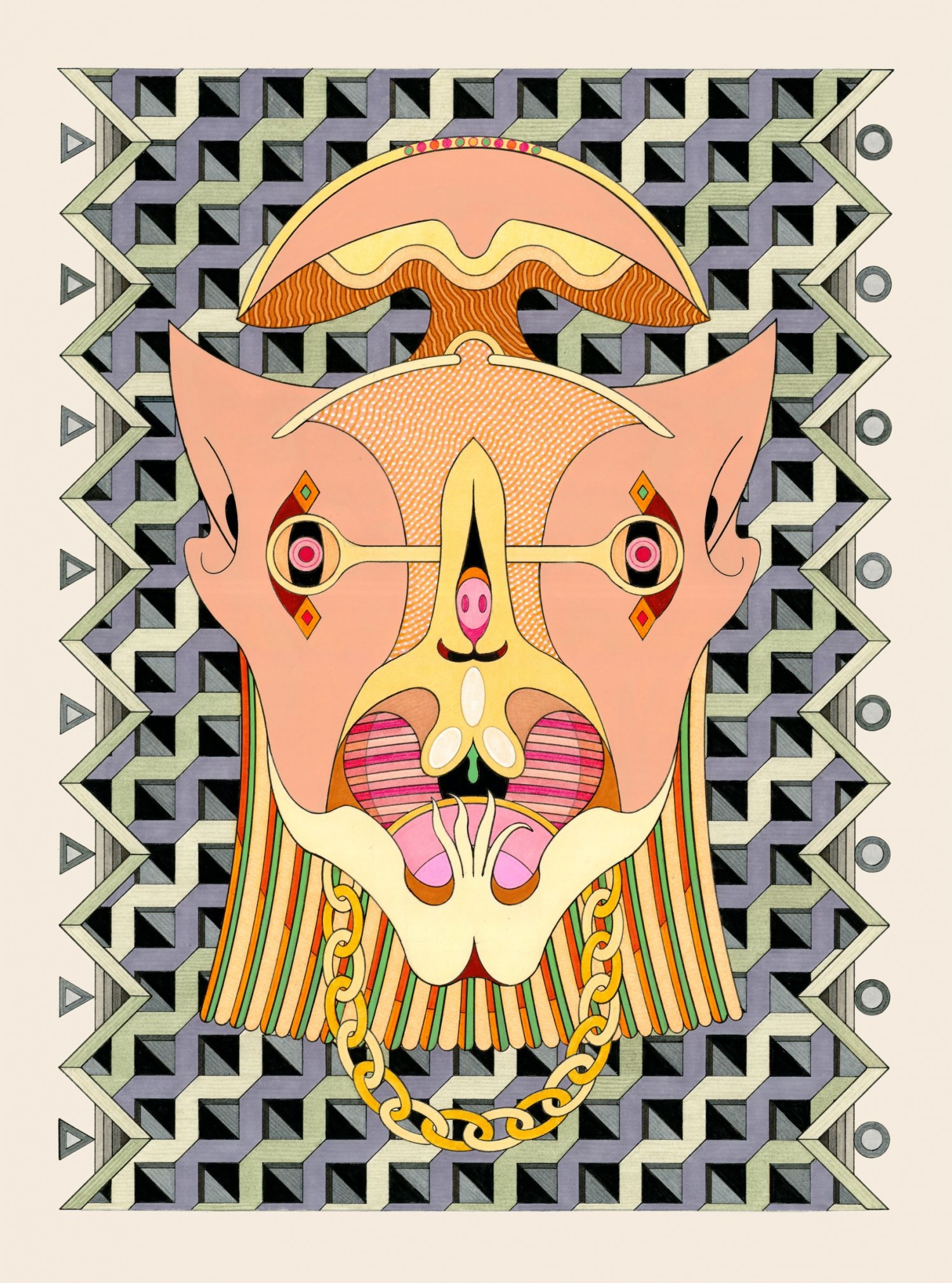 pen, fibre tipped markers, acrylic paint, and gouache on paper