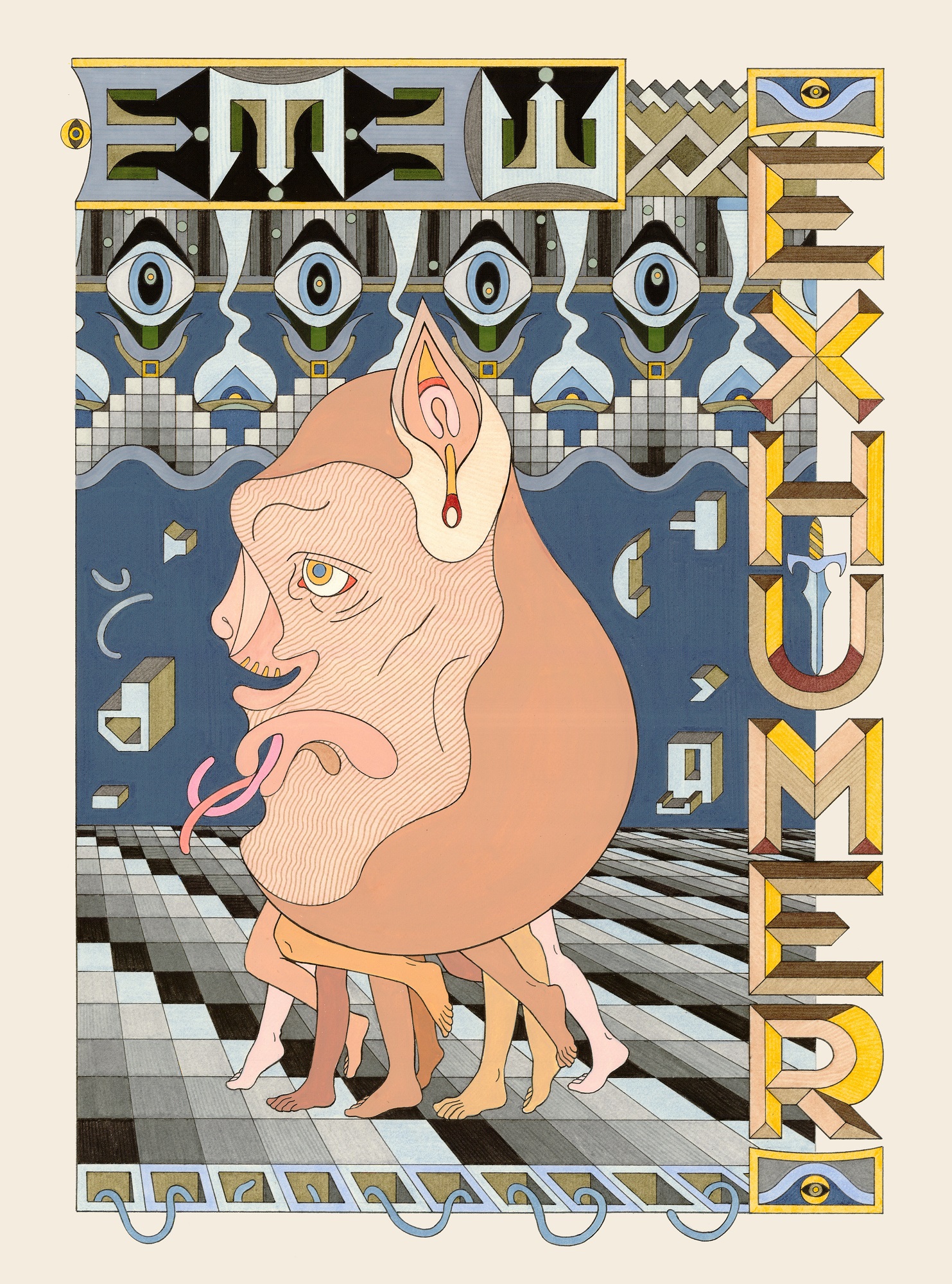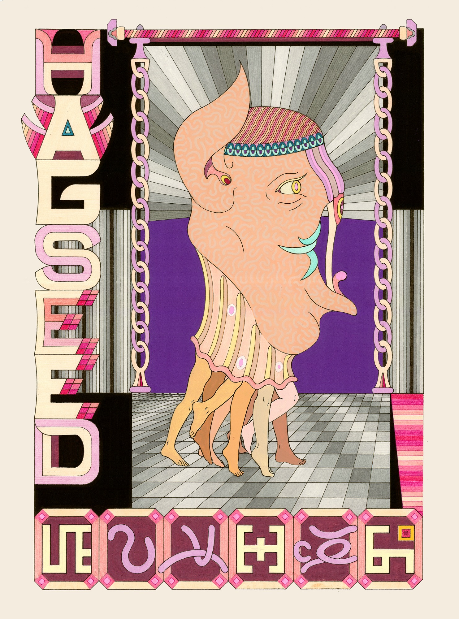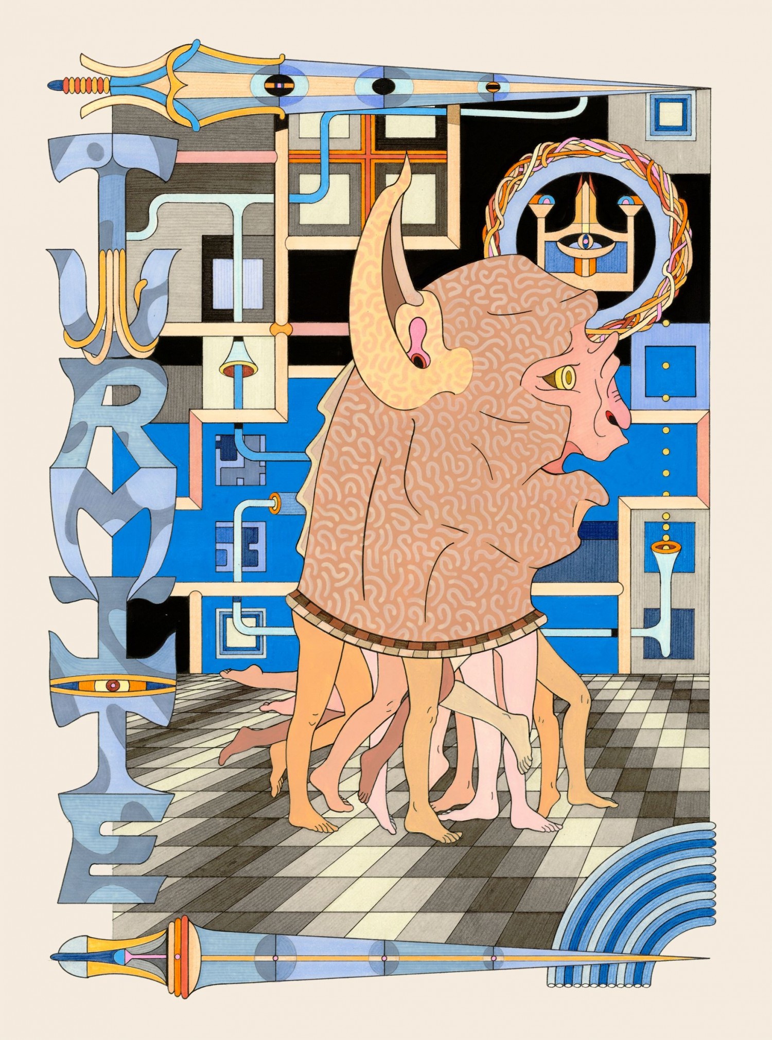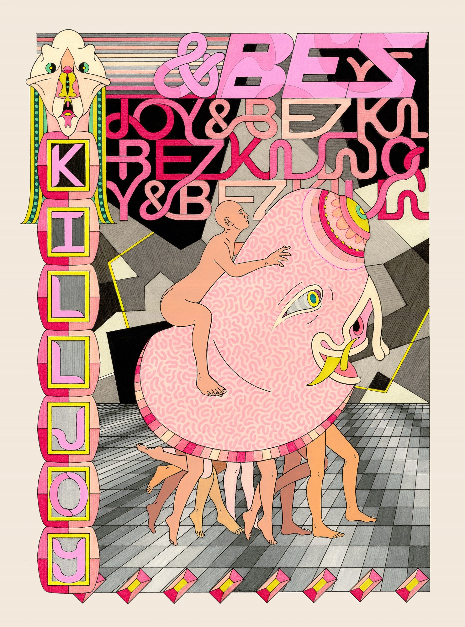 pen, fibre tipped markers, acrylic paint, and gouache on paper