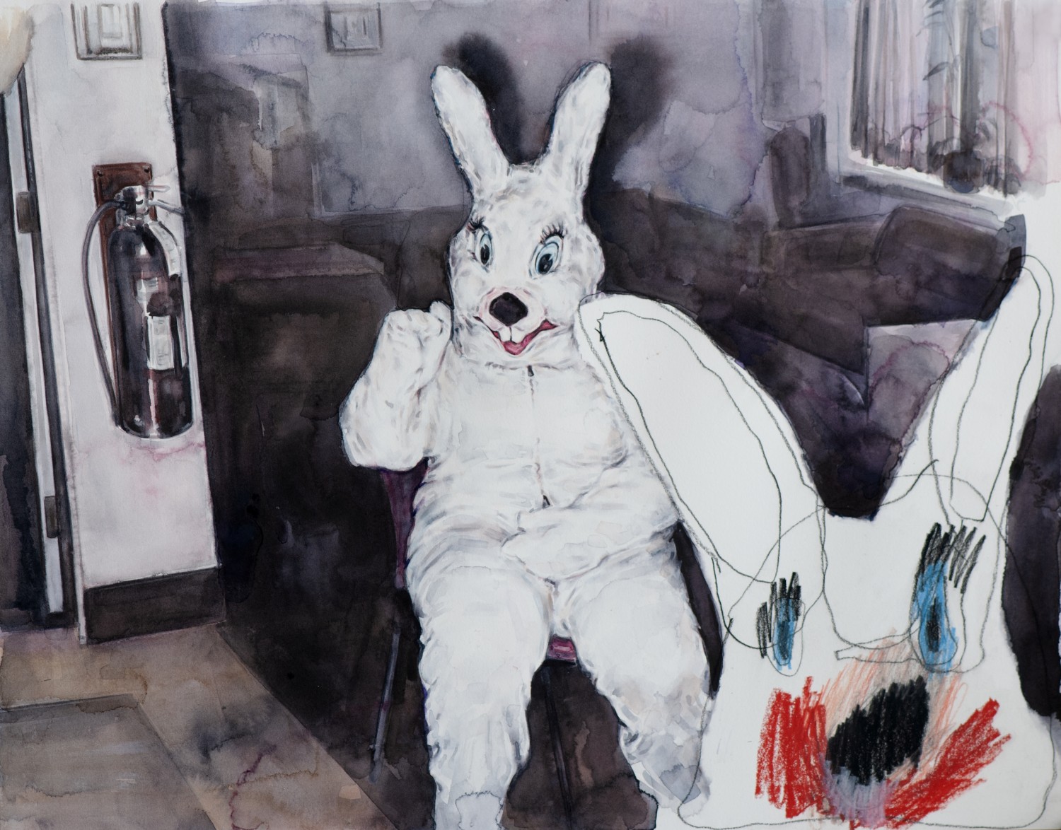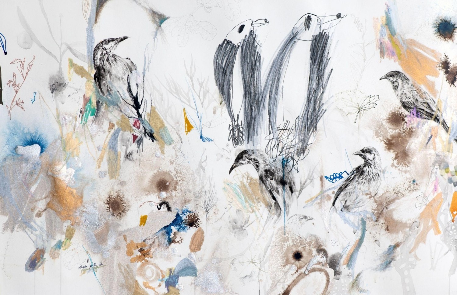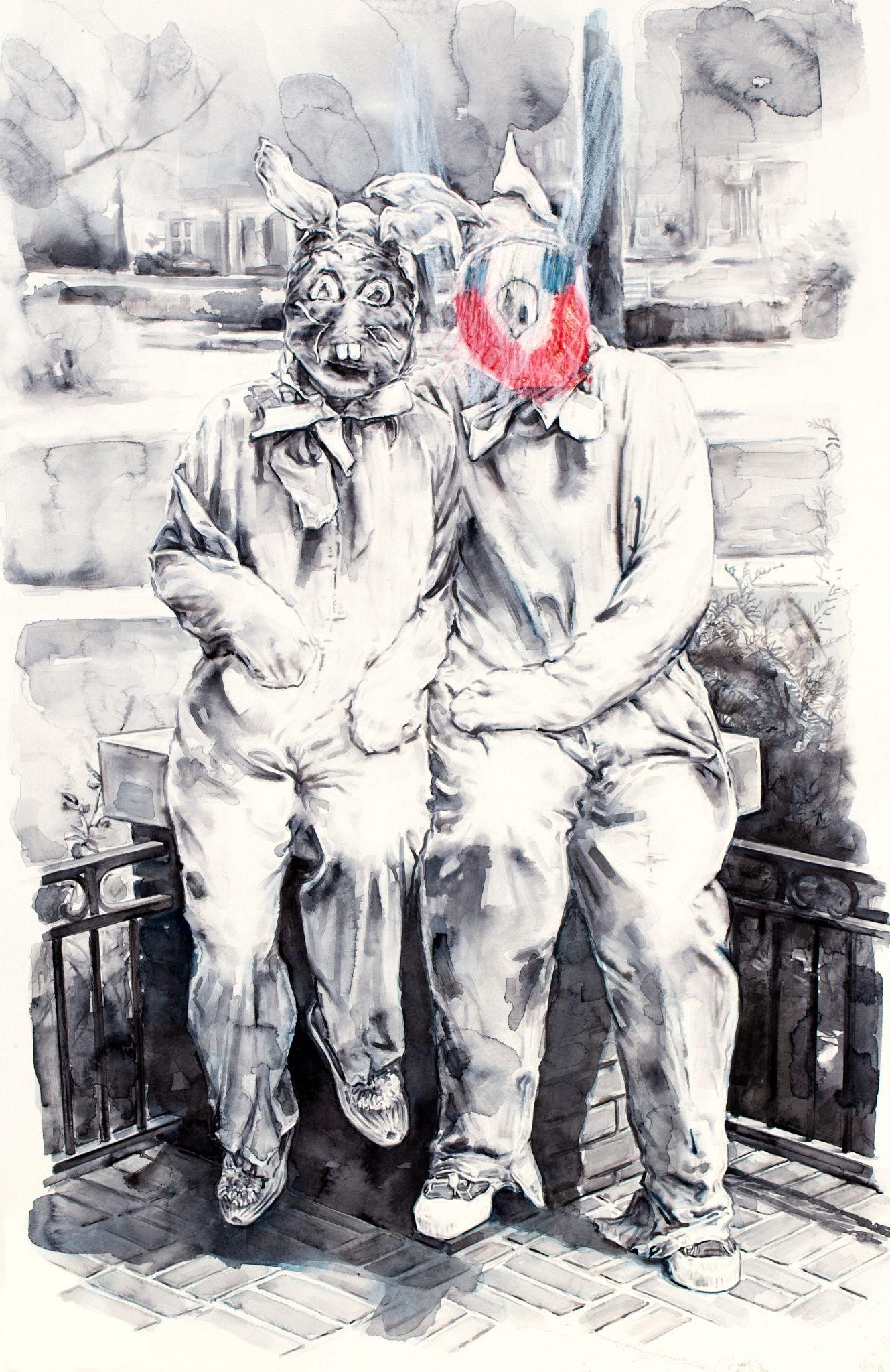 watercolour, ink, pencil and oil pastel on paper
