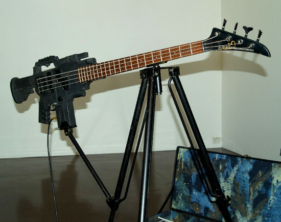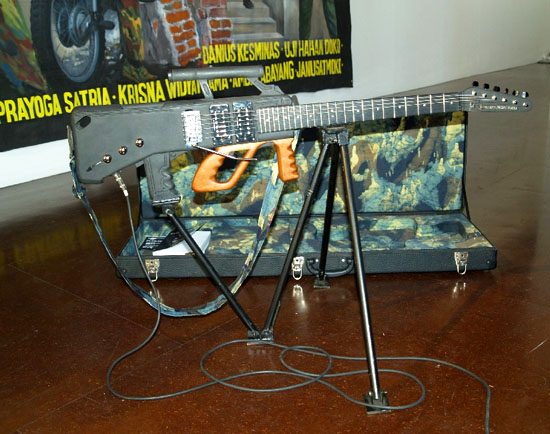 mahogany bass guitar carved & painted by Adhik Kristiantoro, metal tripod stand fabricated by 'Le'War Warsito, lined embossed case made by Pak Manto, batik lining painted by Abdul Sy.