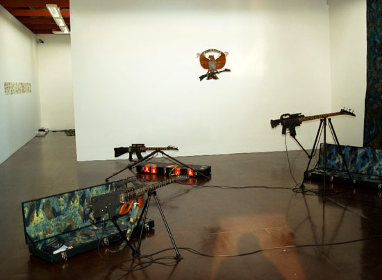 mahogany guitar carved & painted by Adhik Kristiantoro, metal tripod stand fabricated by 'Le'War Warsito, lined embossed case made by Pak Manto, batik lining painted by Abdul Sy.