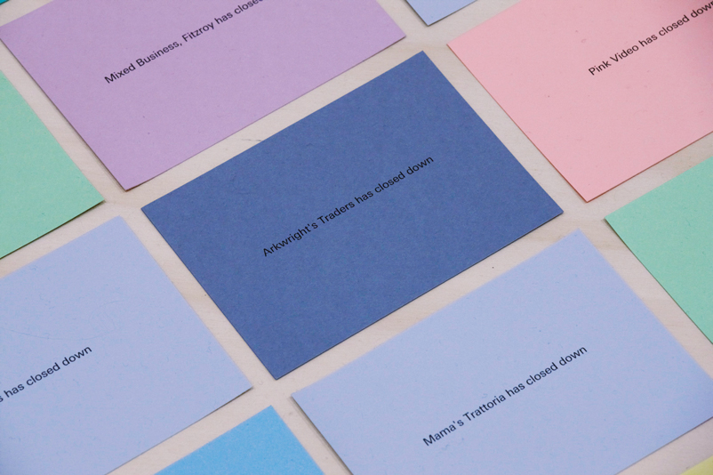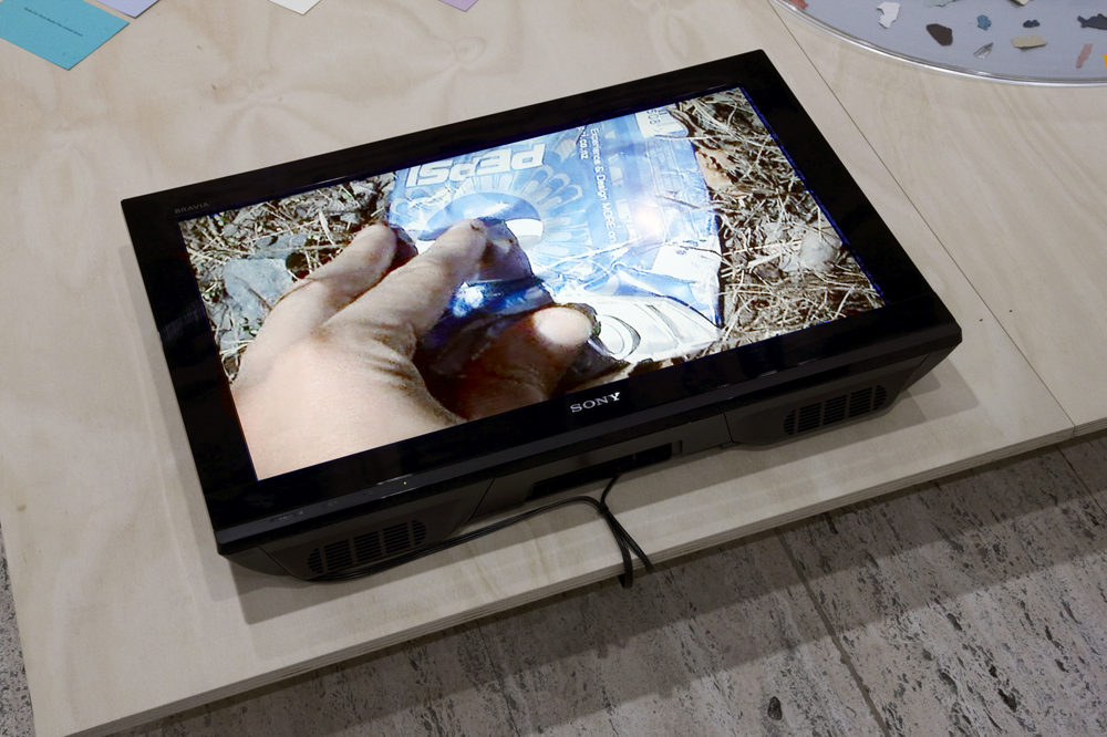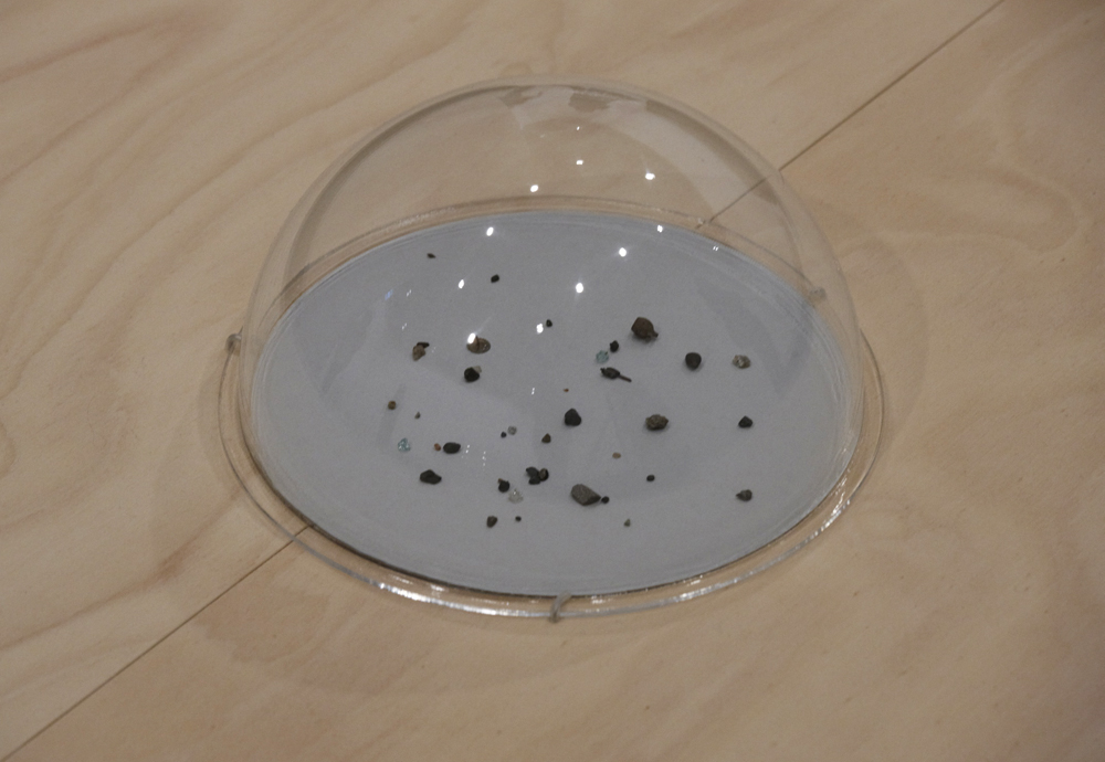 4 x DVDs (flat display), 2 digital slide projections (1 x flat display; 1 x wall display), 1 x Artist's book (40 x A6 pages), 1x collection of paint fragments under perspex dome), 1 x rock, 1 x collection of pebbles, size: variable