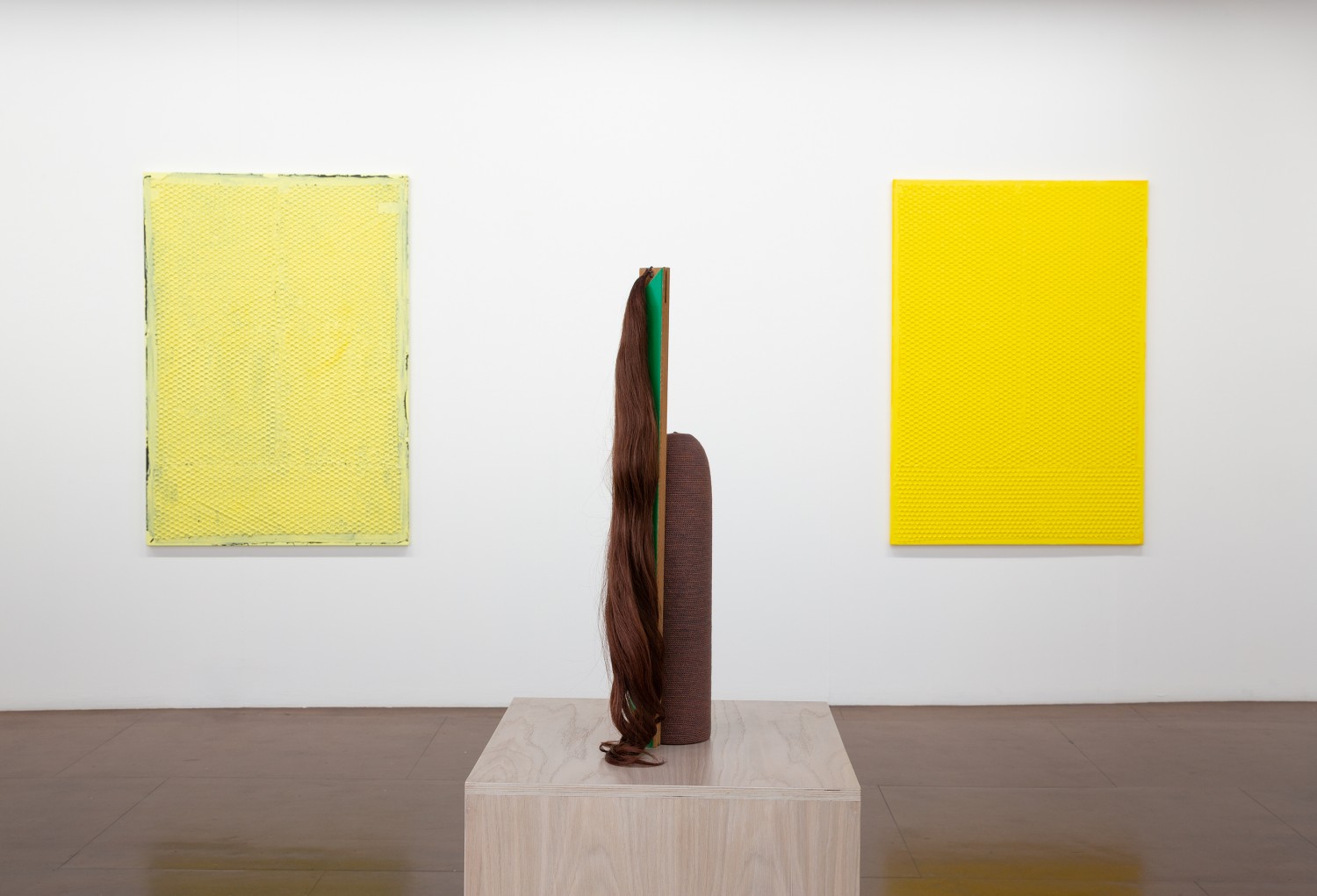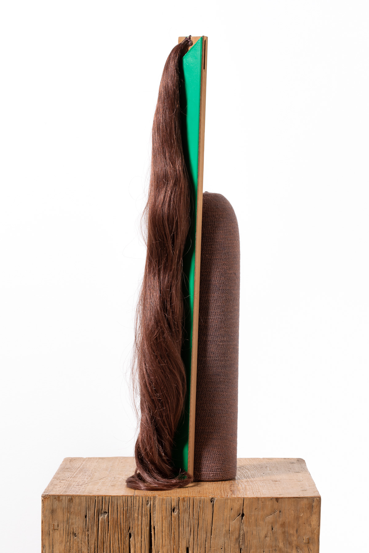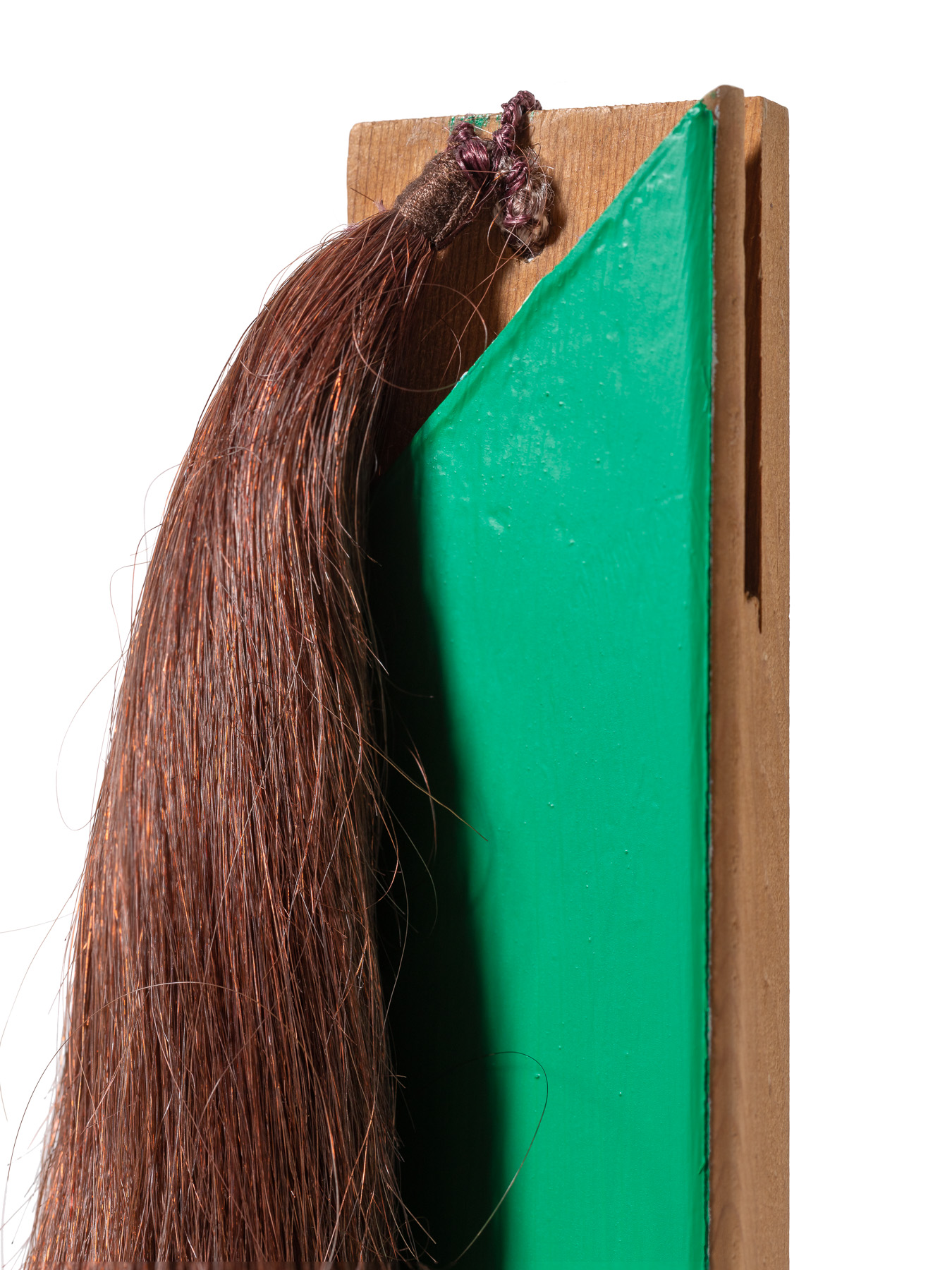 hand crocheted silk, alpaca, cashmere and camel hair over wood, human hair, synthetic polymer emulsion