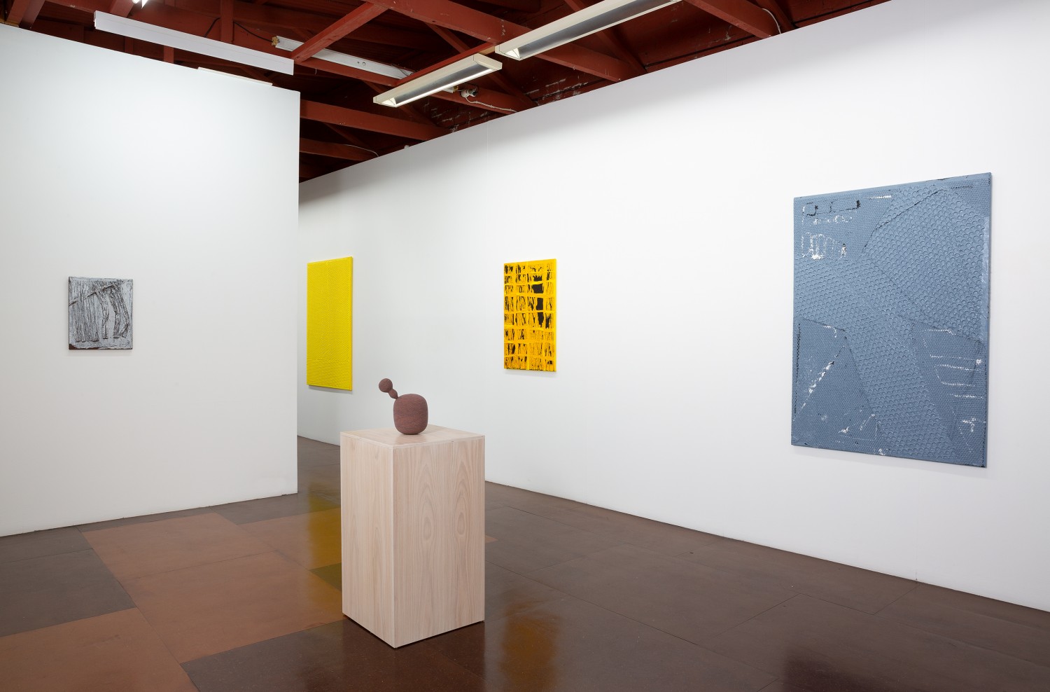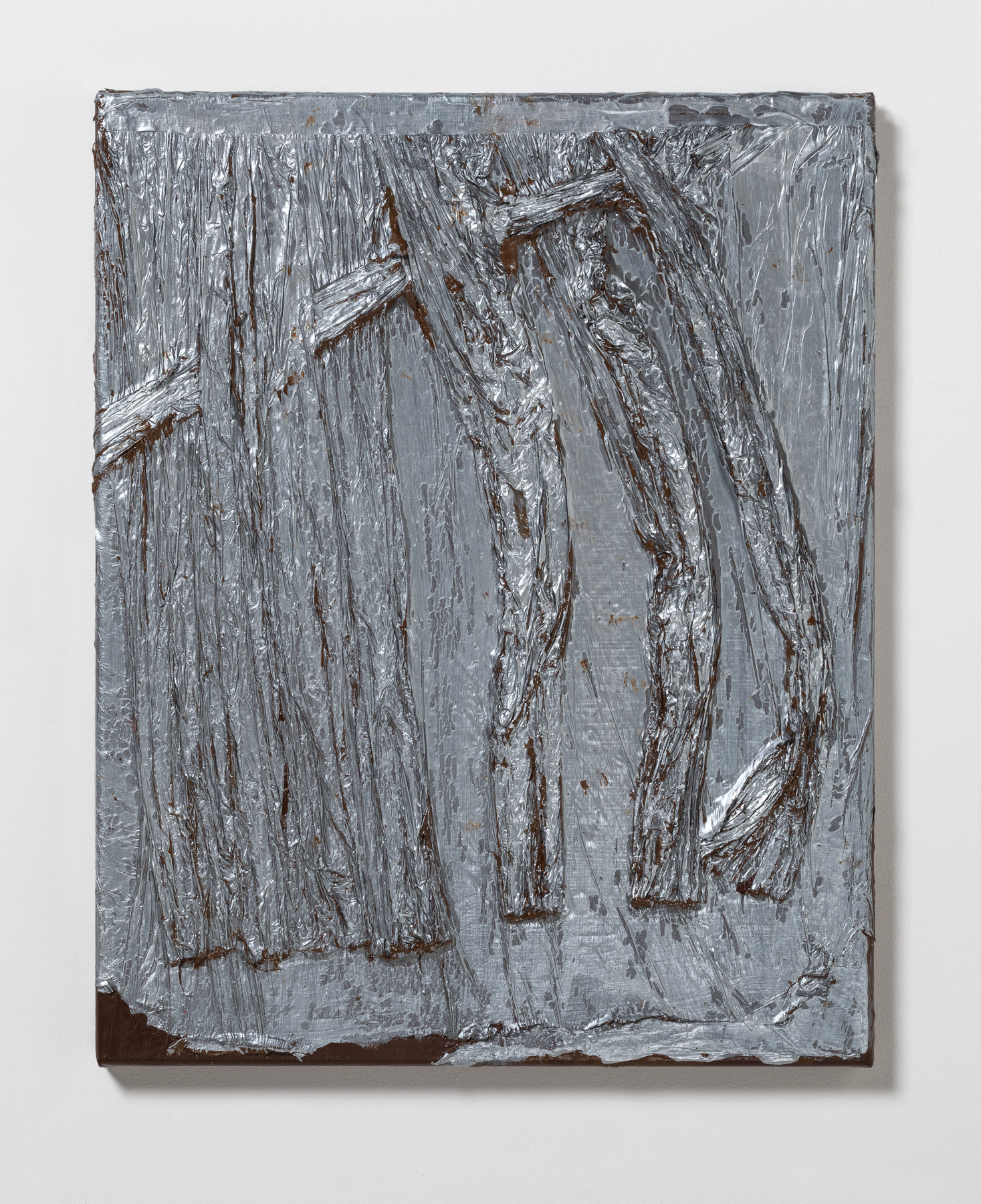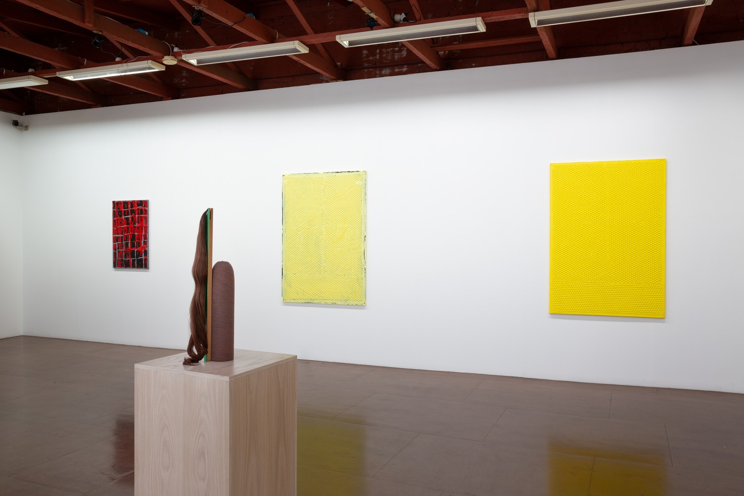 hand crocheted silk, alpaca, cashmere and camel hair over wood, human hair, synthetic polymer emulsion