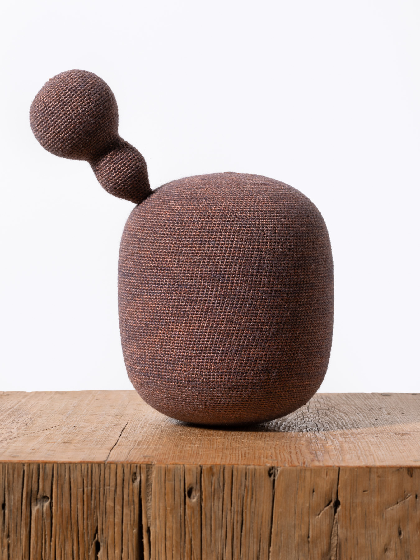 hand crocheted silk, alpaca, cashmere and camel hair over wood and gourd, synthetic polymer emulsion
