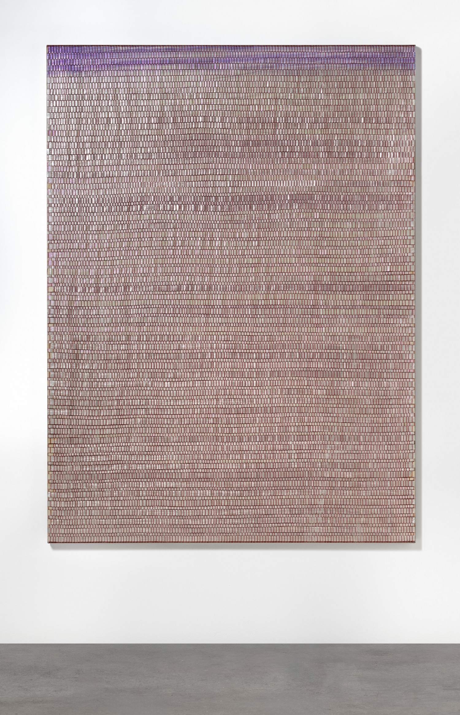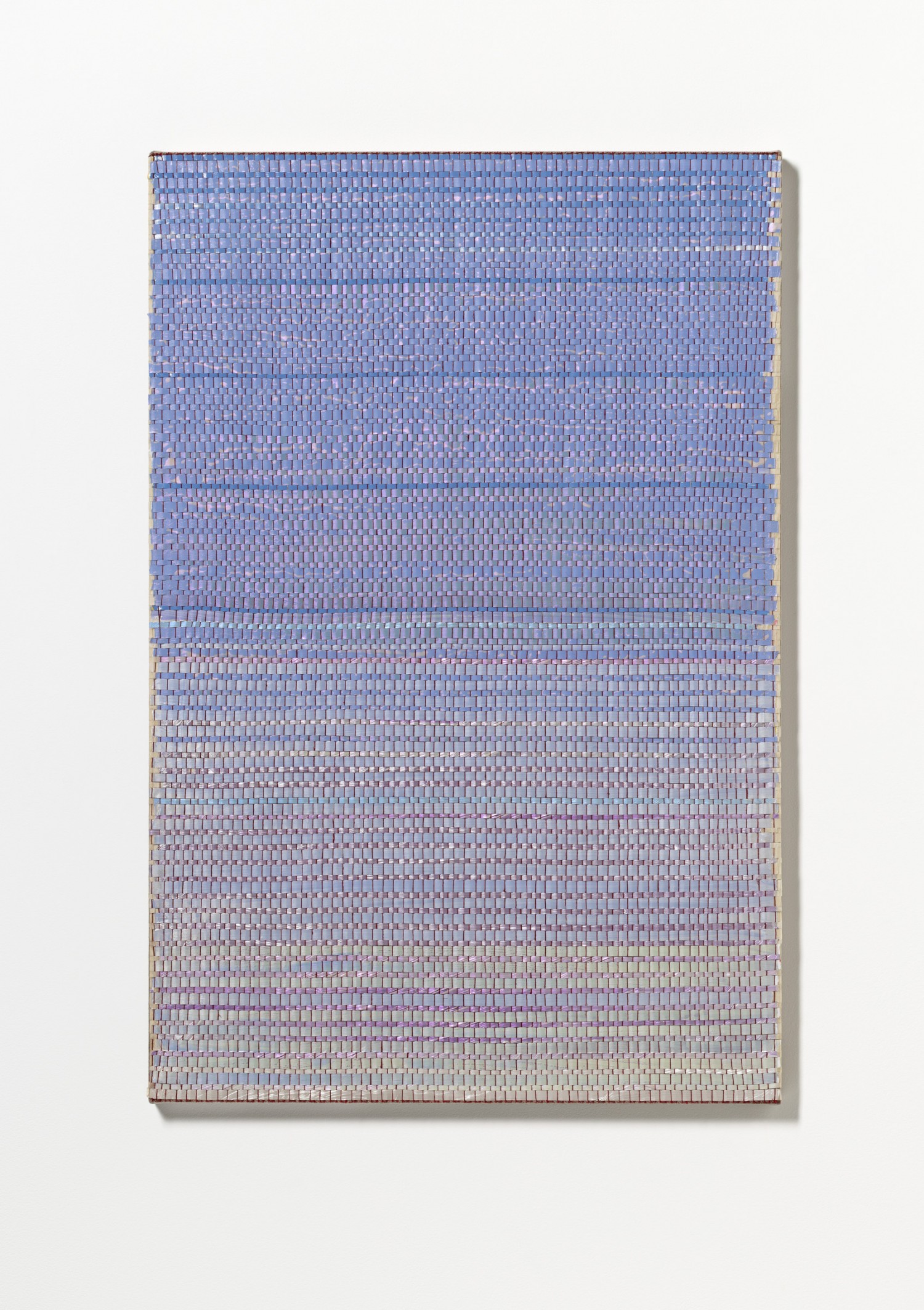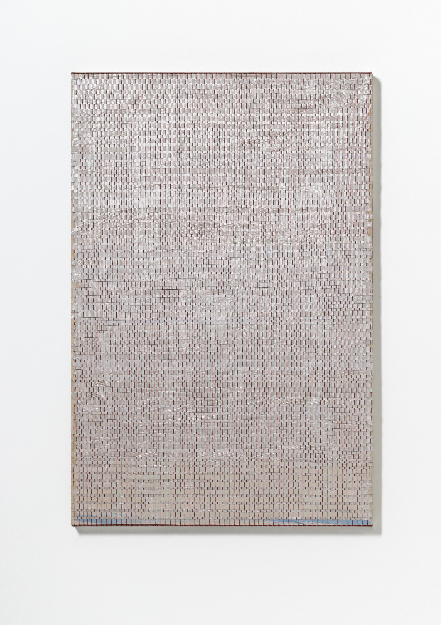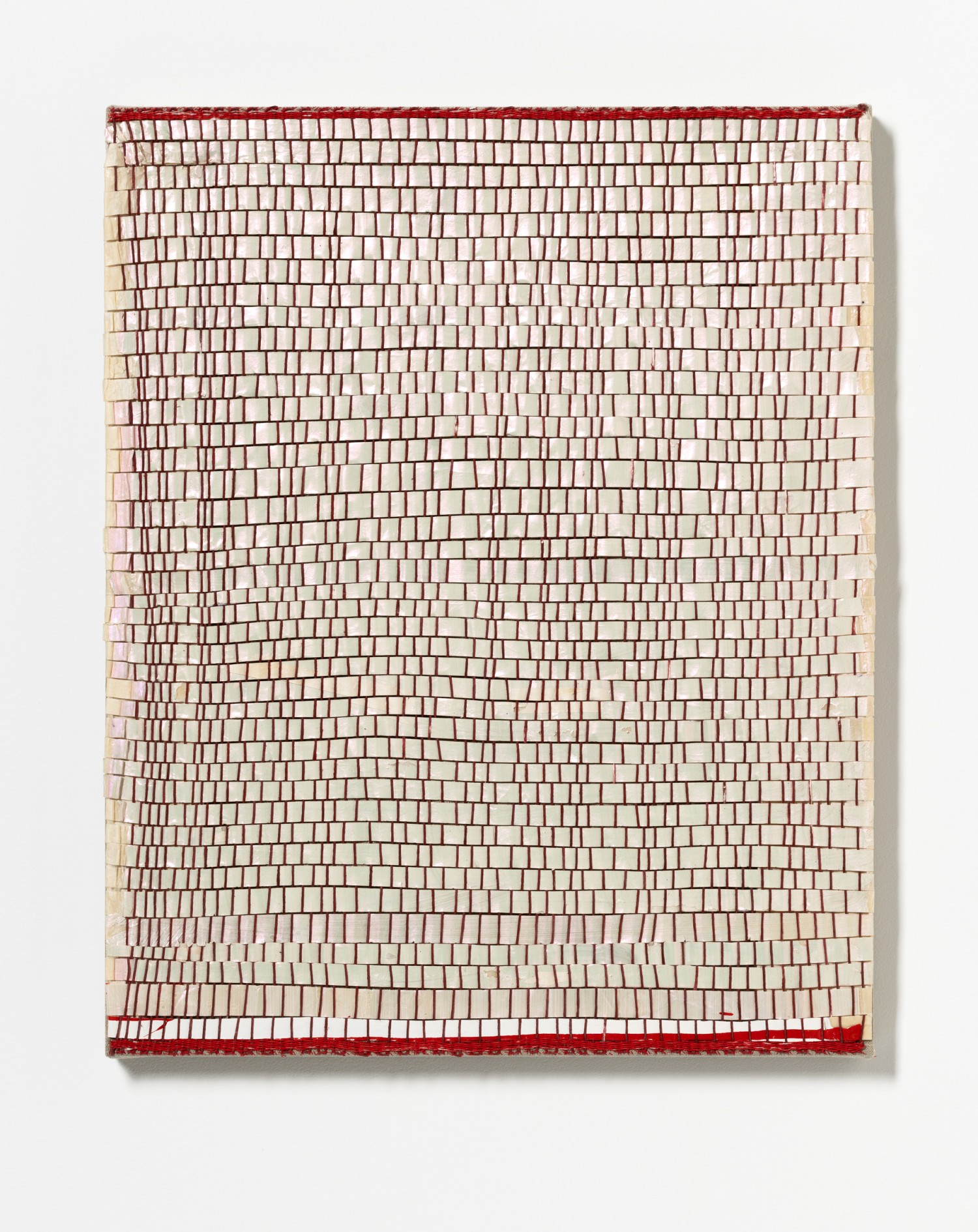 synthetic polymer emulsion, iridescent pigment, micaceous iron oxide, Japanese kozo natural paper, linen and cotton thread on wooden panel