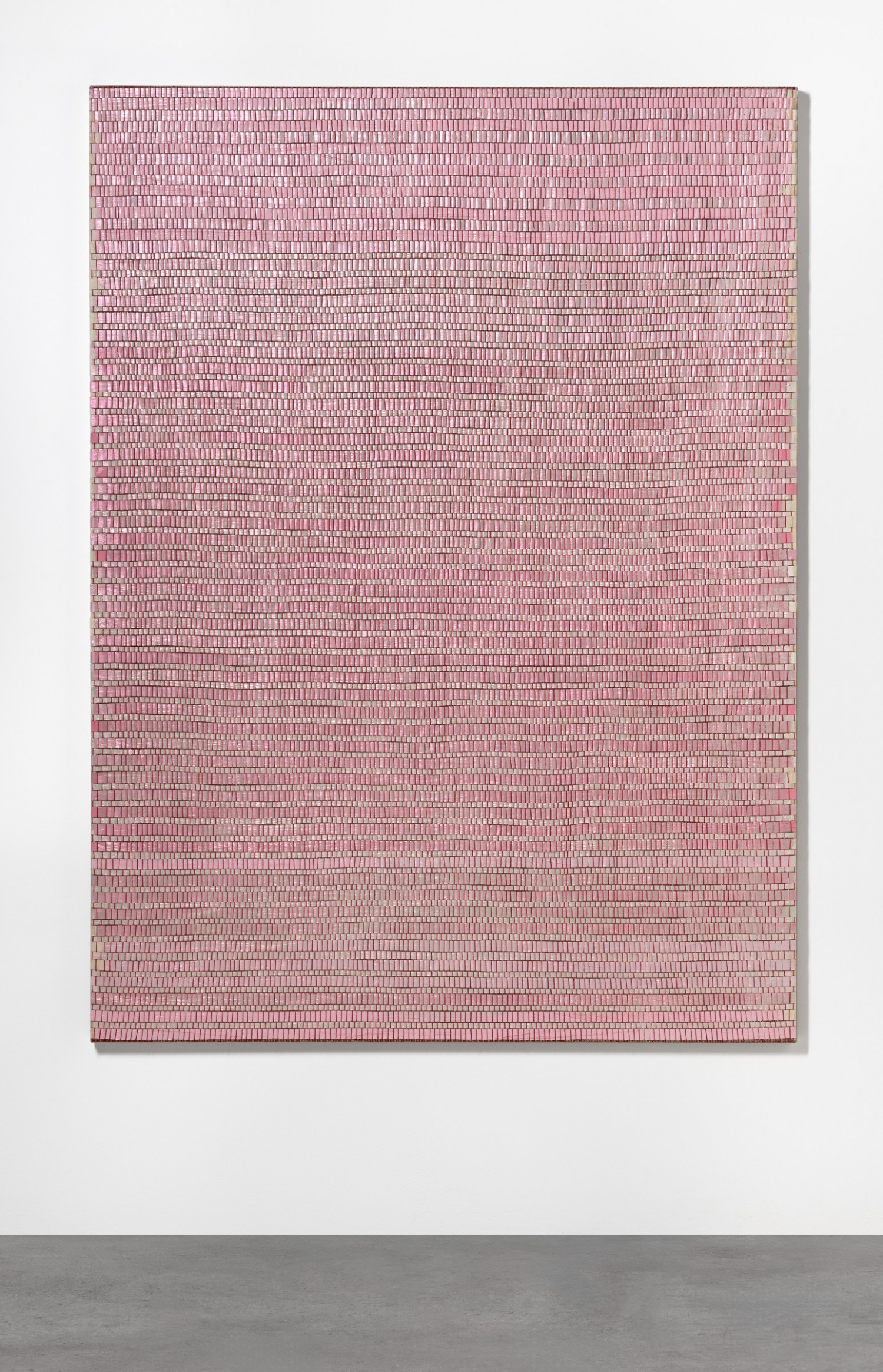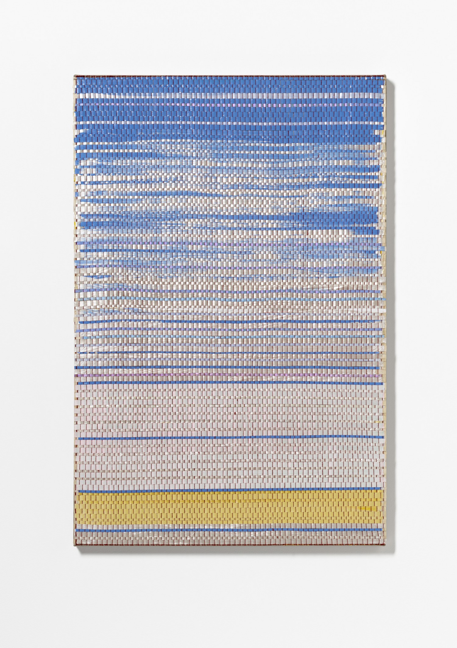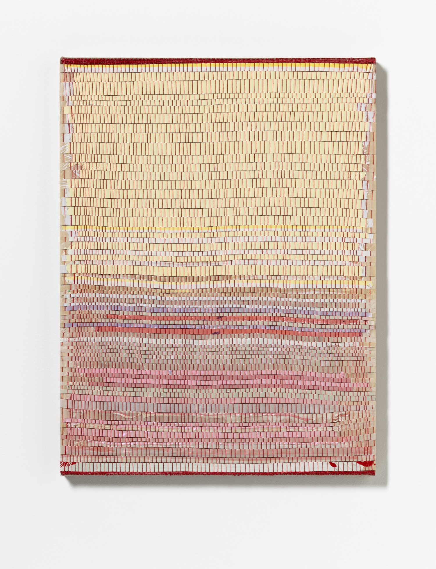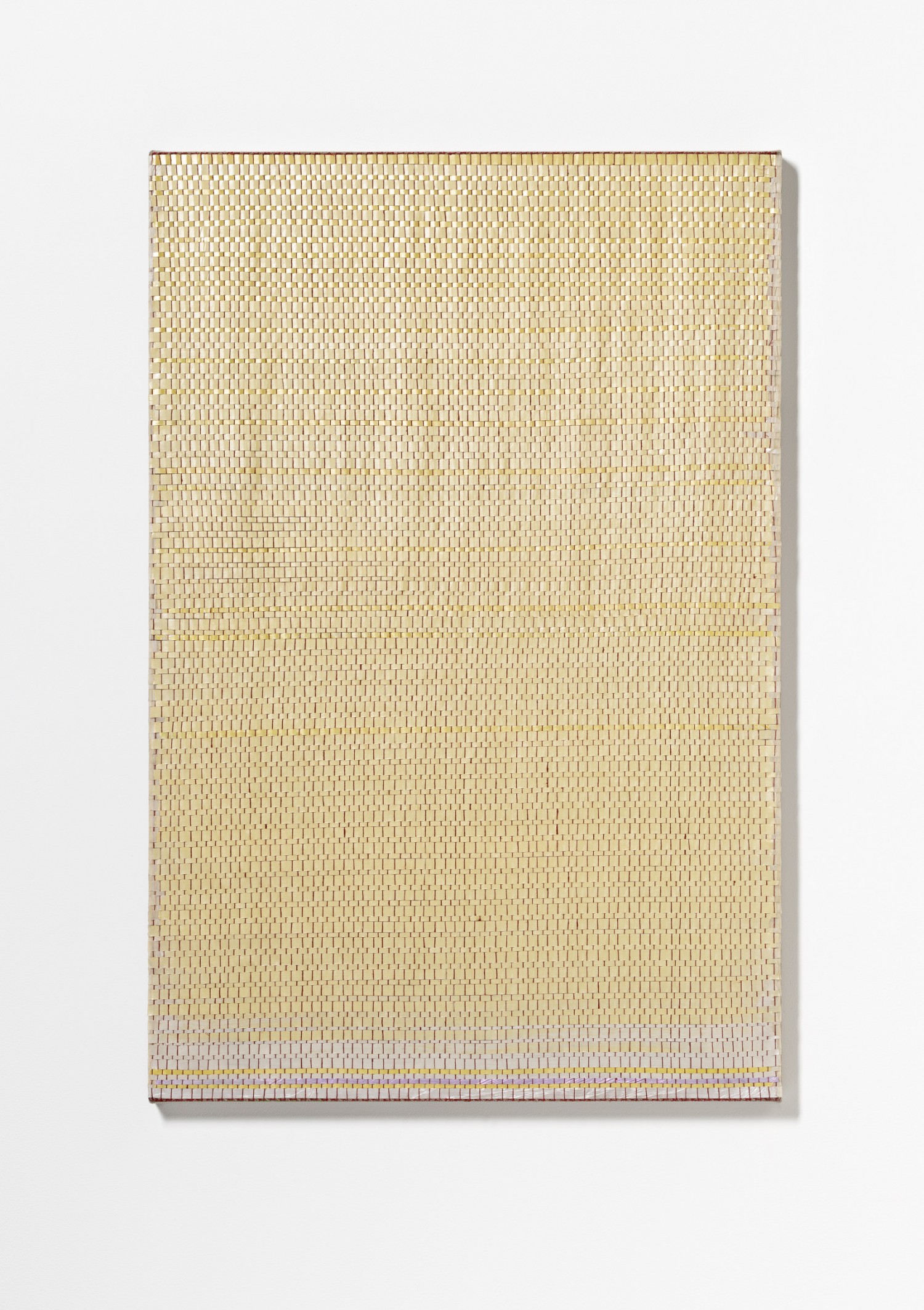synthetic polymer emulsion, iridescent pigment, micaceous iron oxide, Japanese kozo natural paper, linen and cotton thread on wooden panel