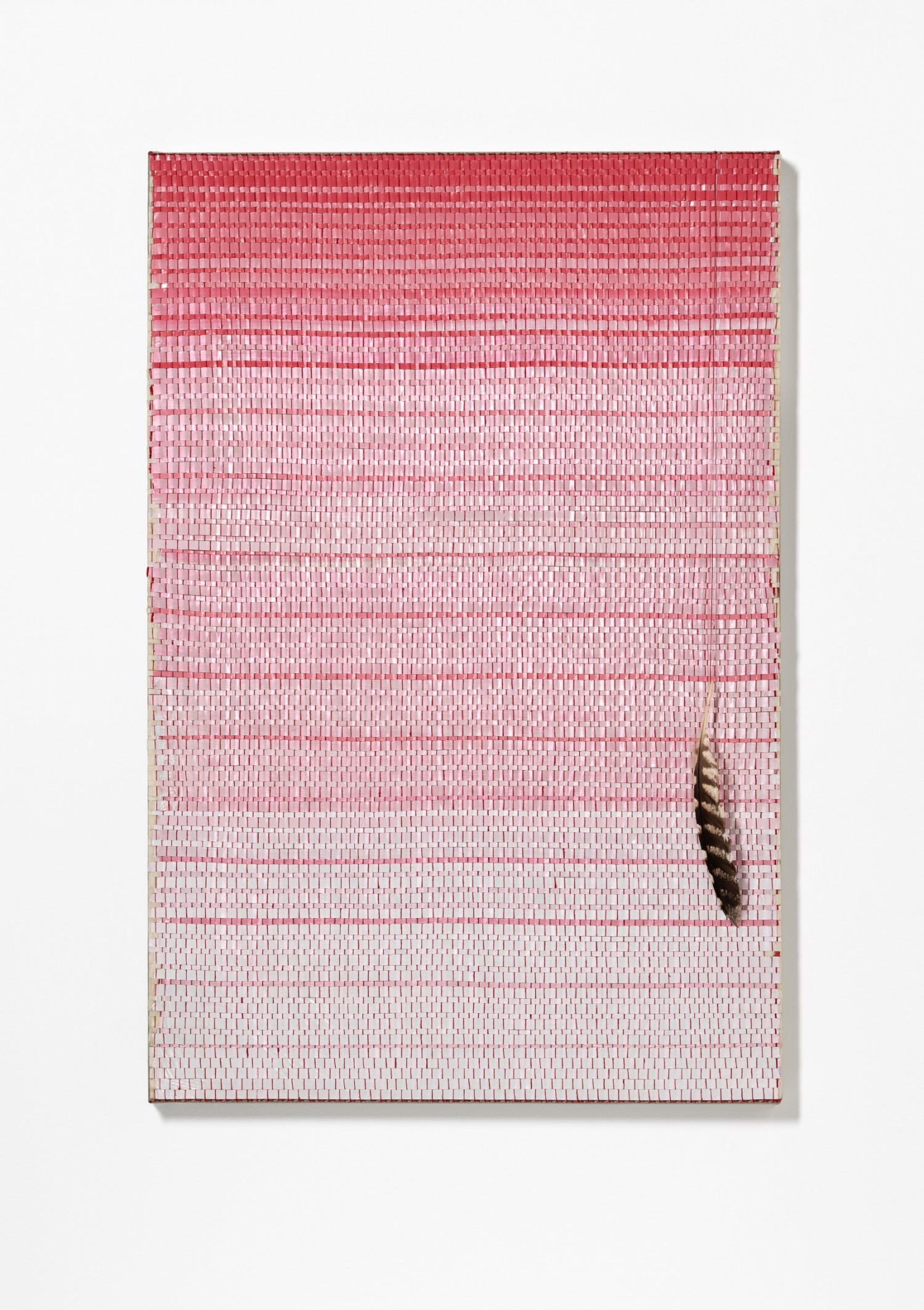 synthetic polymer emulsion, iridescent pigment, Japanese kozo natural paper, Tawny Frogmouth (Podargus strigoides) feather linen and cotton thread on linen