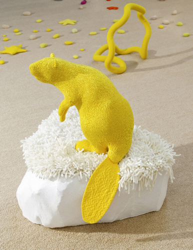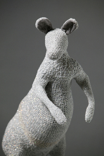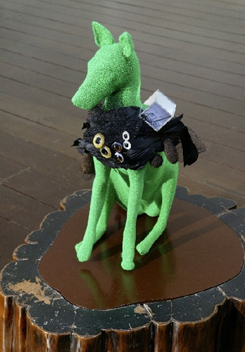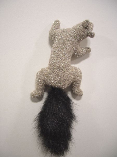 Hand crocheted lambs wool over high density foam. Hand painted glass (various pairs of glass animal taxidermy eyes), felt, nylon and cotton thread. Customized section of a Comme des garcons shirt panel, Autumn-Winter collection 2004 -
