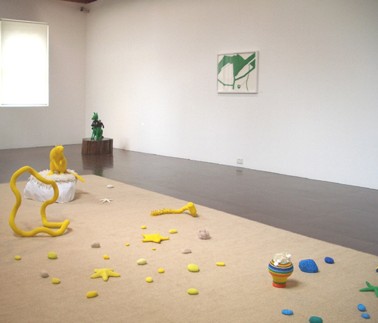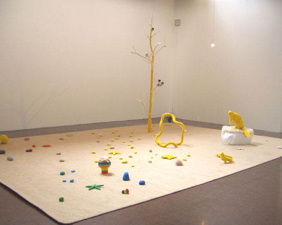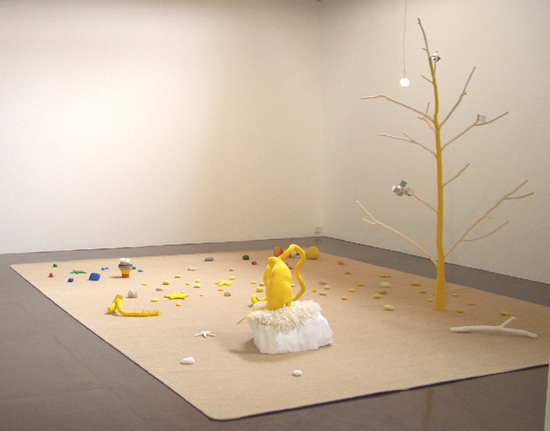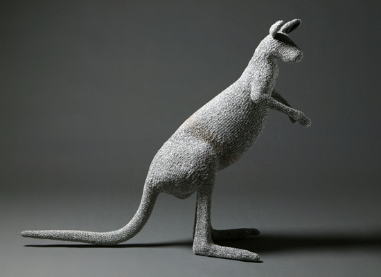 hand crocheted lambswool and embroidered cotton thread over high density foam, walnut tree, Japanese rice wine vessels (gourds), ceramic, chromed abs plastic, ('Tangle' designed by Richard X. Zawitz 1981), Lurex thread, nylon thread, cotton thread, Japane