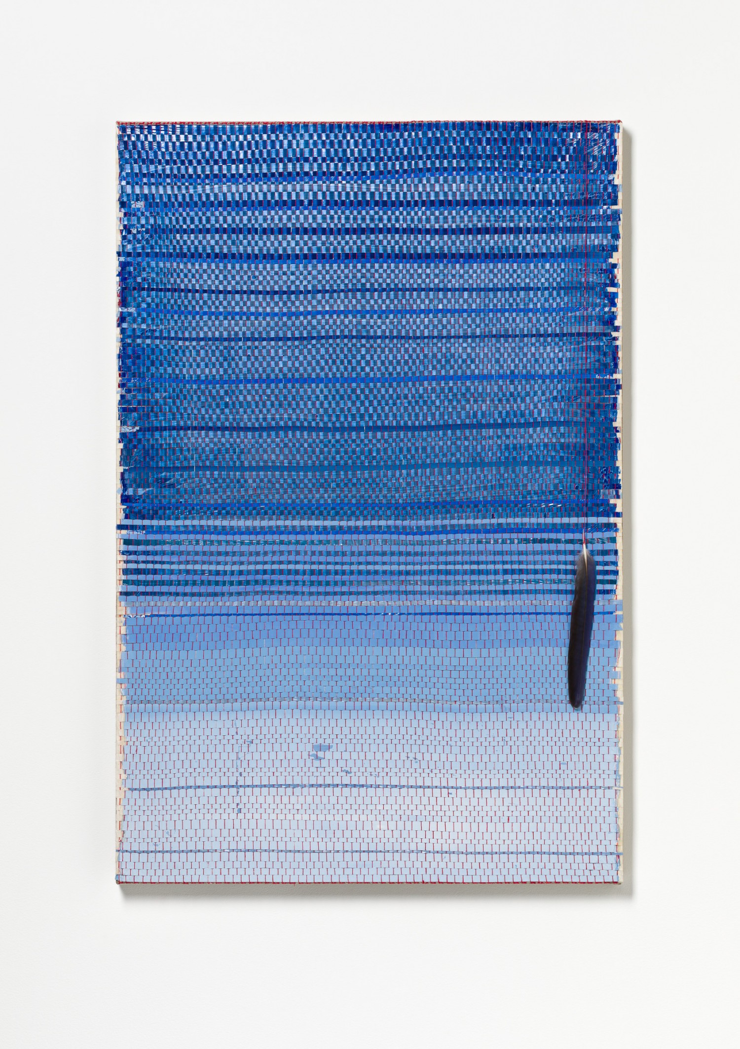 synthetic polymer emulsion, iridescent pigment, Japanese kozo natural paper,Crimson Rosella (Platycercus elegans) feather, linen and cotton thread on linen