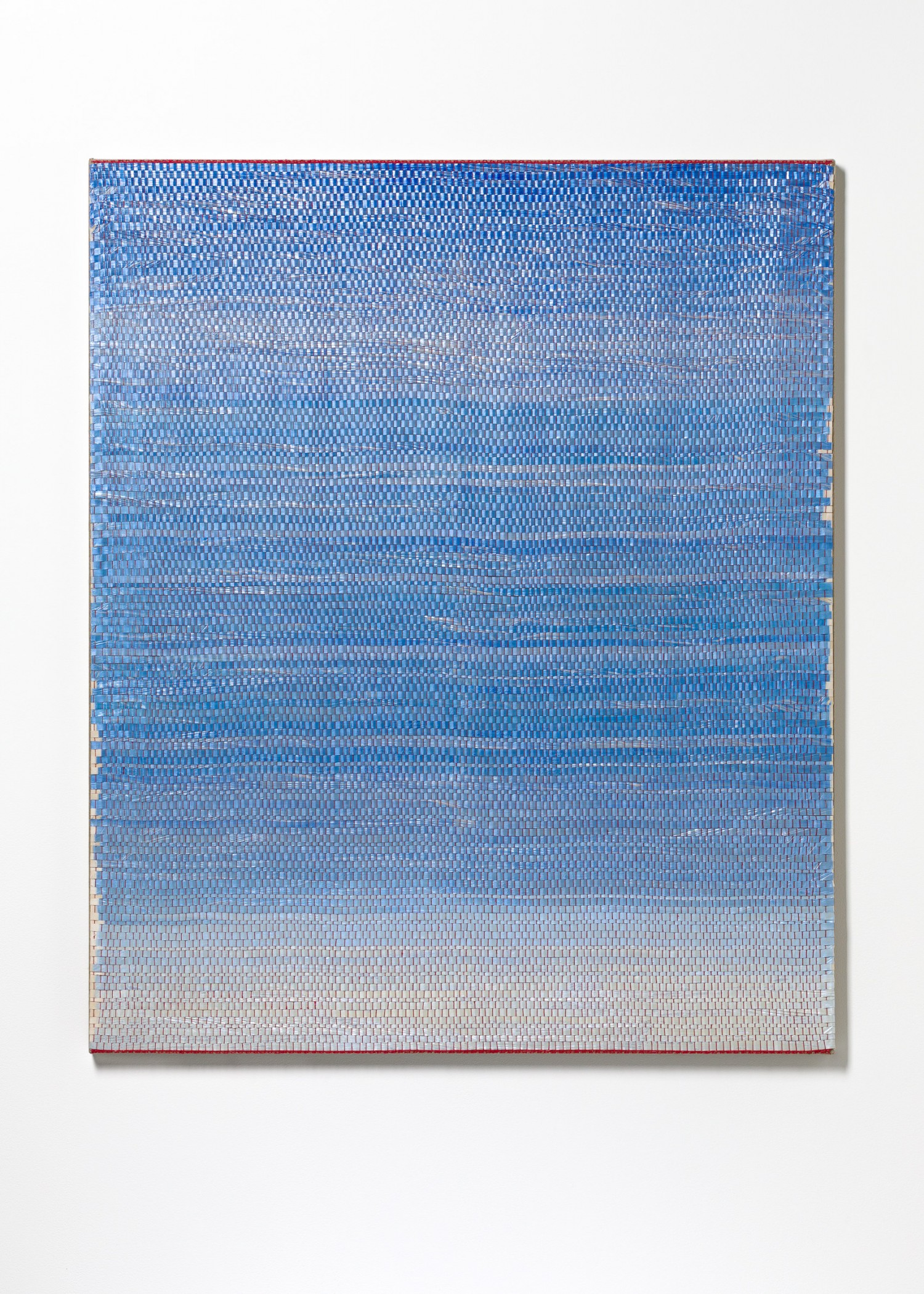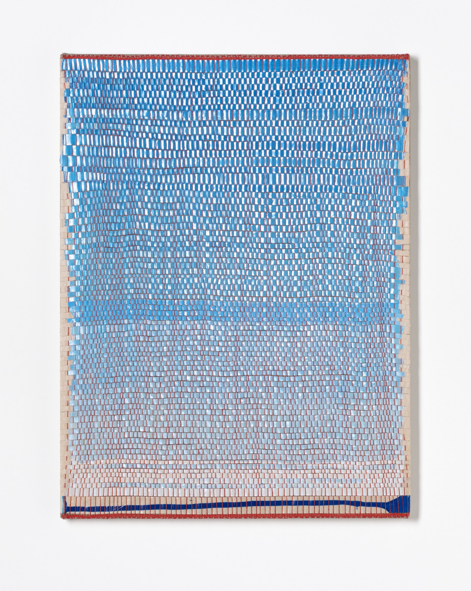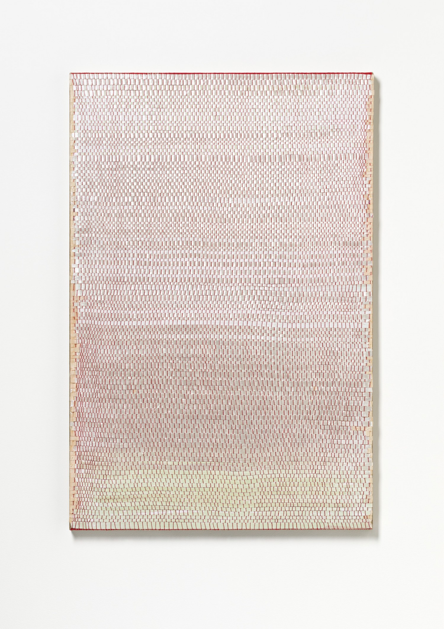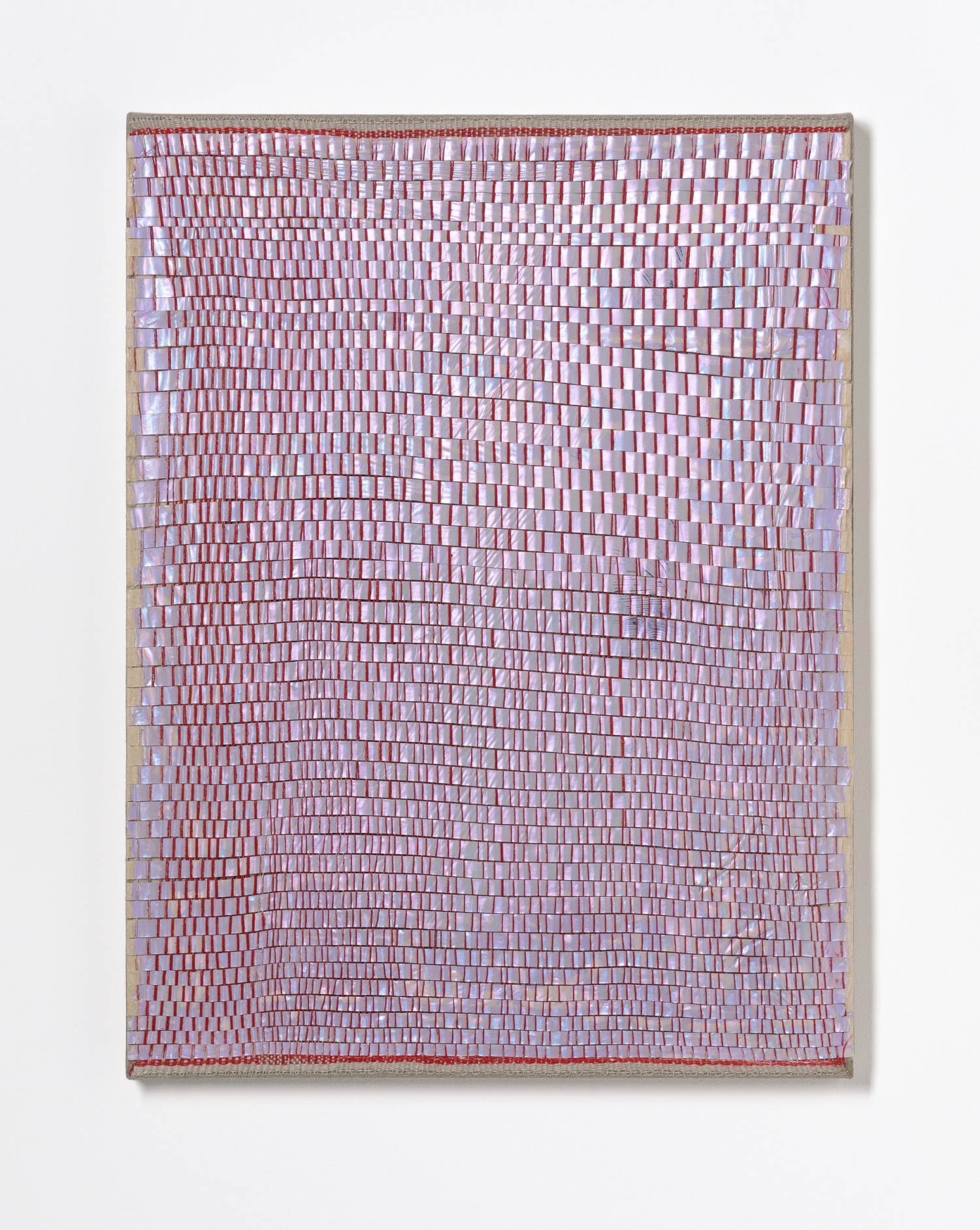 synthetic polymer emulsion, iridescent pigment, micaceous iron oxide, Japanese kozo natural paper, linen and cotton thread on wooden panel