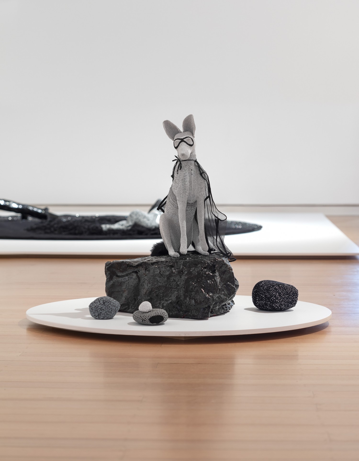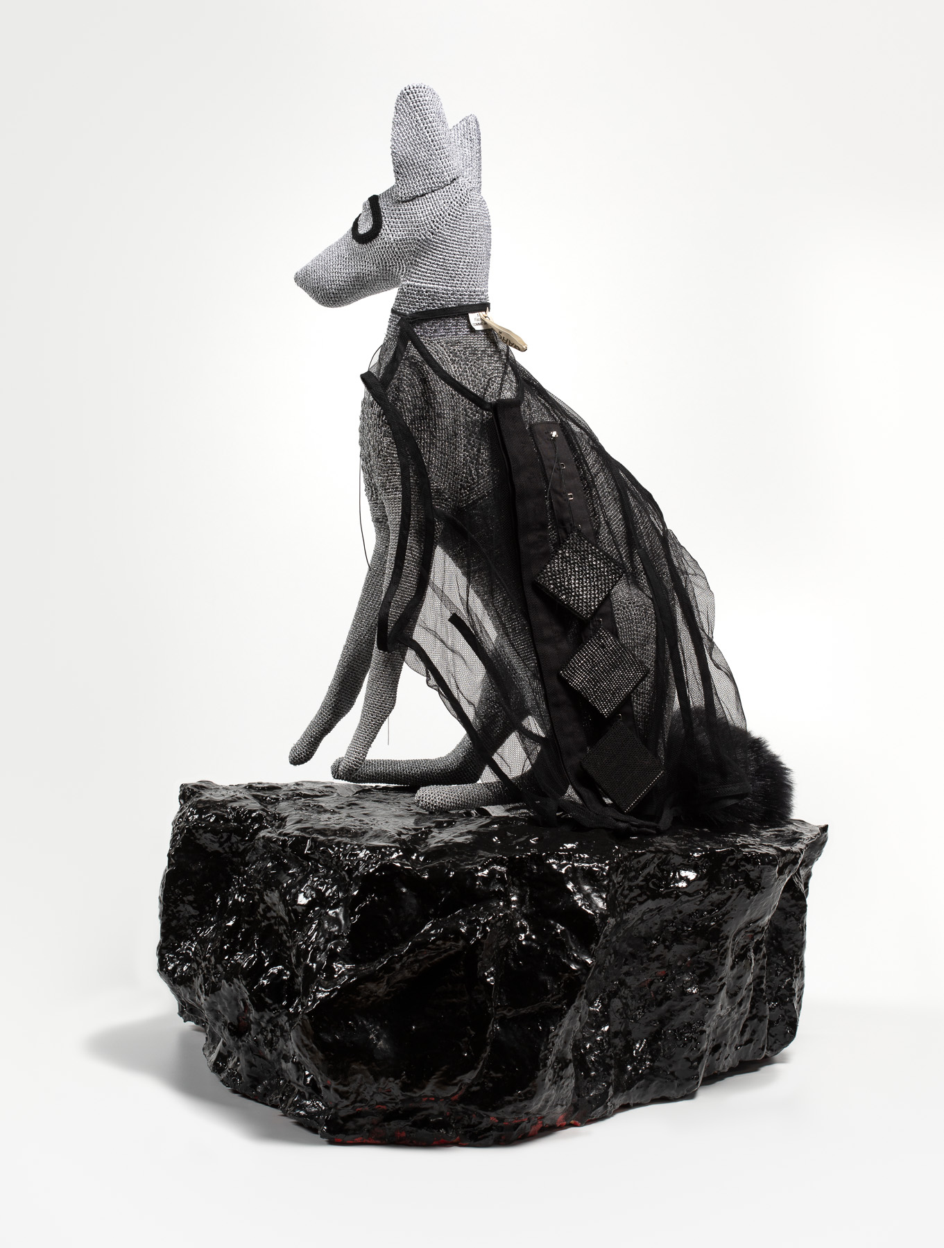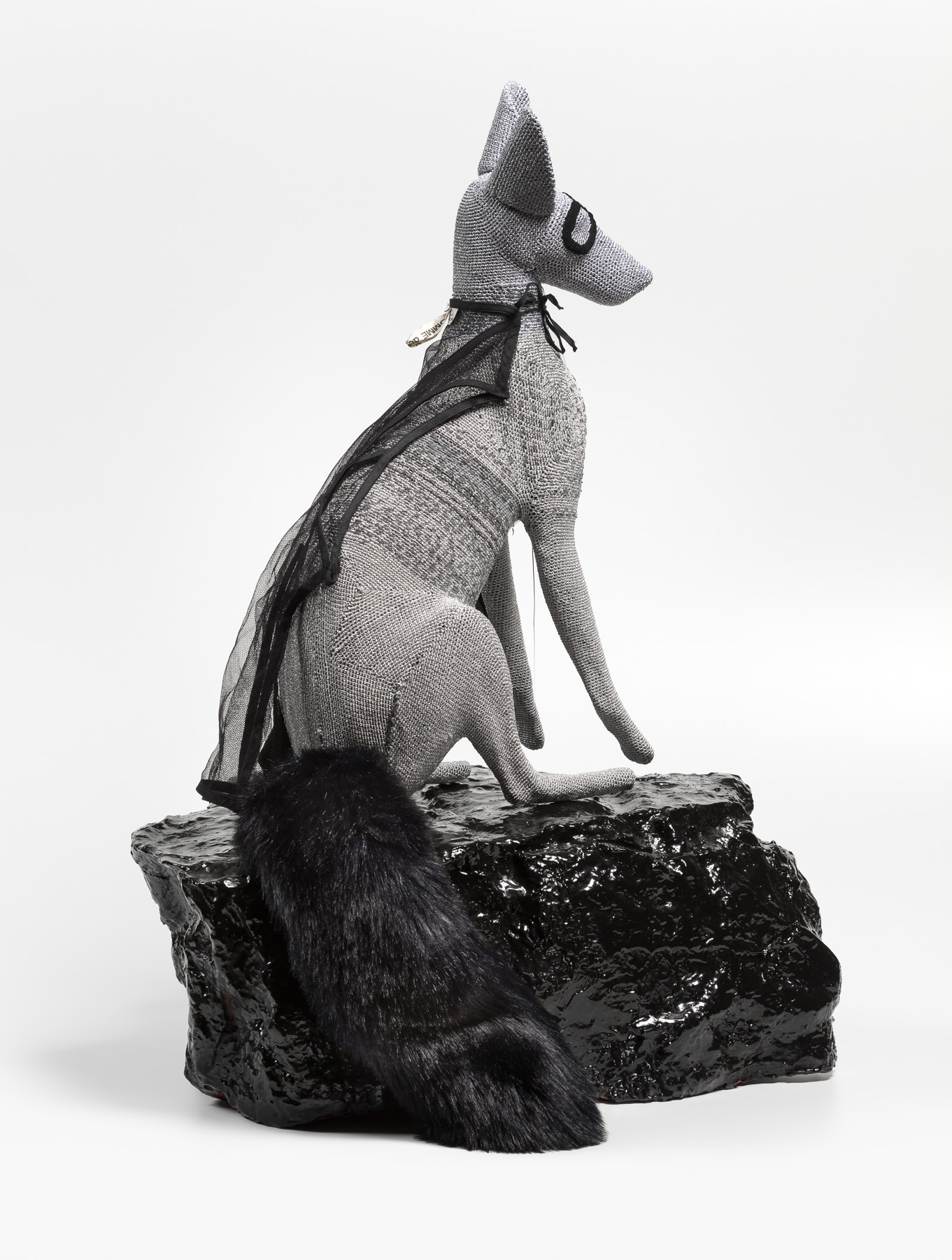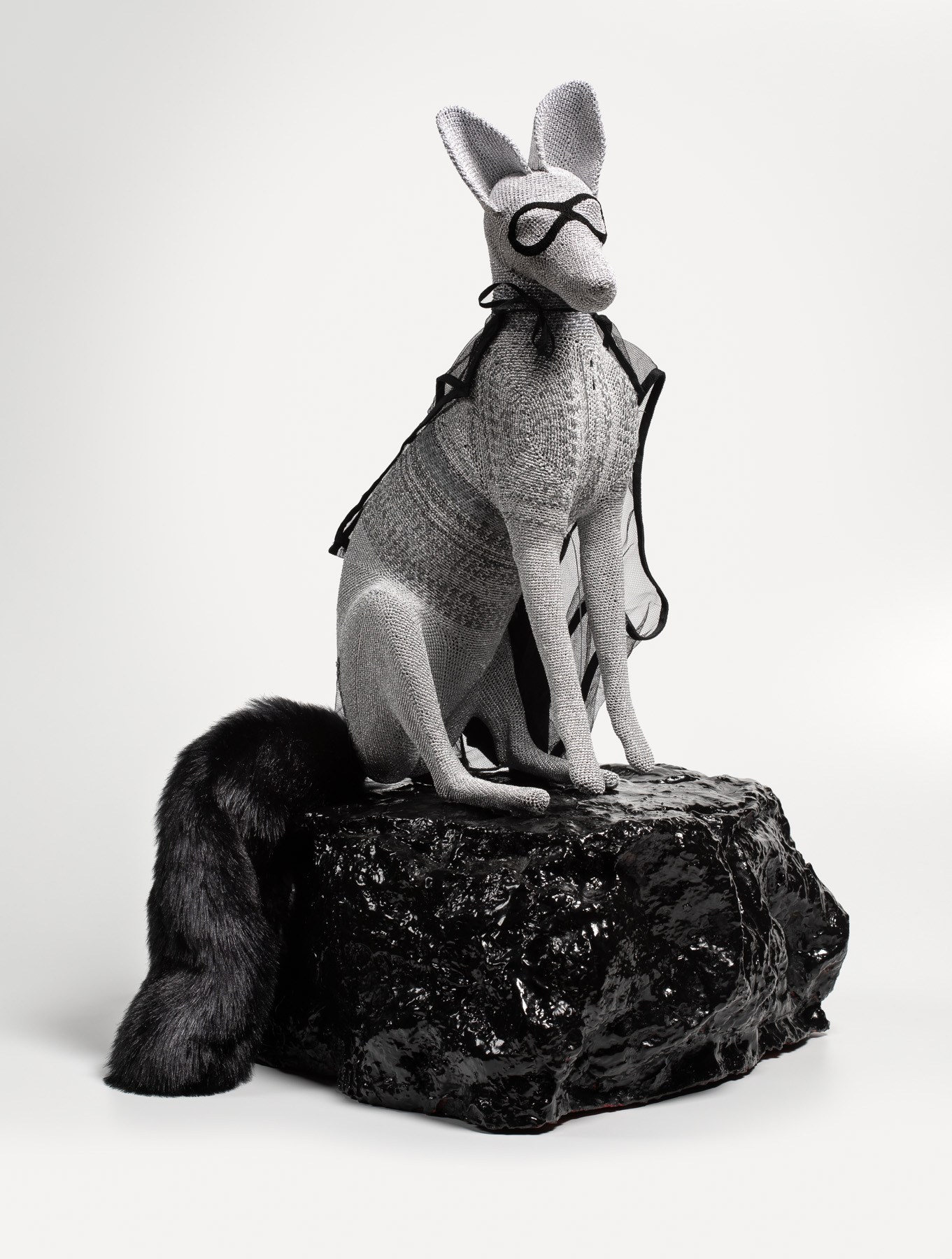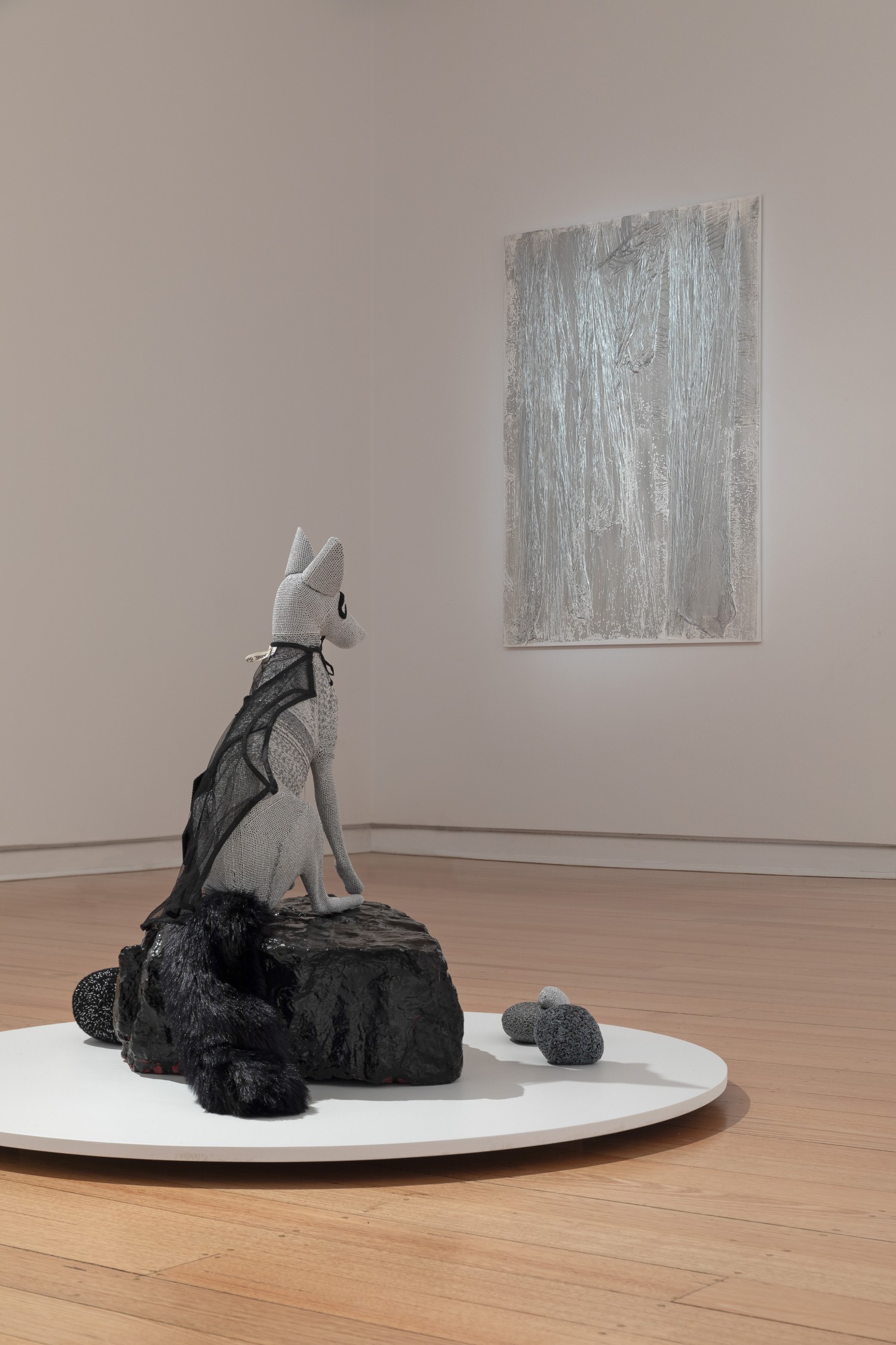 bobcat: hand crocheted lambs wool and cotton embroidery thread over high density foam with silver painted pigskin and aluminium studs recouped from a 1980s Prue Acton garment, carpet, cast resin tree limb and mink: hand crocheted polydamide thread and la
