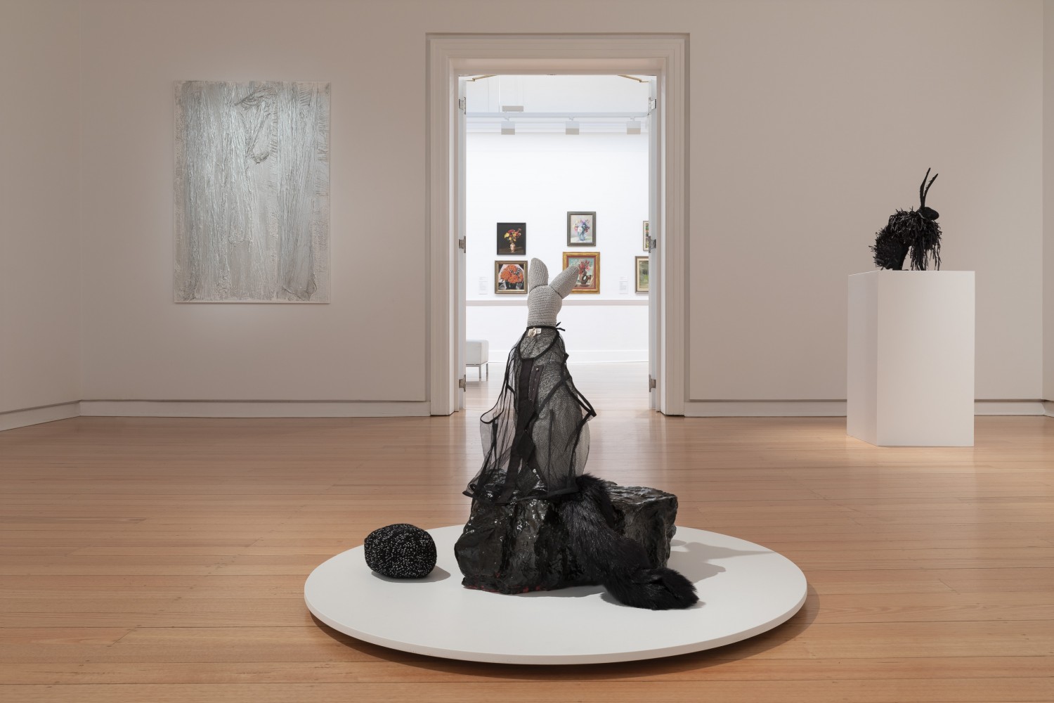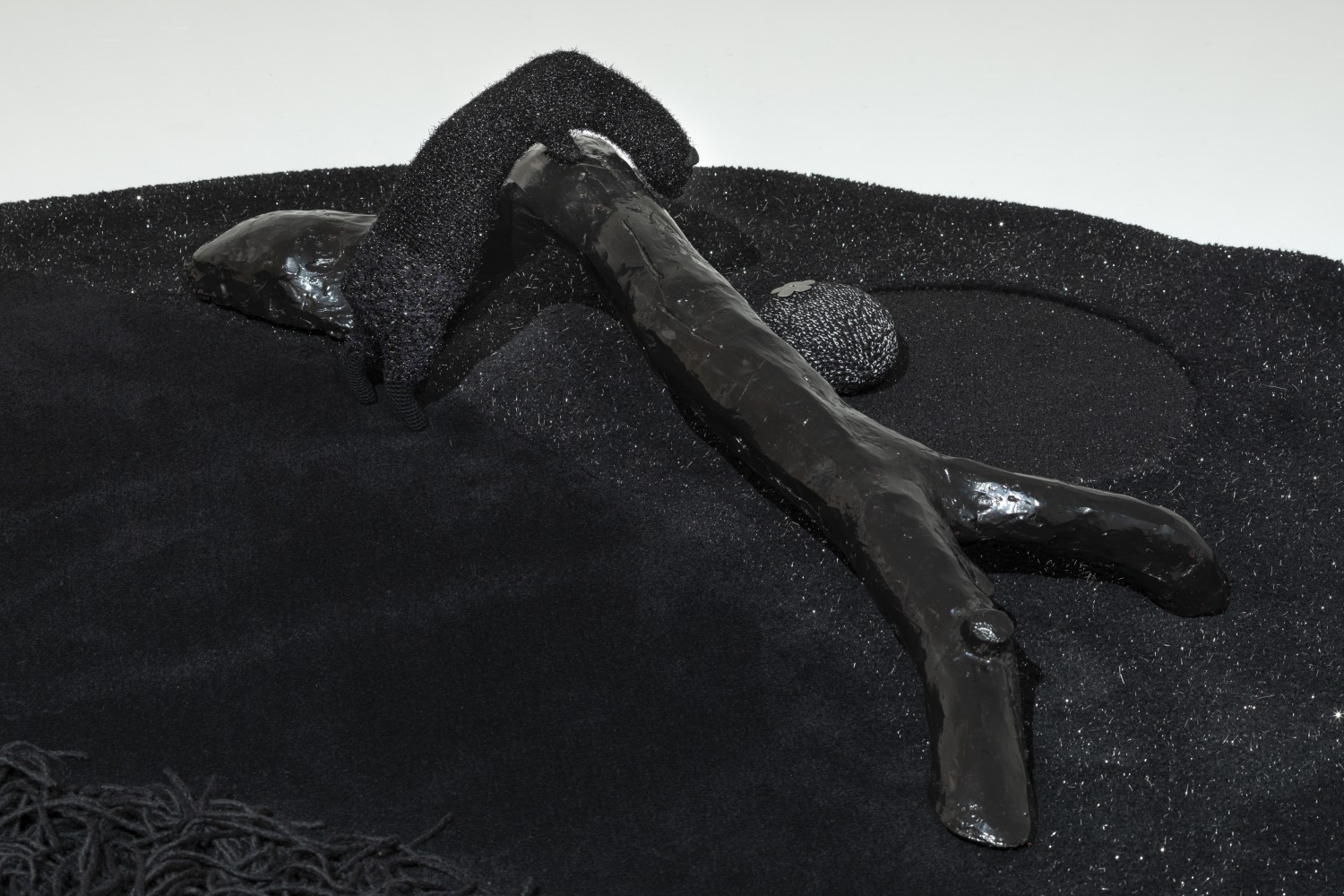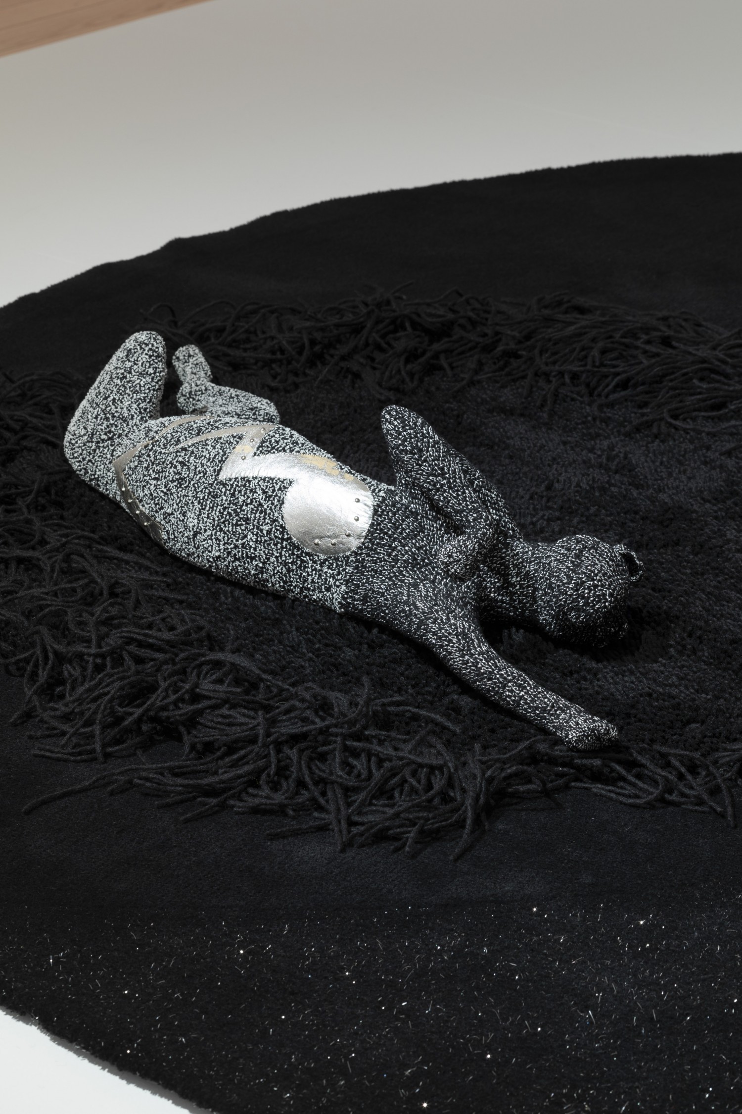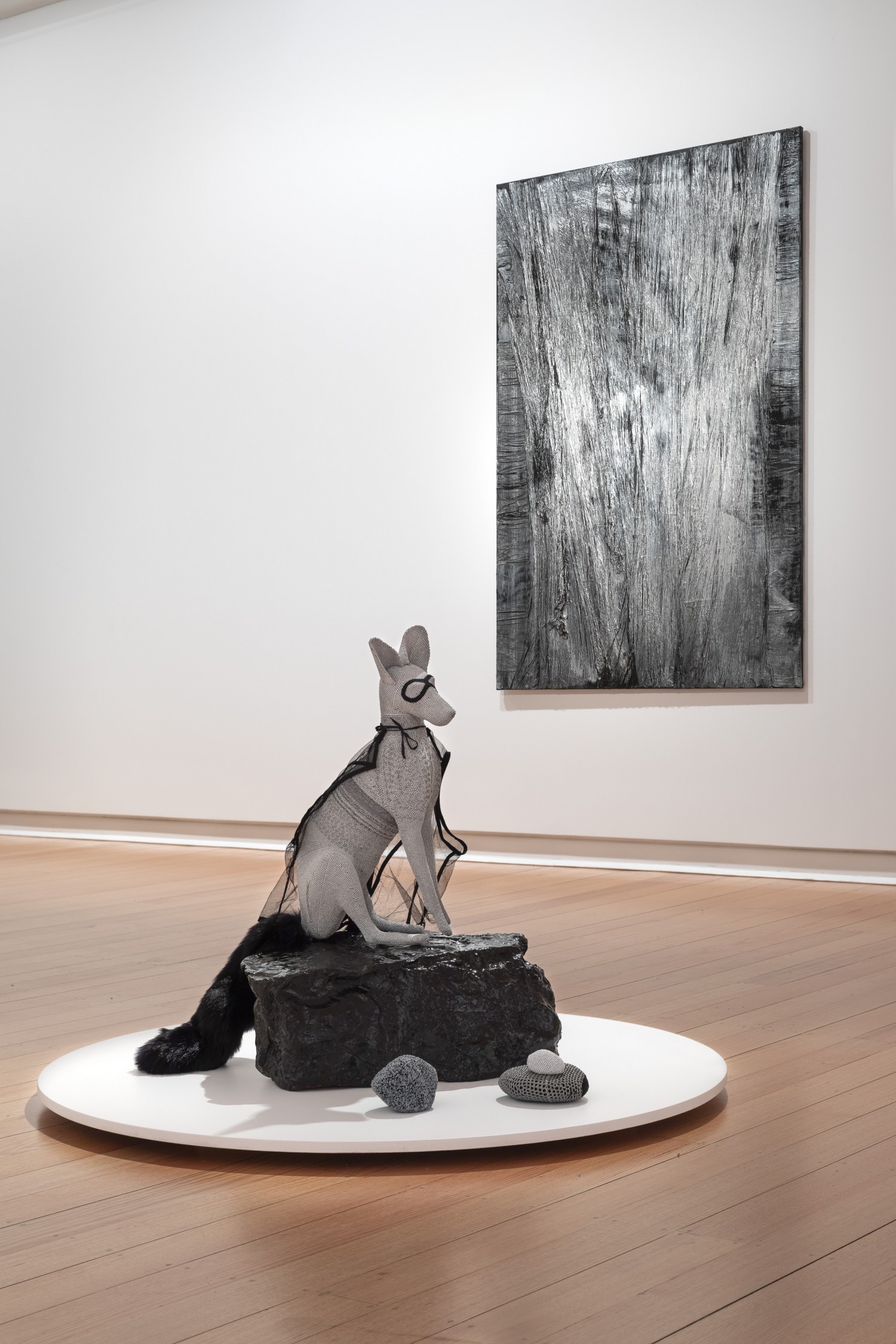bobcat: hand crocheted lambs wool and cotton embroidery thread over high density foam with silver painted pigskin and aluminium studs recouped from a 1980s Prue Acton garment, carpet, cast resin tree limb and mink: hand crocheted polydamide thread and la