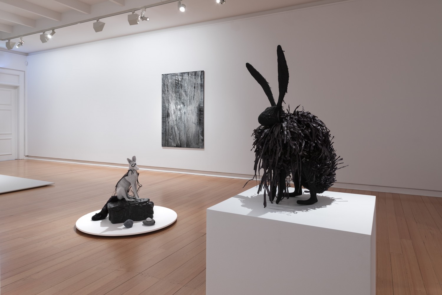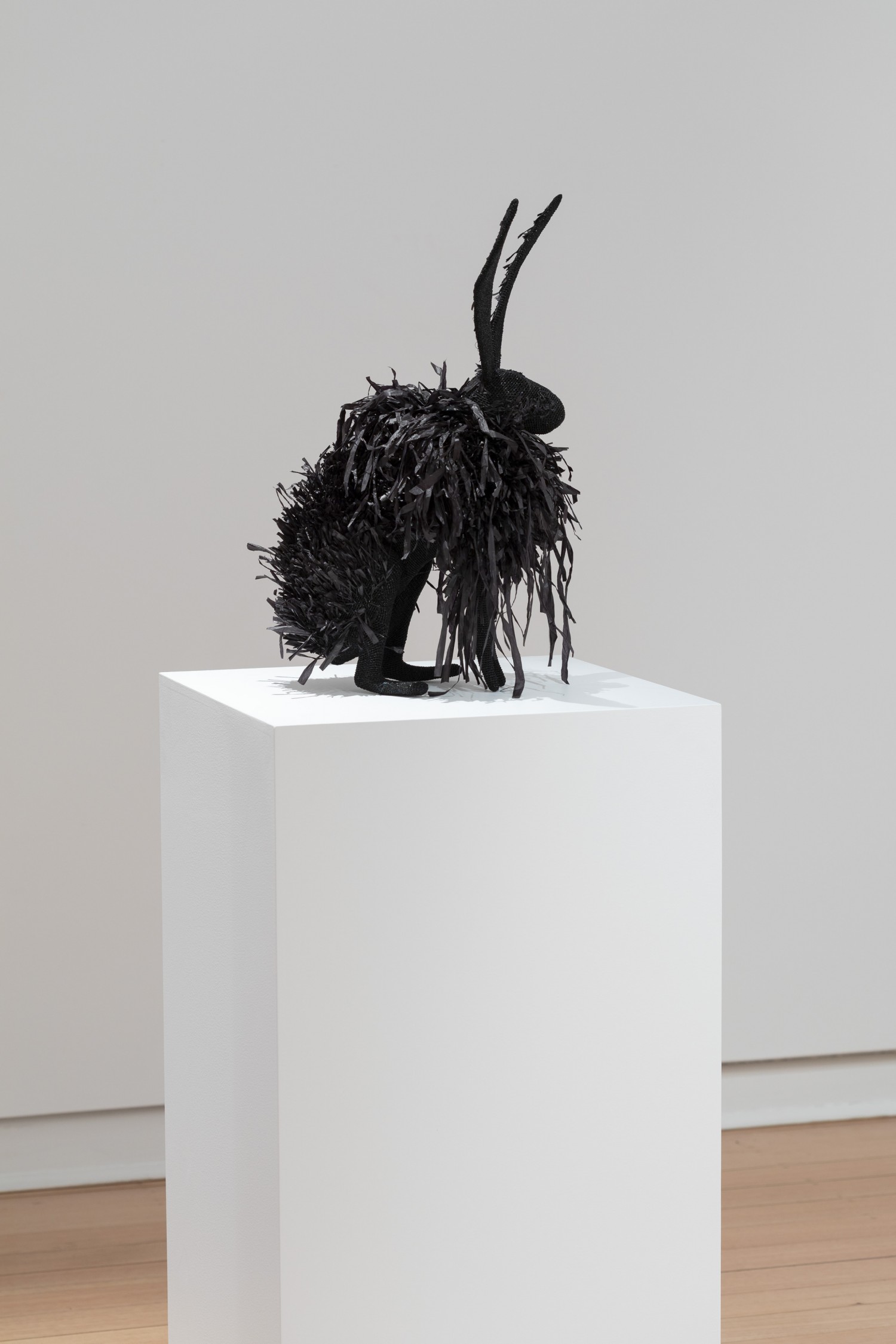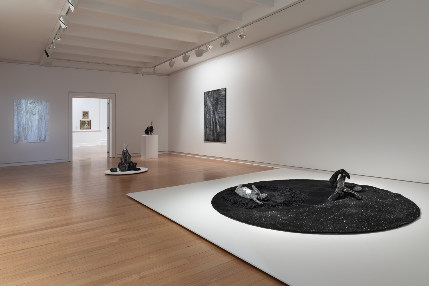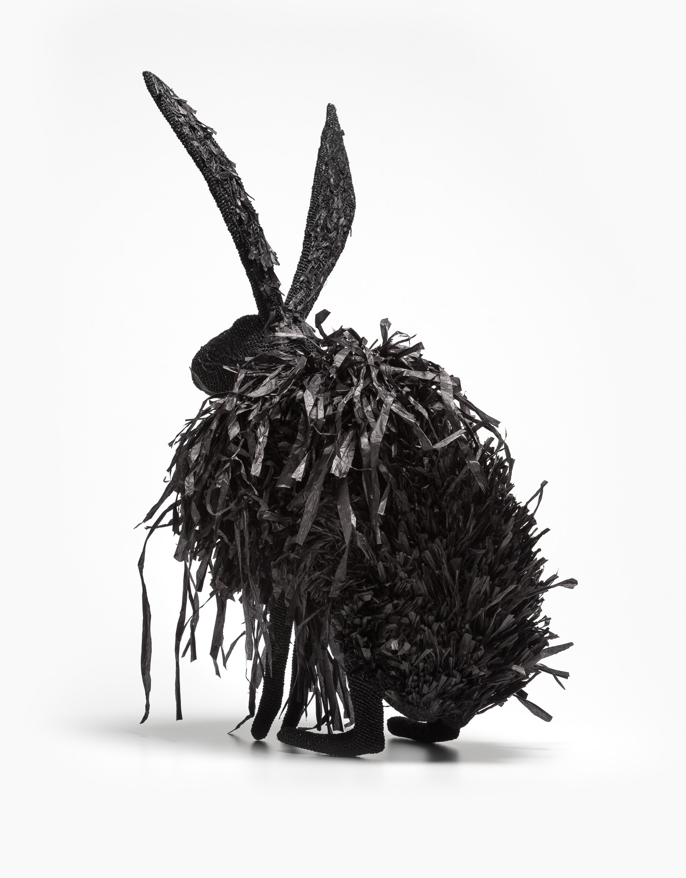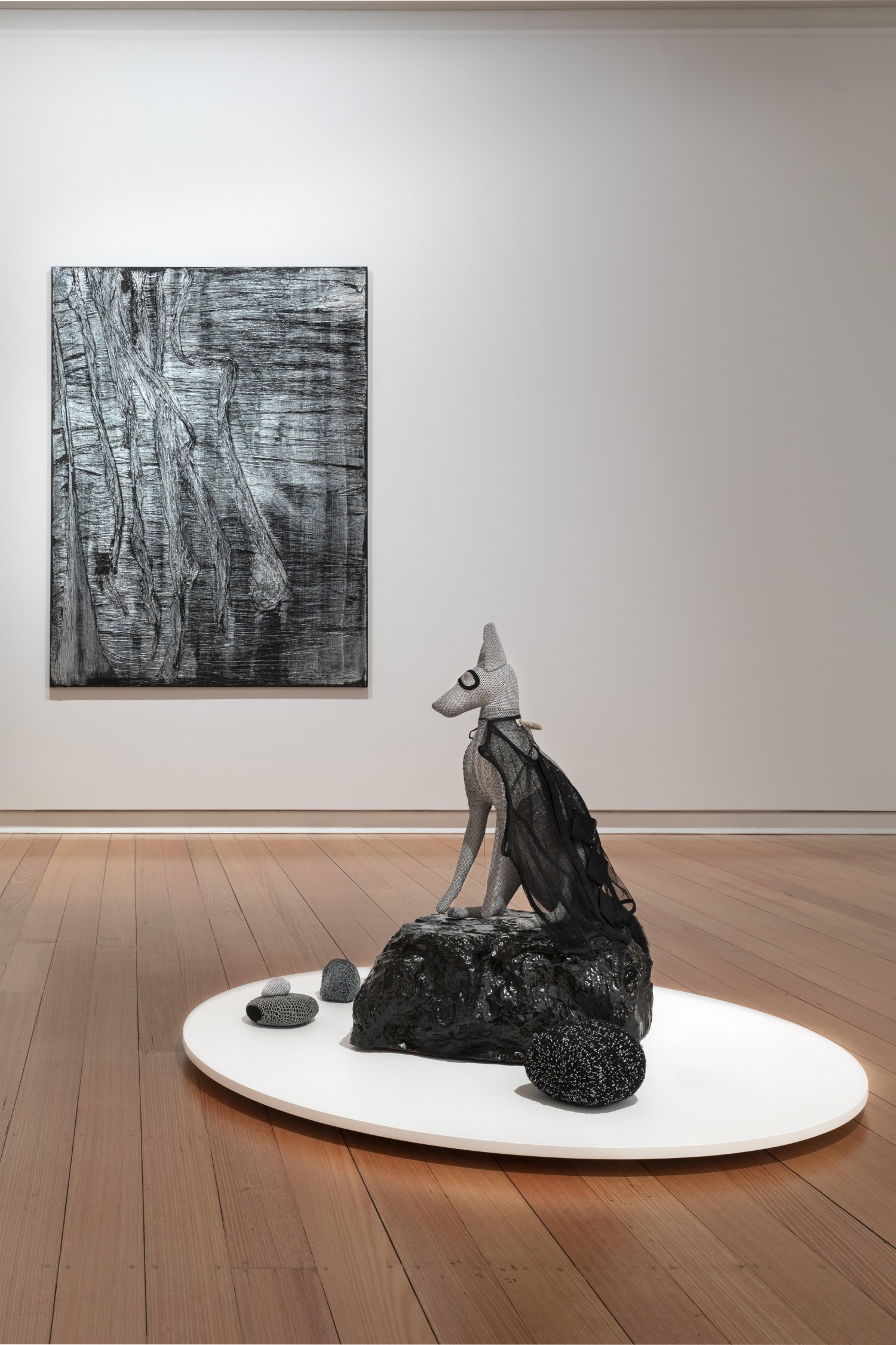 bobcat: hand crocheted lambs wool and cotton embroidery thread over high density foam with silver painted pigskin and aluminium studs recouped from a 1980s Prue Acton garment, carpet, cast resin tree limb and mink: hand crocheted polydamide thread and la