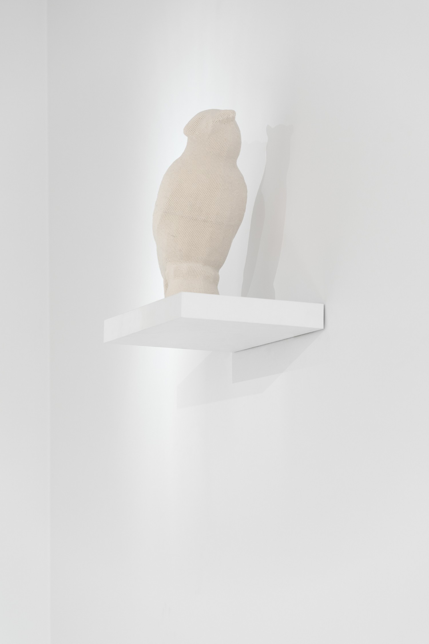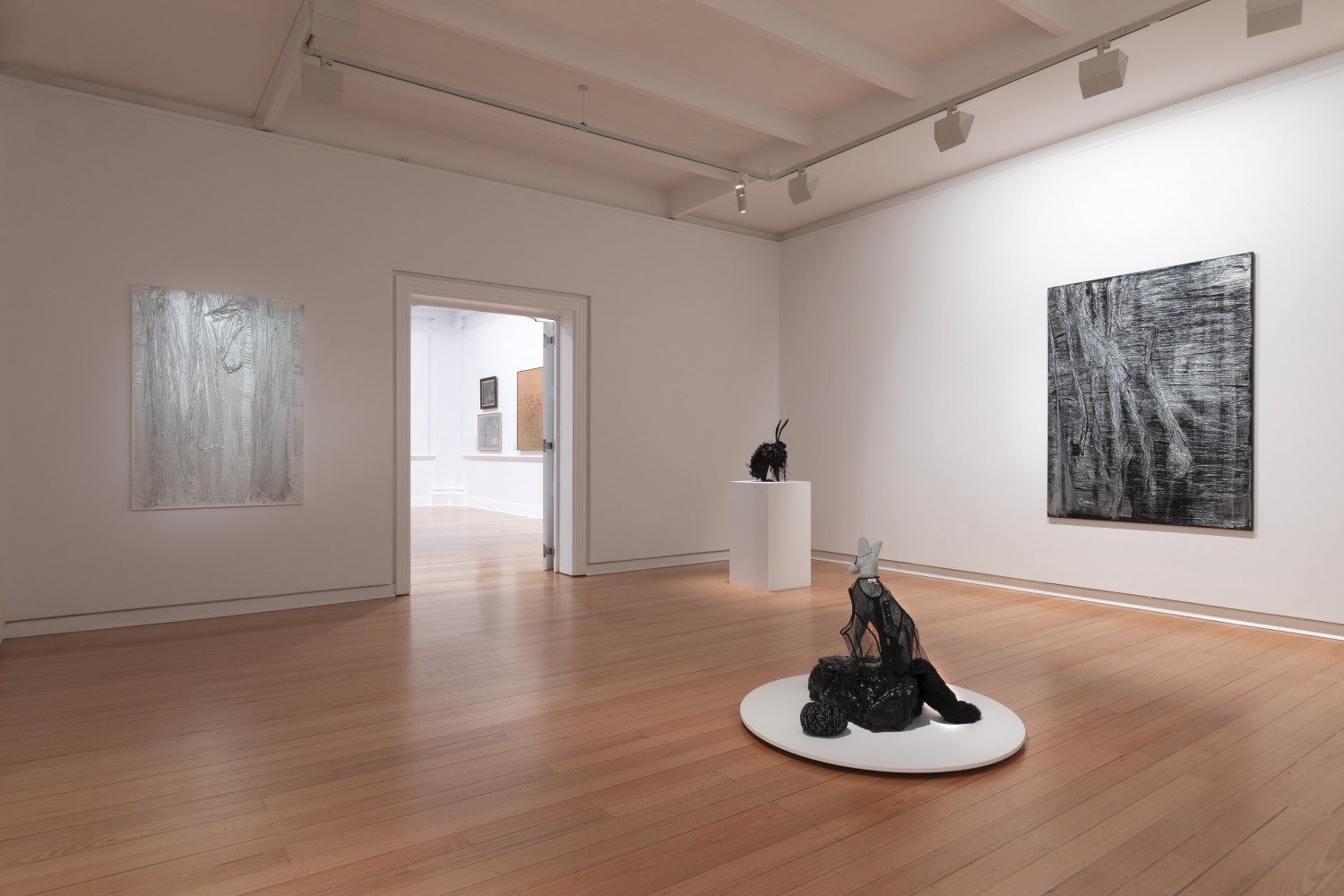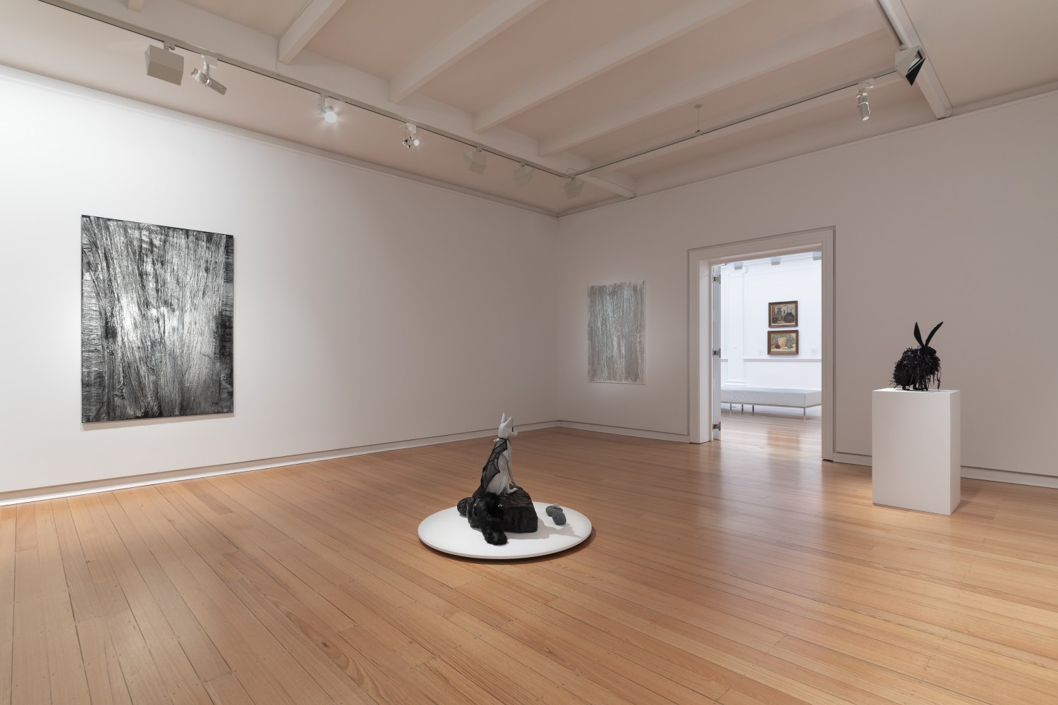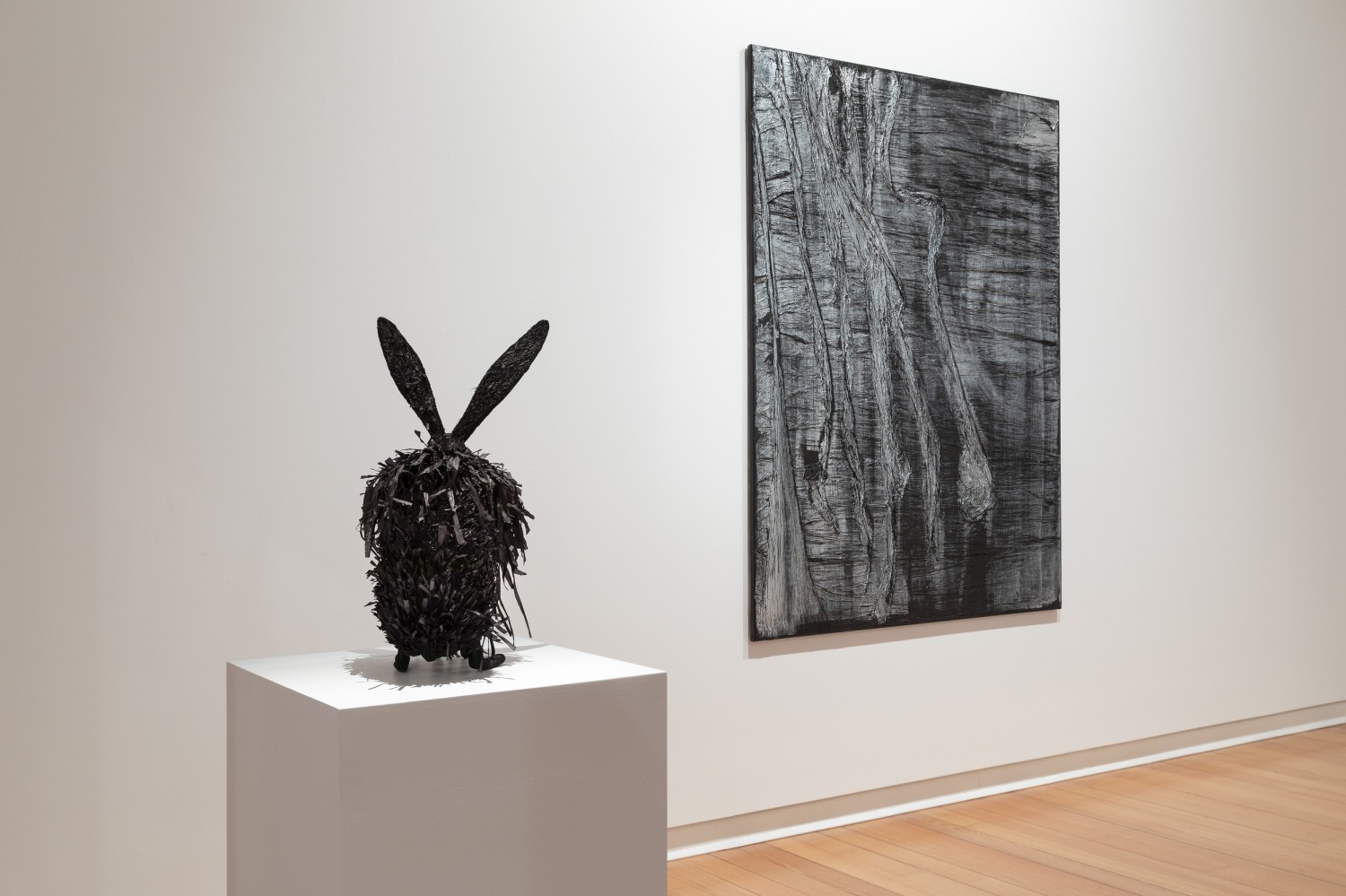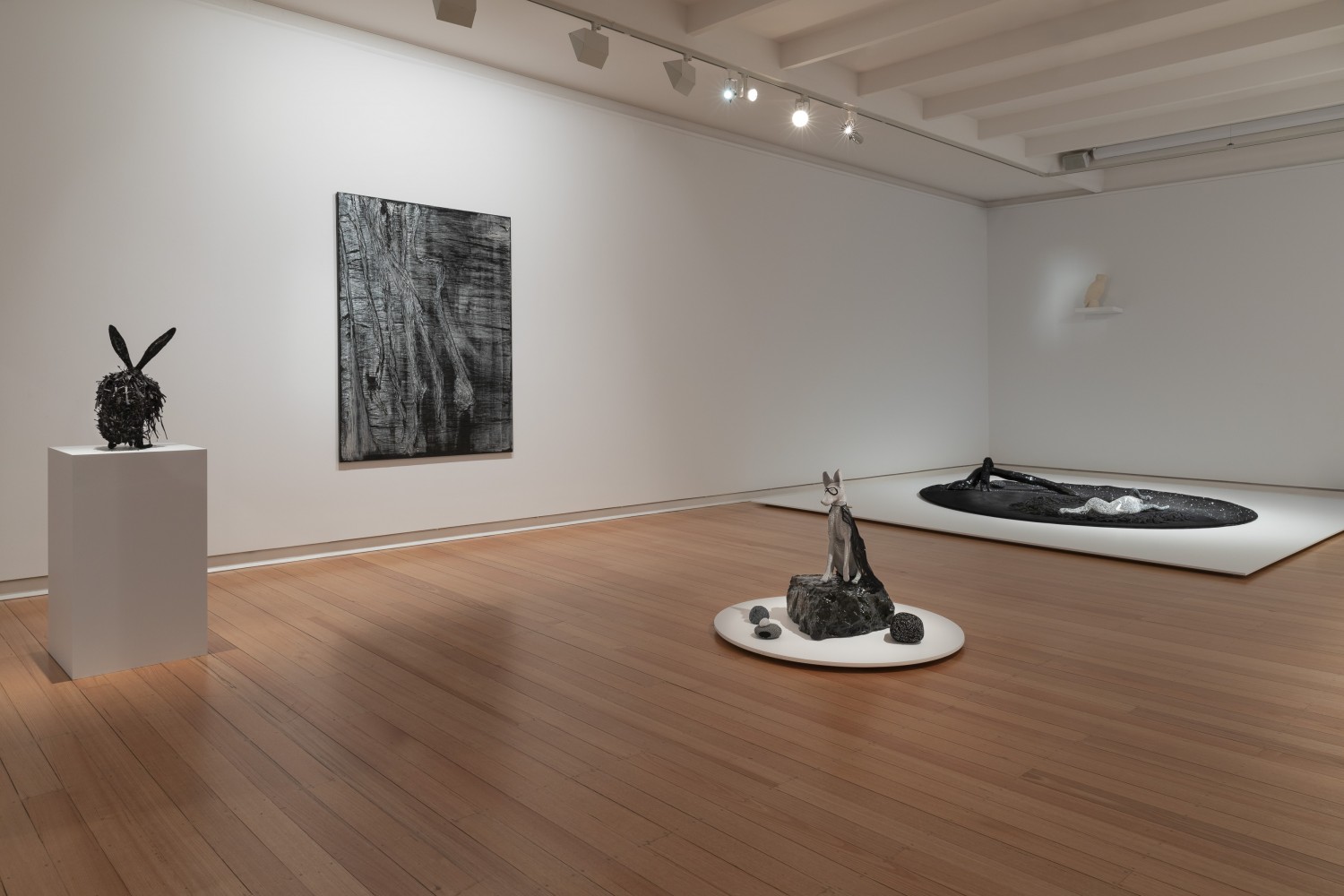 bobcat: hand crocheted lambs wool and cotton embroidery thread over high density foam with silver painted pigskin and aluminium studs recouped from a 1980s Prue Acton garment, carpet, cast resin tree limb and mink: hand crocheted polydamide thread and la
